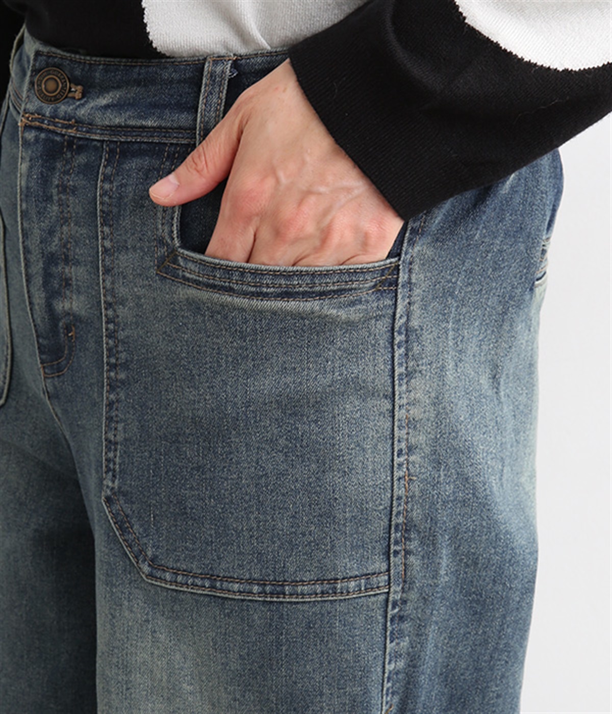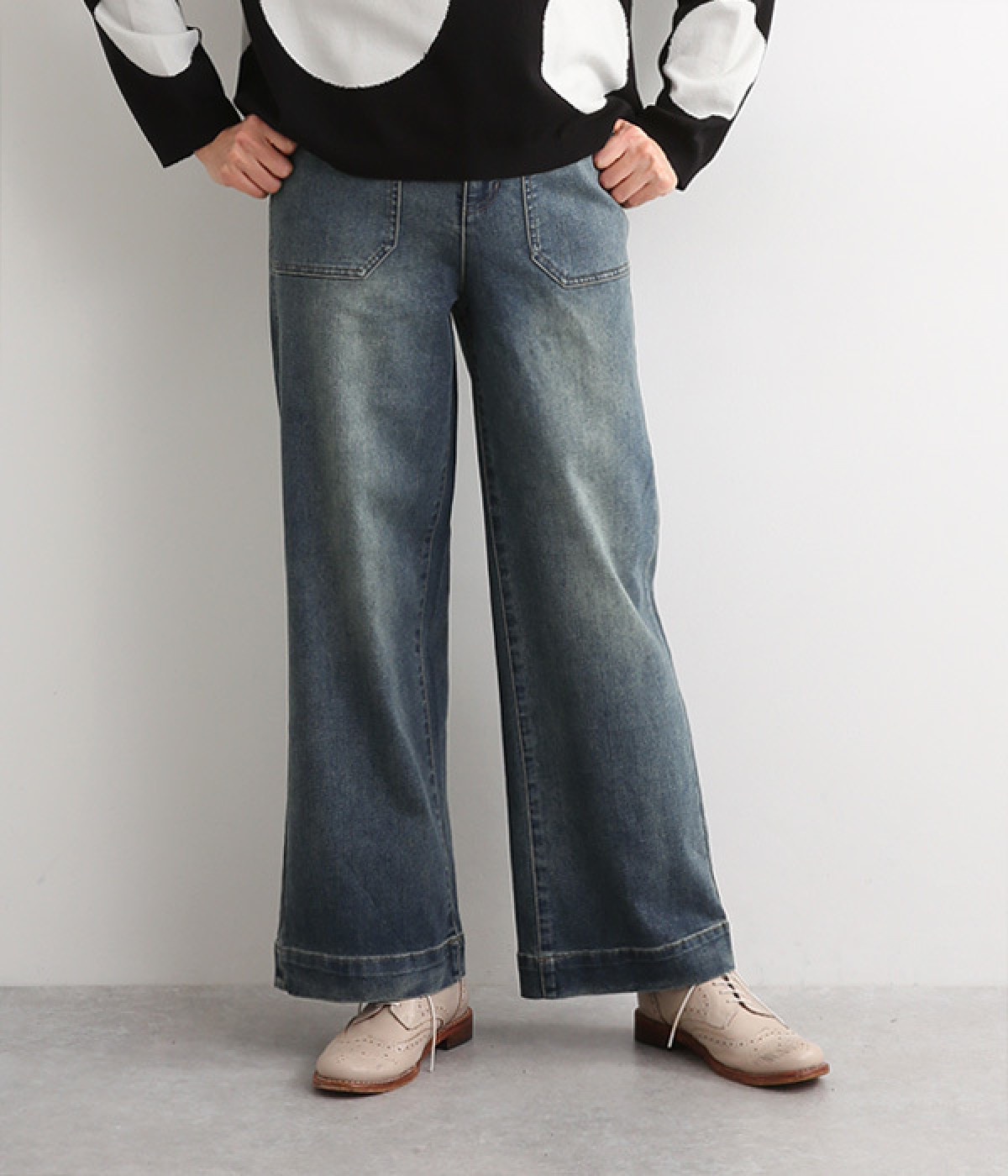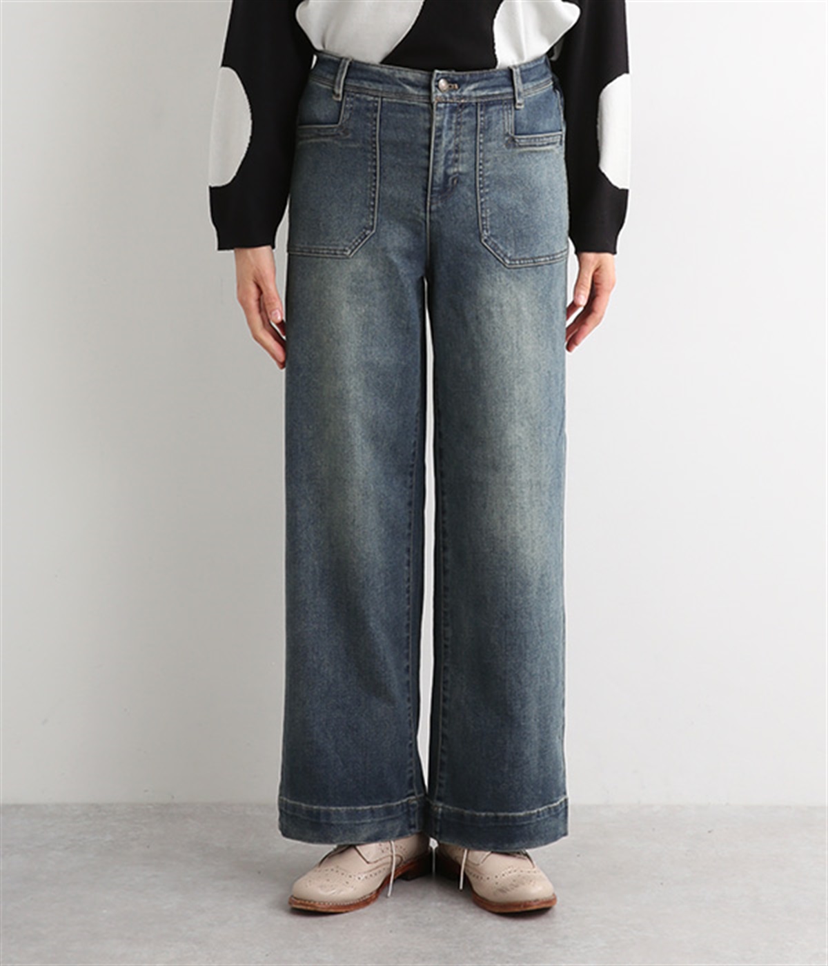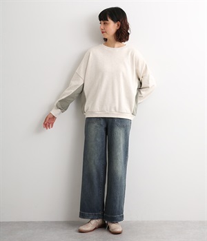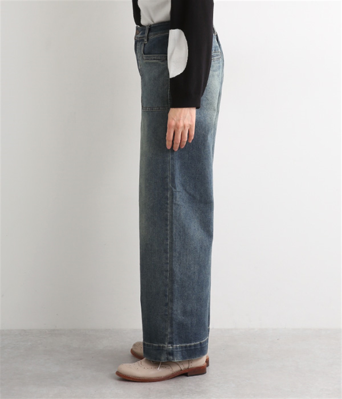 すとんと落ちるワイドなストレートシルエットがこなれ感を漂わせるデニムパンツ。ステッチが映えるフロントの大きなポケットがアクセントです。合わせるトップスを選びにくいほどよいボリューム感が◎。ウエストは後ろのみゴムを入れました。