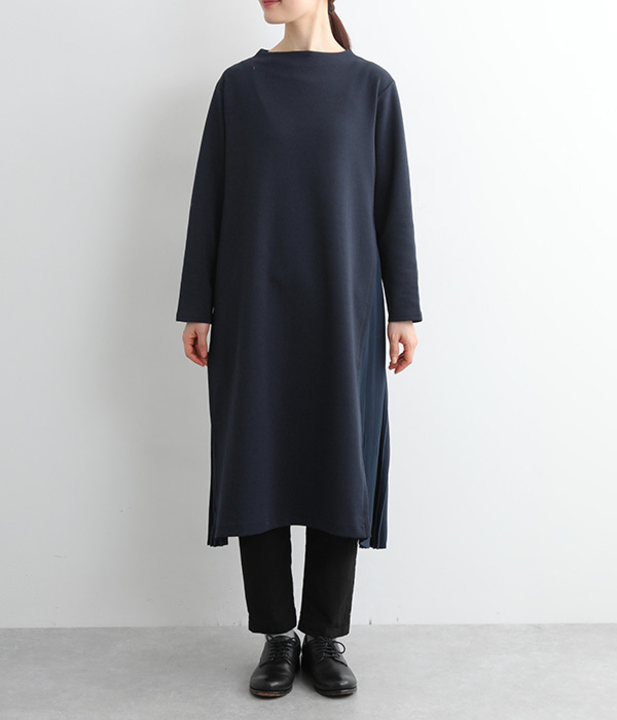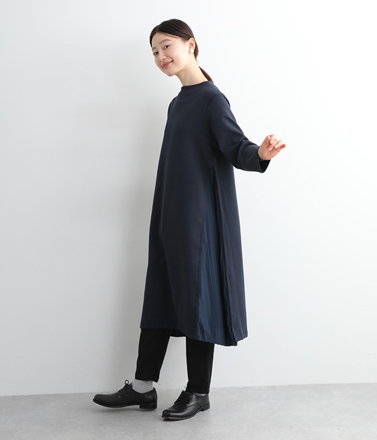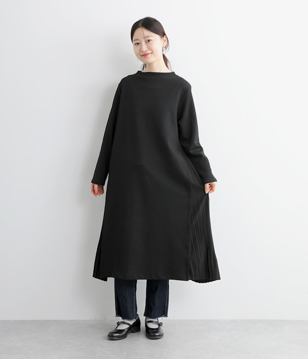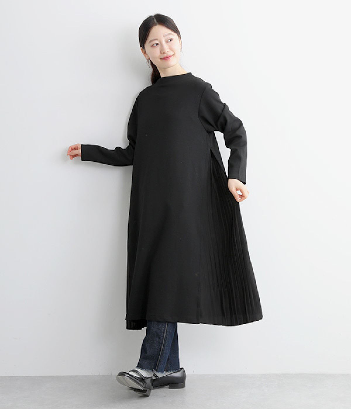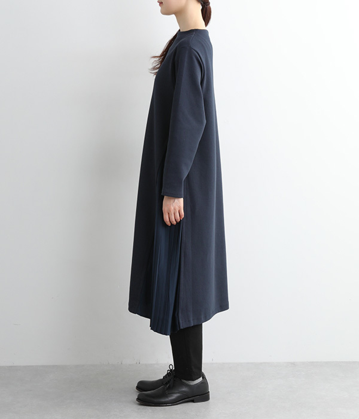 両サイドから大きく切り替えた異素材プリーツが特徴