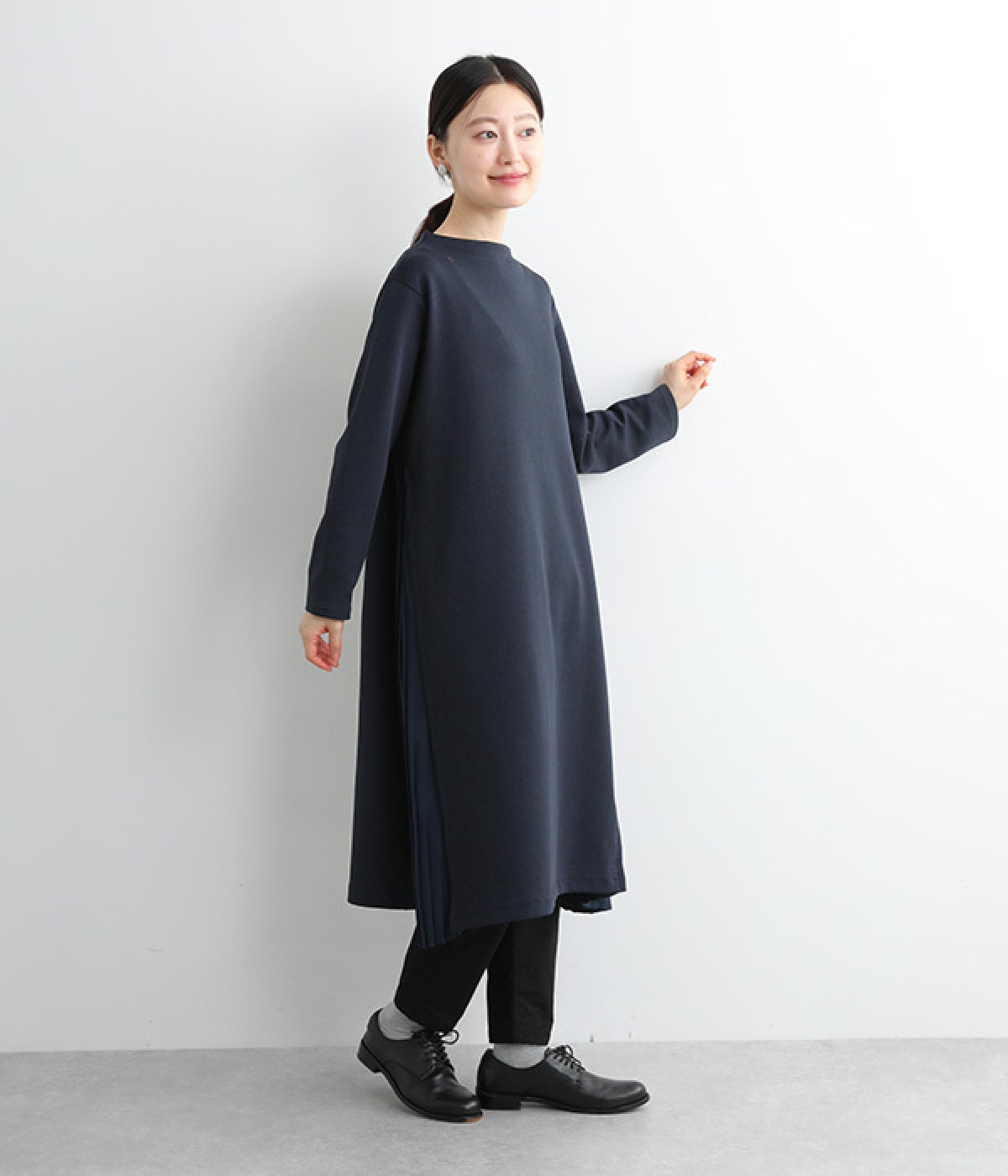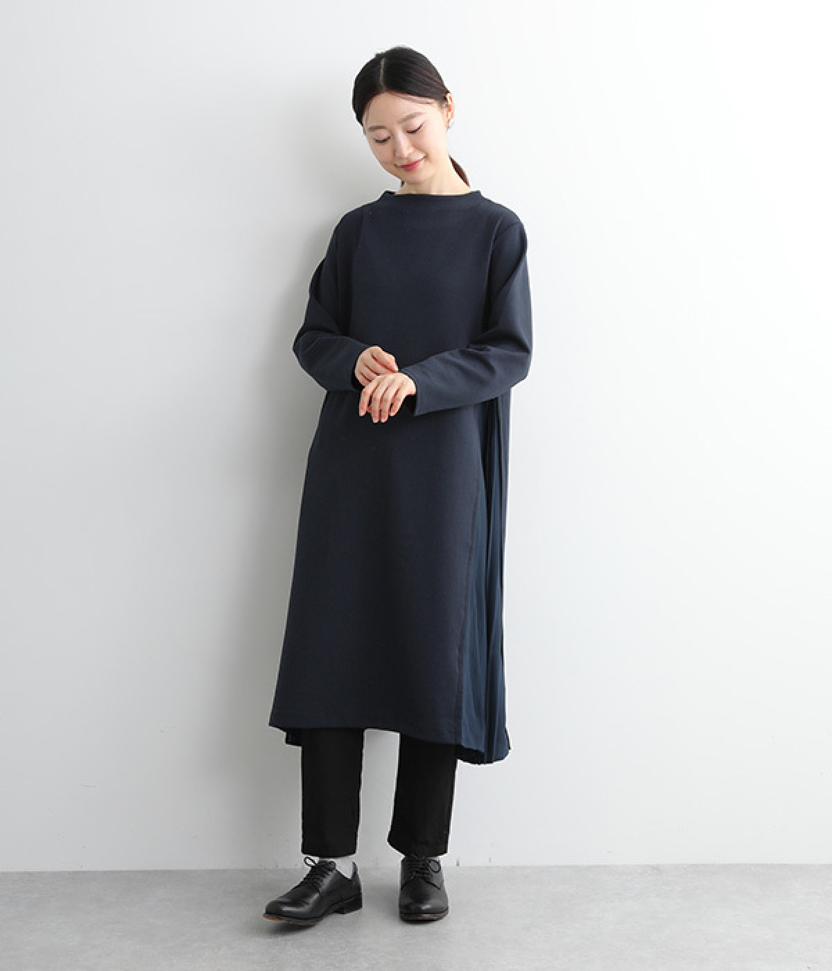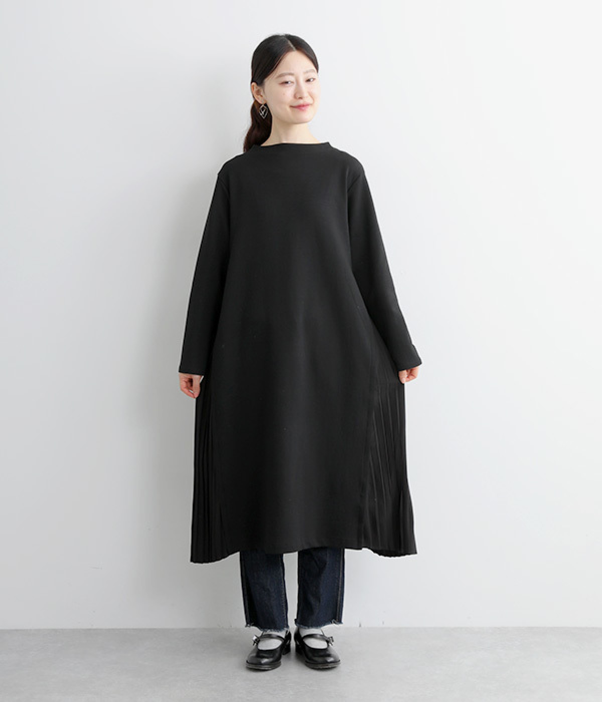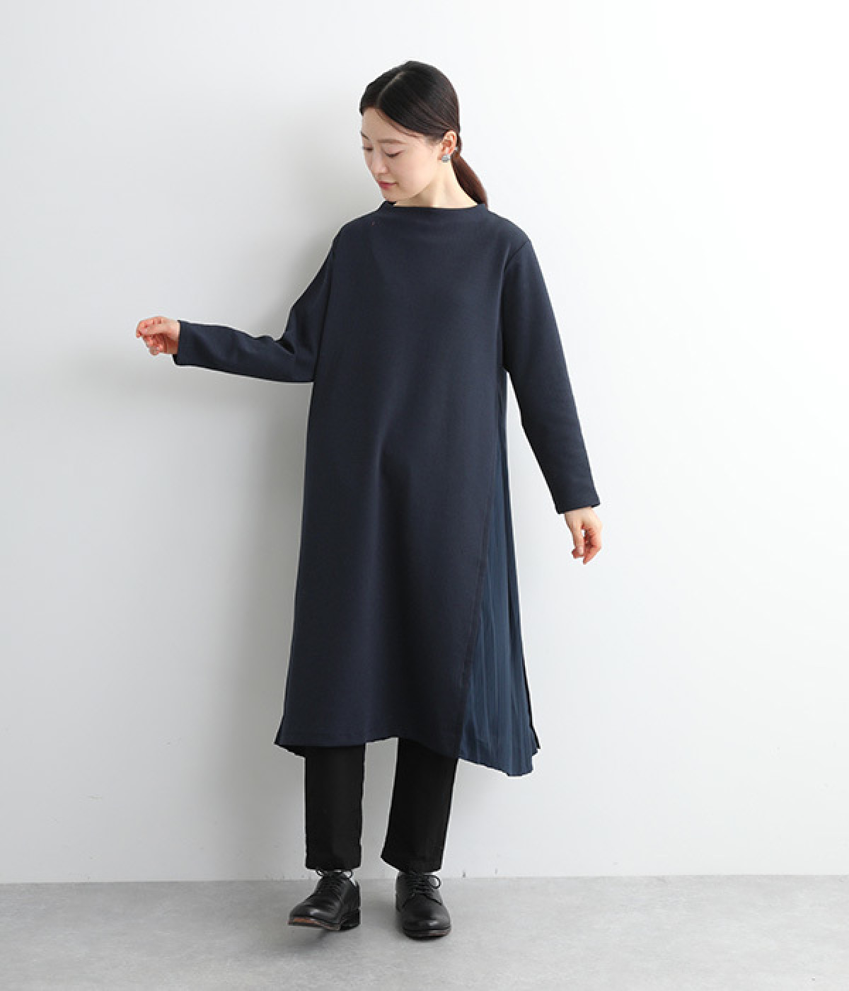 両サイドから大きく切り替えた異素材プリーツが特徴