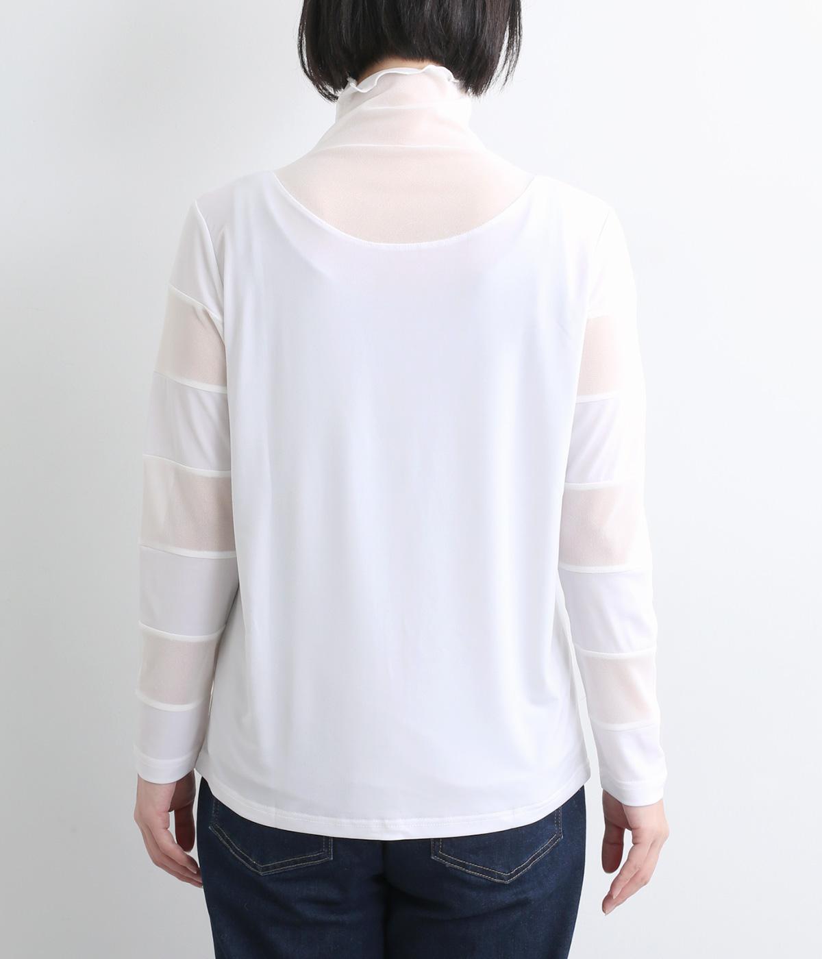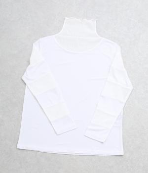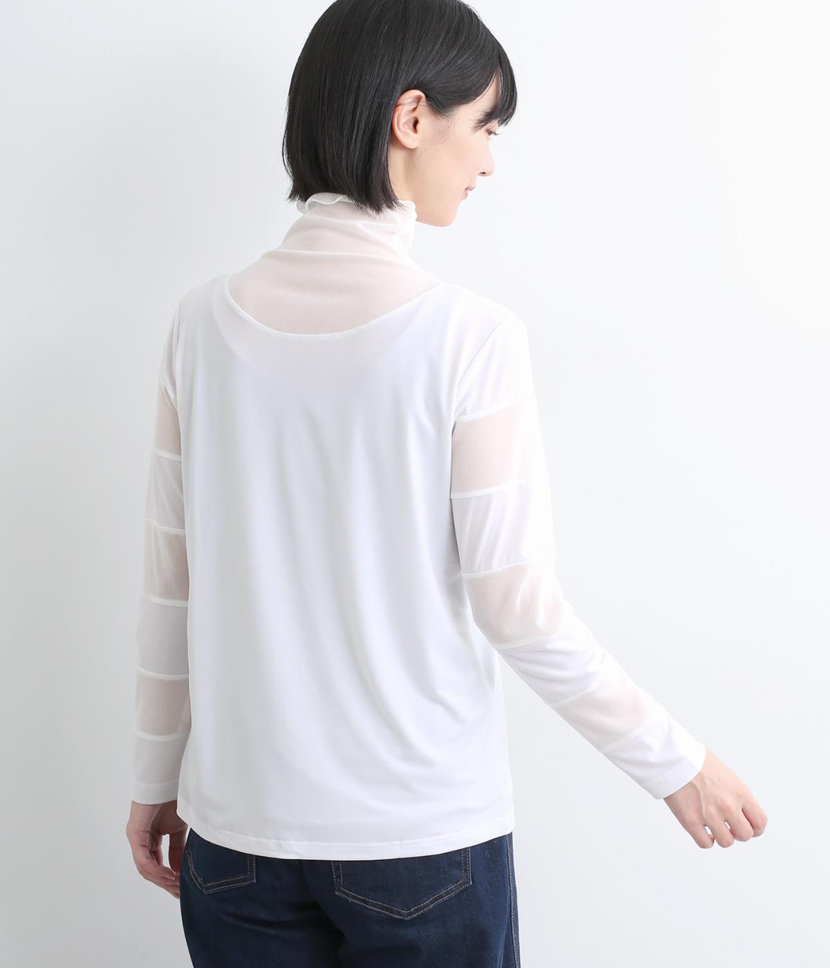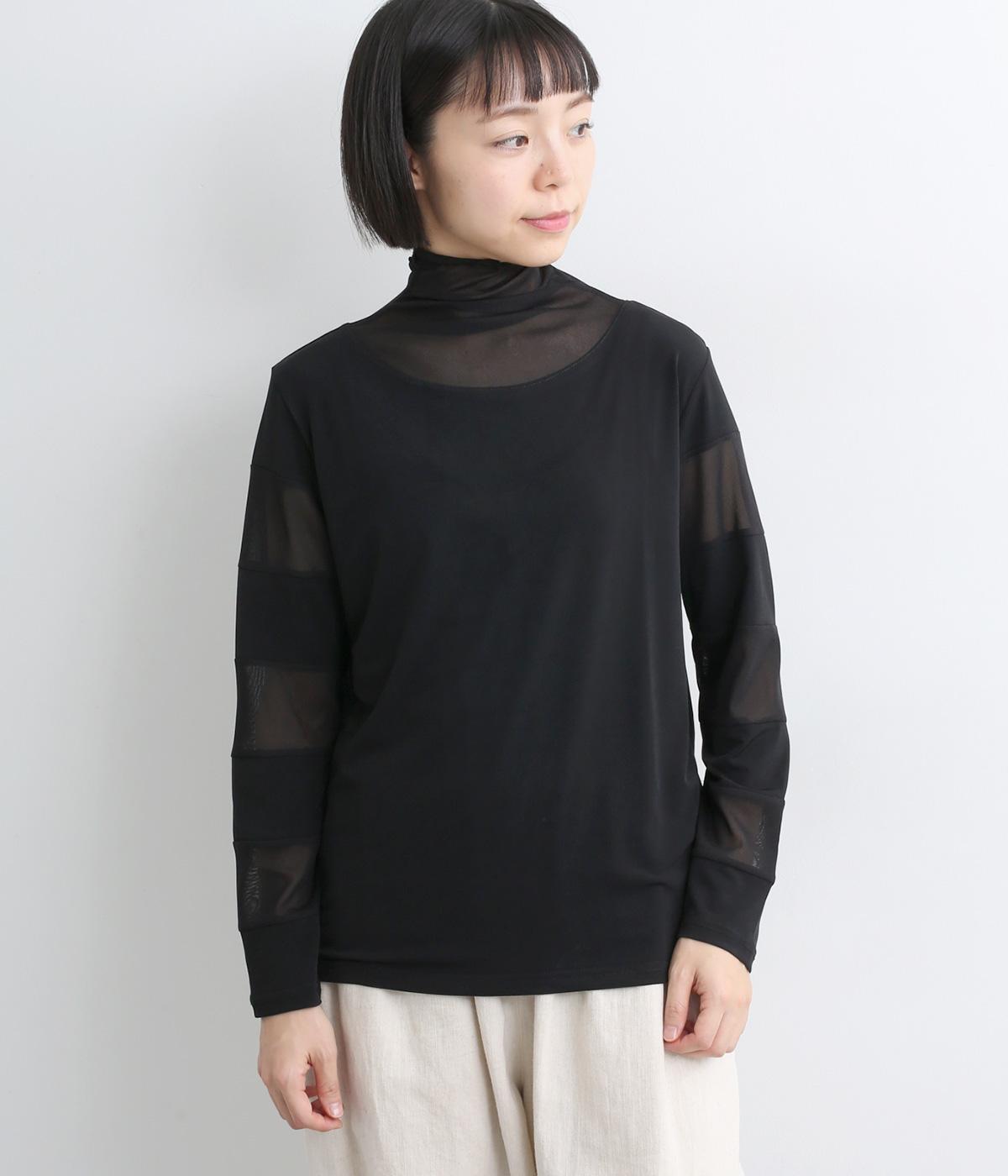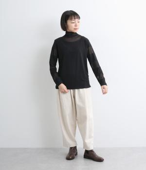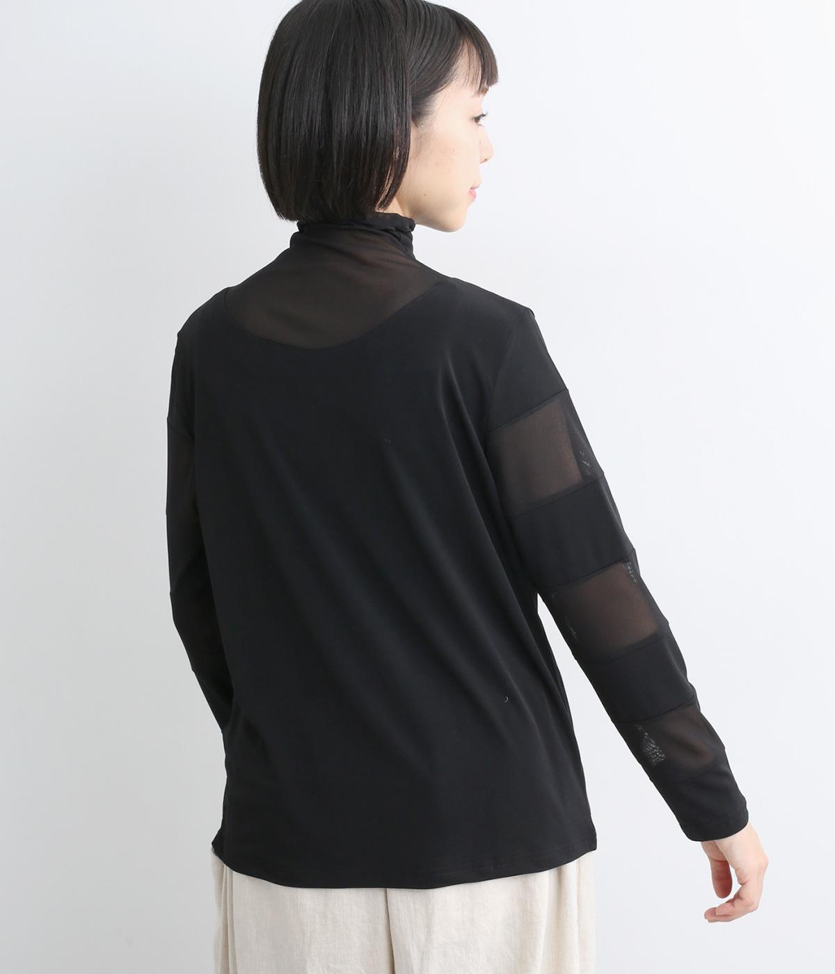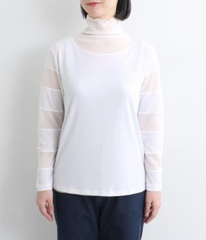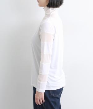 襟ぐりと袖にボーダー状に切り替えたシアー素材がポイント。部分的にシアー感を出すことで合わせるインナーに迷いにくく、きれいめにもカジュアルにも合わせやすい絶妙なバランスに仕上げました。ベストなどとのレイヤードにも最適で、着まわしのきく一枚です。