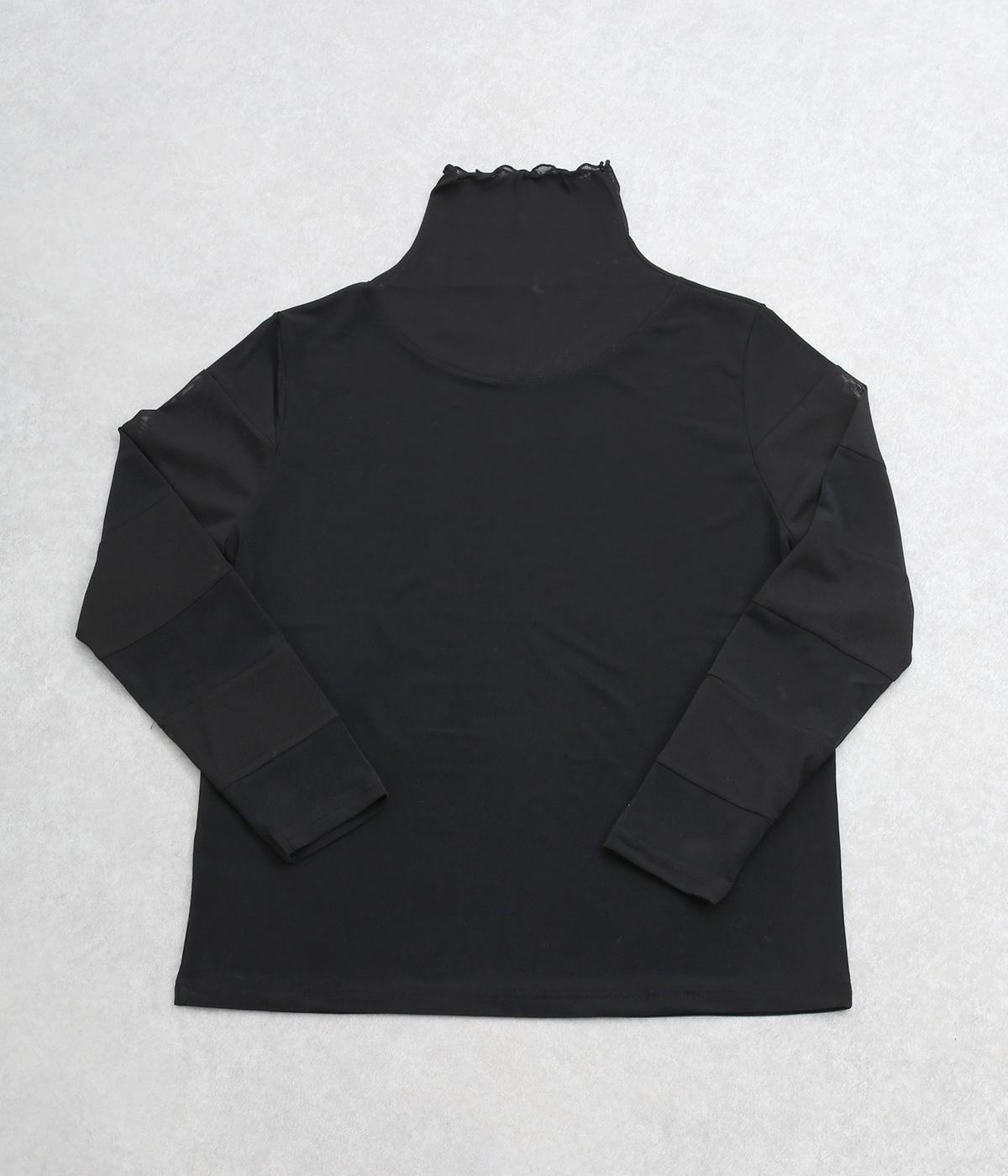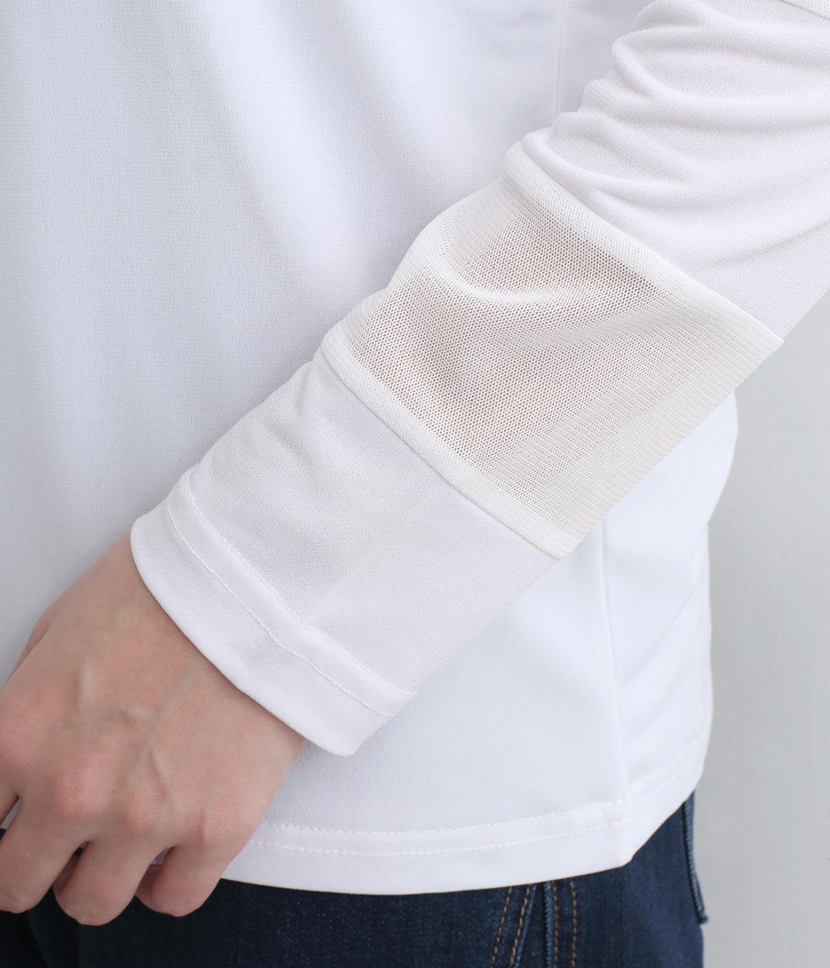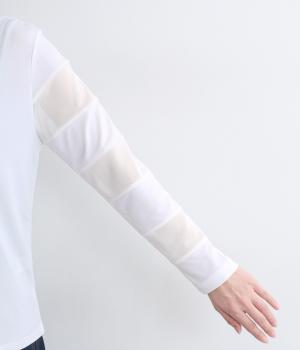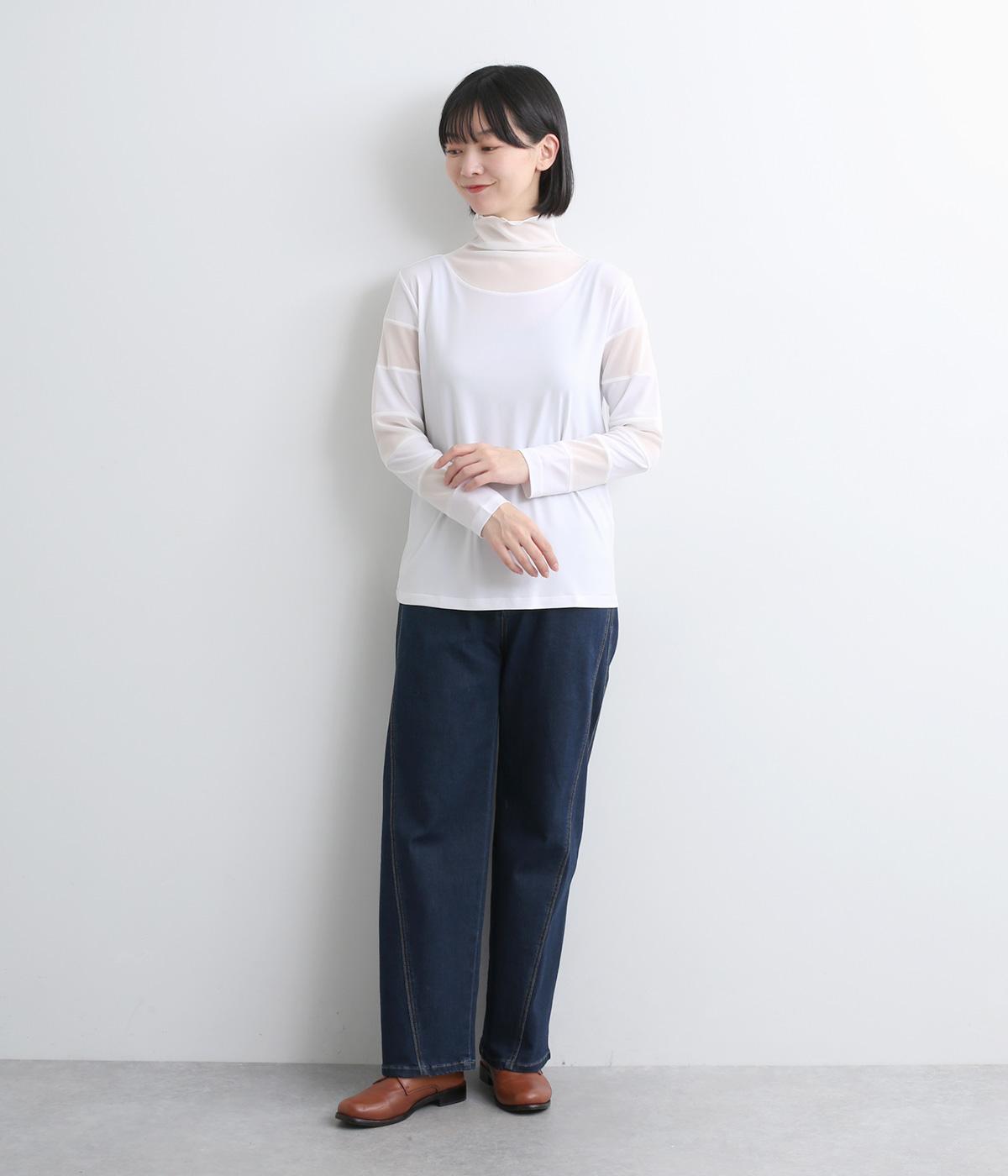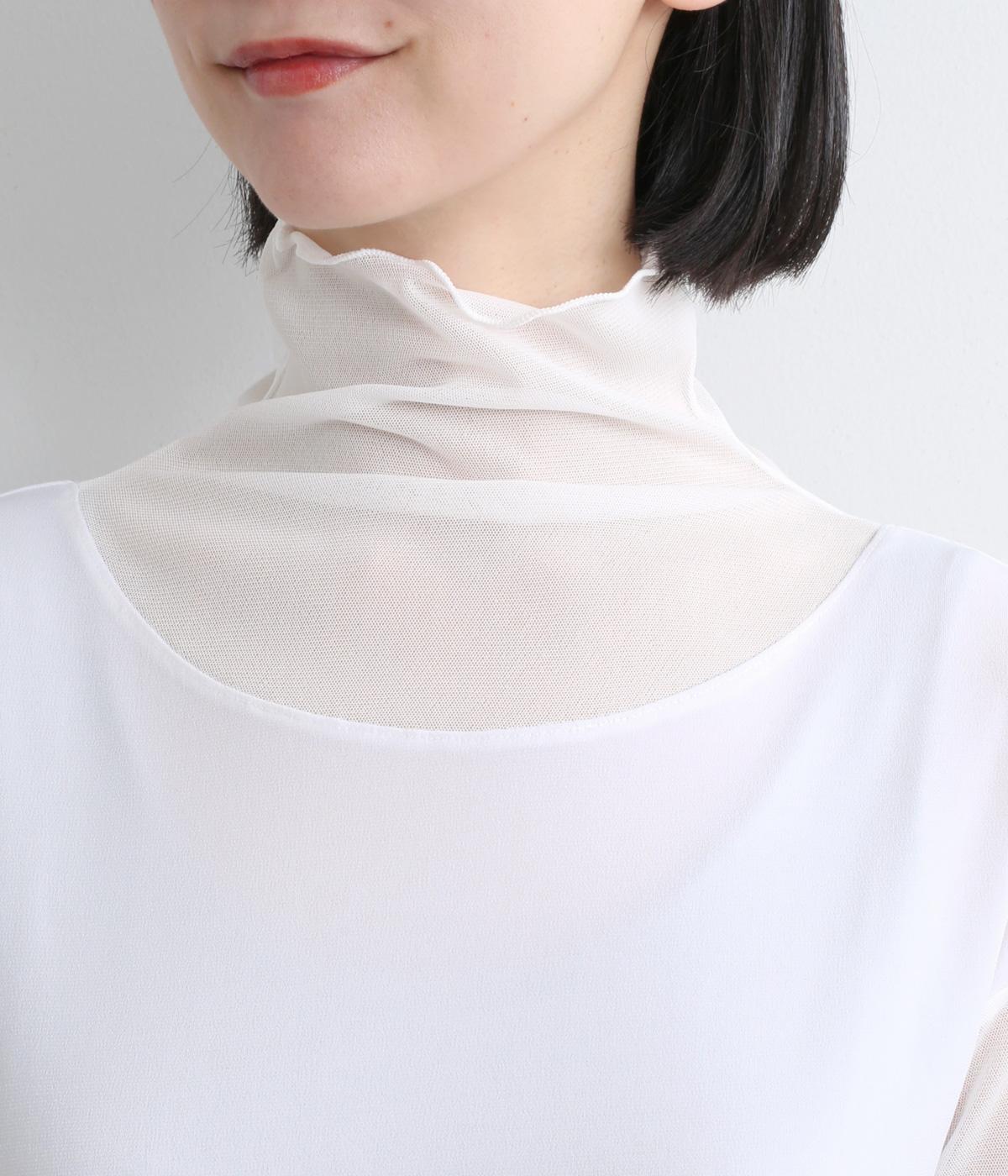 襟ぐりと袖にボーダー状に切り替えたシアー素材がポイント。部分的にシアー感を出すことで合わせるインナーに迷いにくく、きれいめにもカジュアルにも合わせやすい絶妙なバランスに仕上げました。ベストなどとのレイヤードにも最適で、着まわしのきく一枚です。
