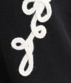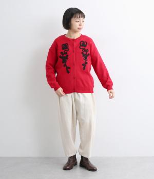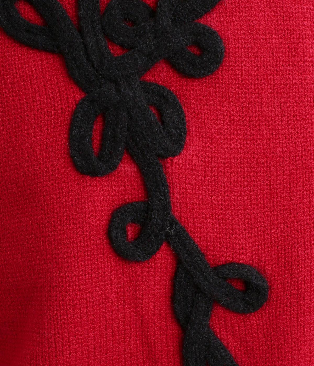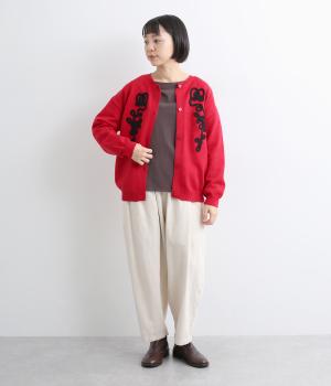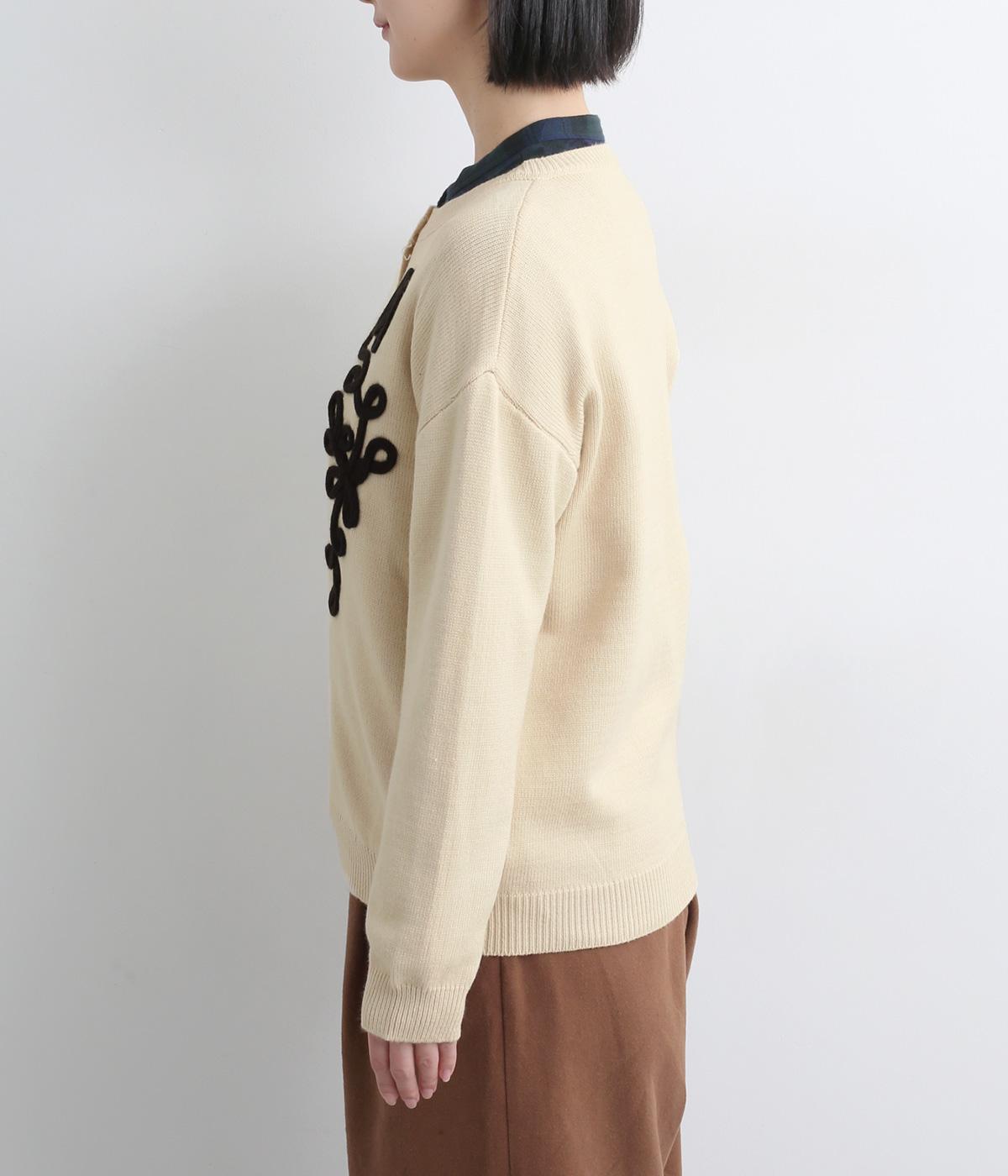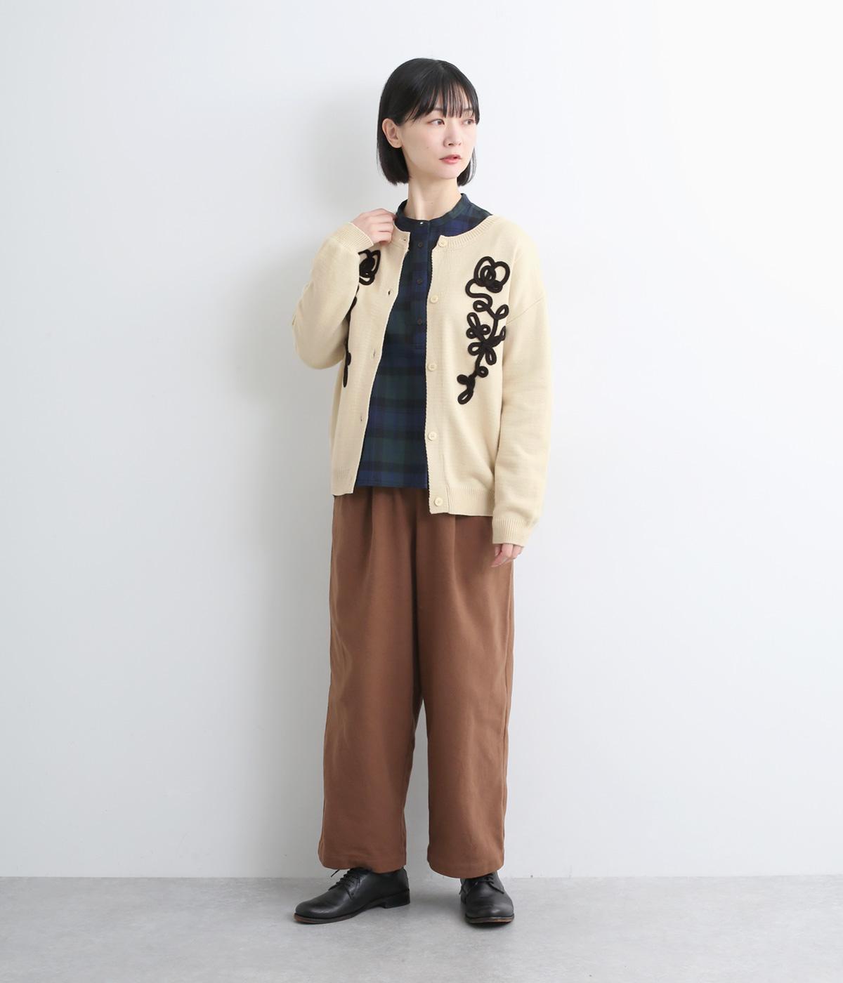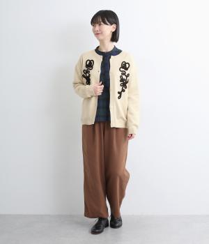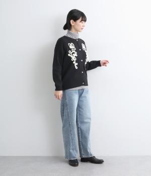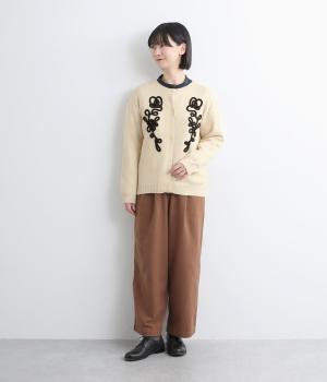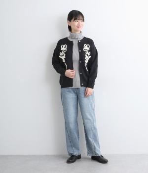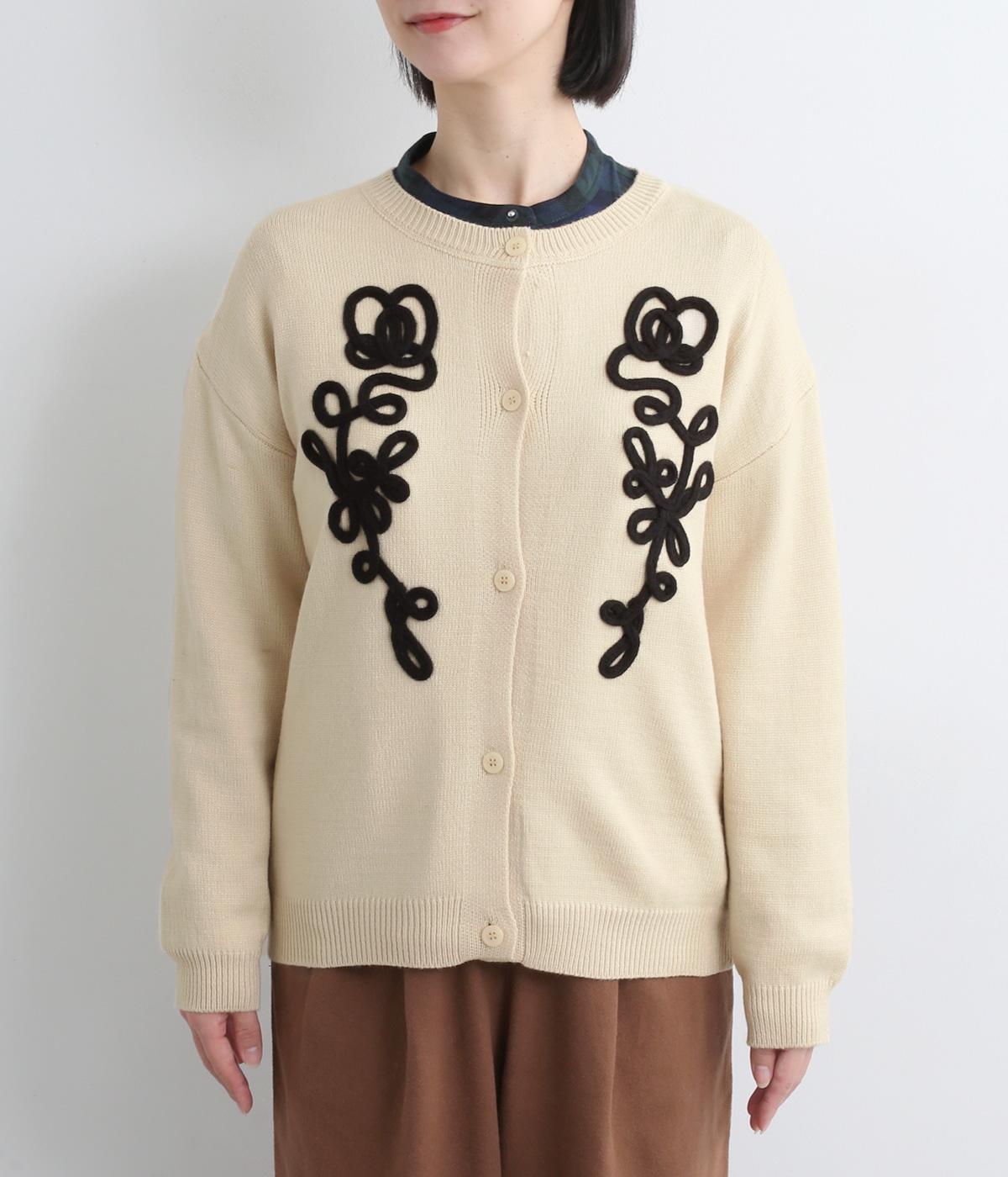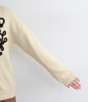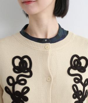 太い紐を縫いつけて刺しゅうのように表現した立体的なフラワーモチーフが目を引きます。アーティーな印象を放ち、女性らしさがありつつも甘さは控えめ。シンプルなクルーネックで、インナーの襟元を覗かせたスタイルもおしゃれに決まります。