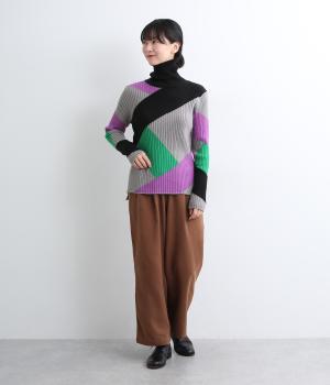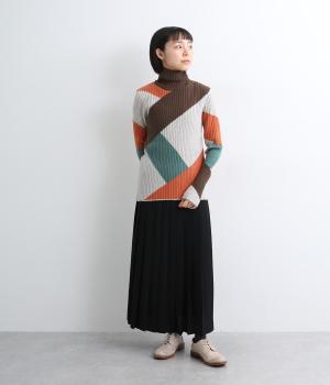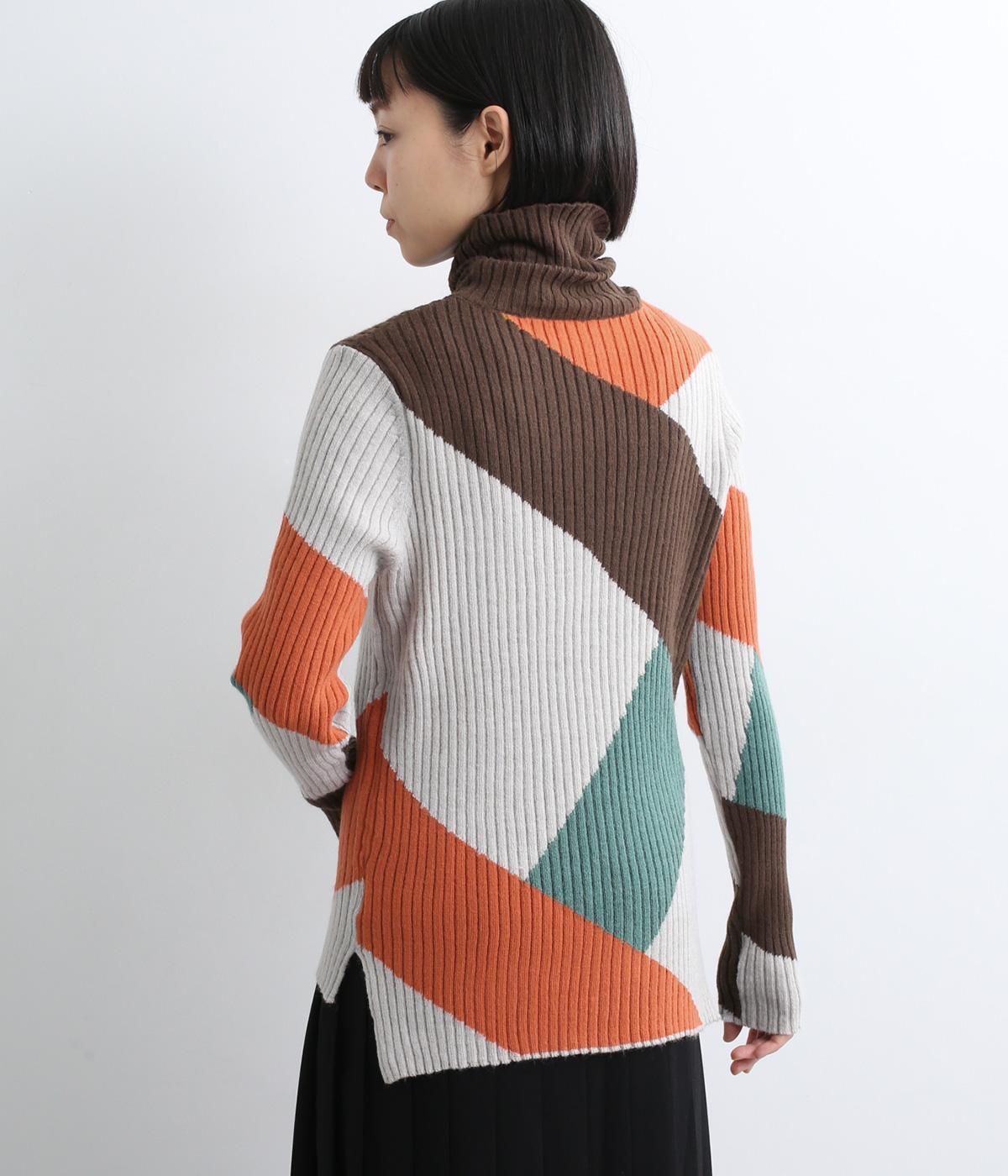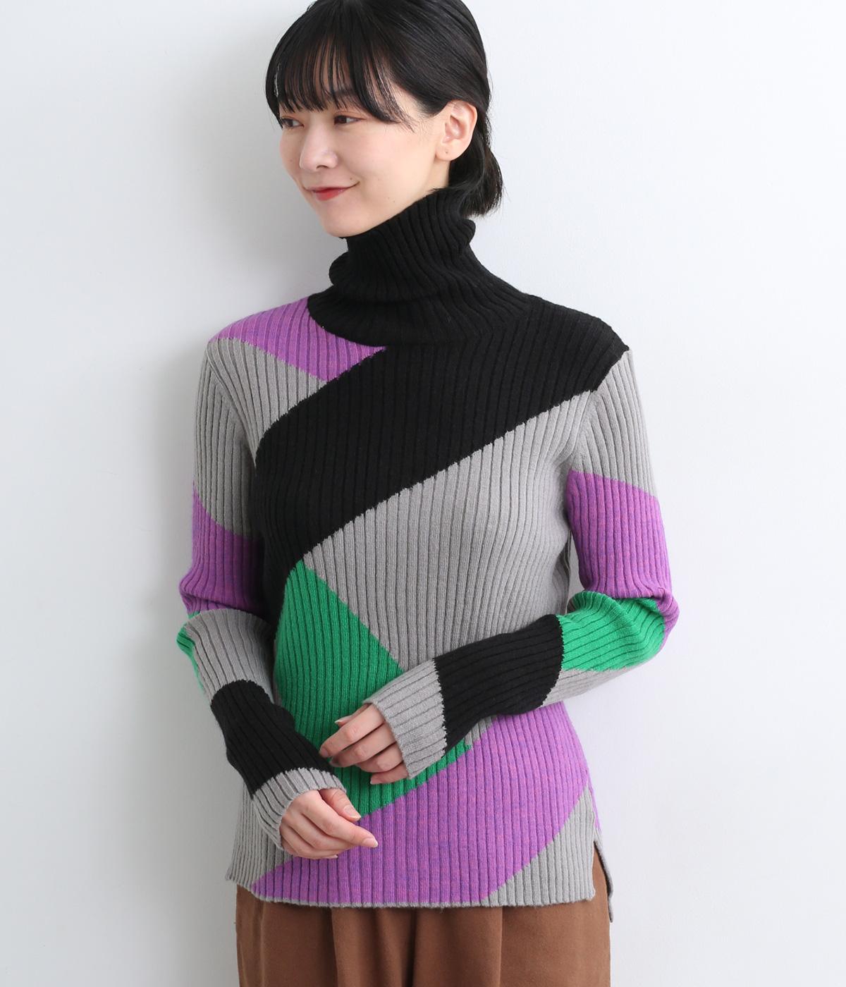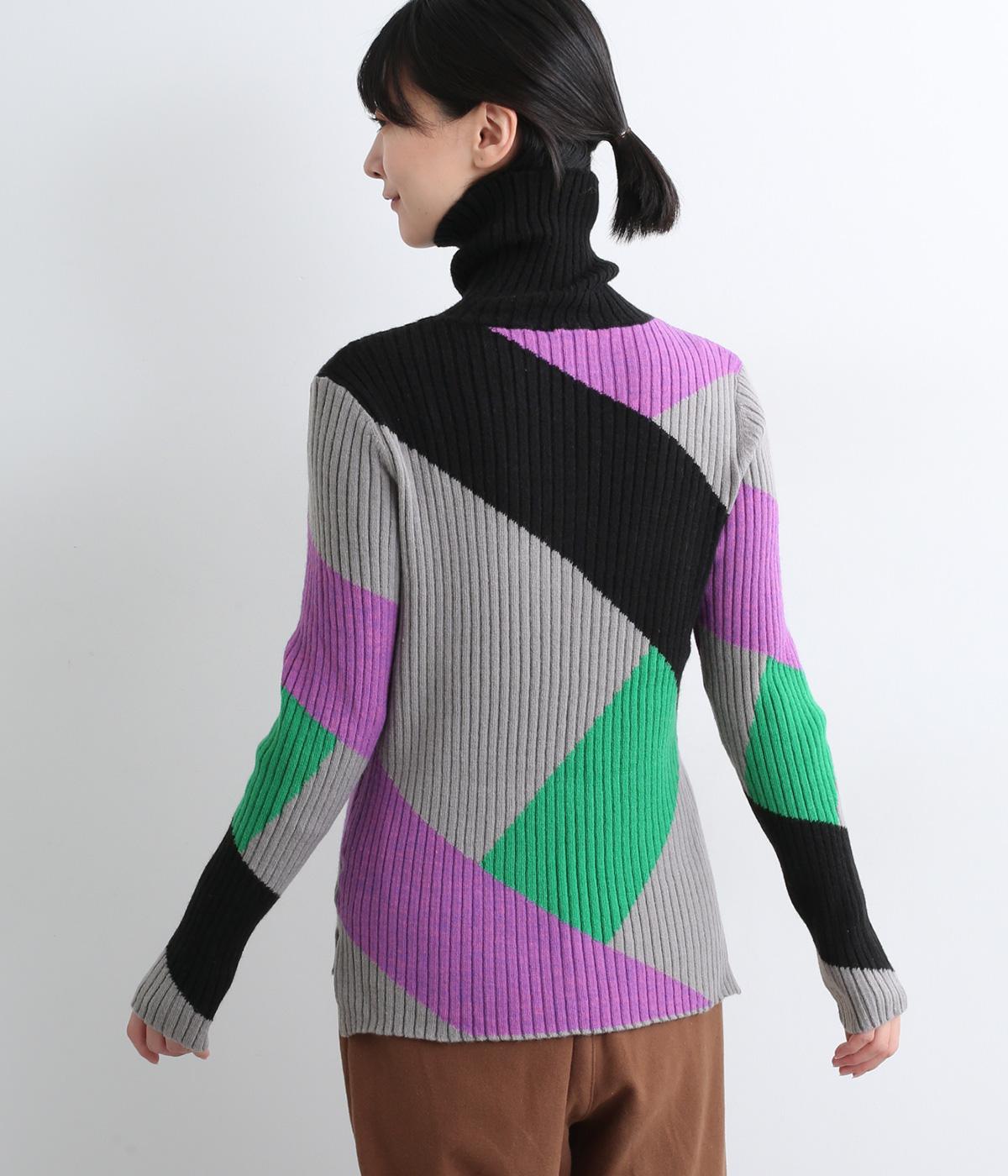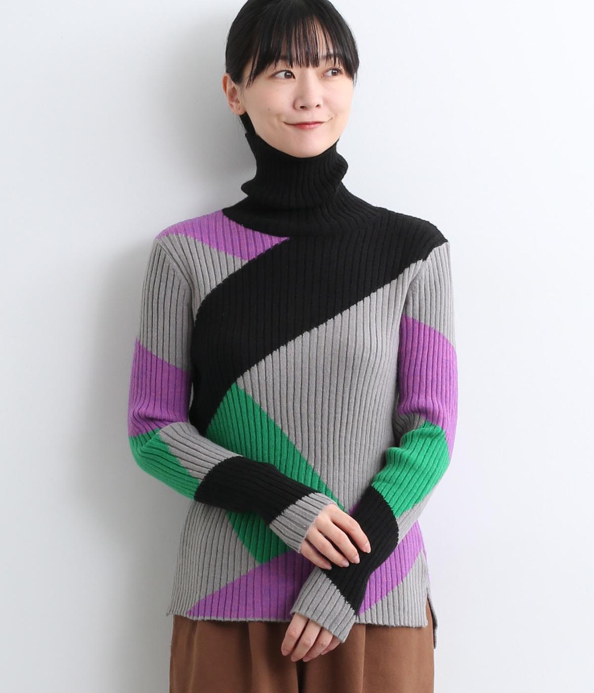 マルチカラーのユニークな配色デザインが目を引くニット。長めのハイネックが首元をやさしく包み込み、あたたかな着用感を叶えてくれます。生地の縦方向のリブが全体をすっきりとした印象に。横姿を素敵に演出する、前後差のある着丈とサイドスリットもポイントです。