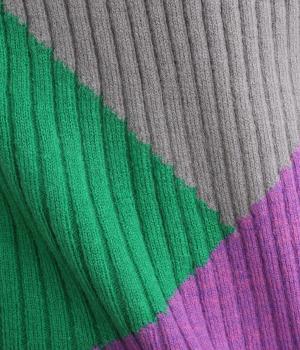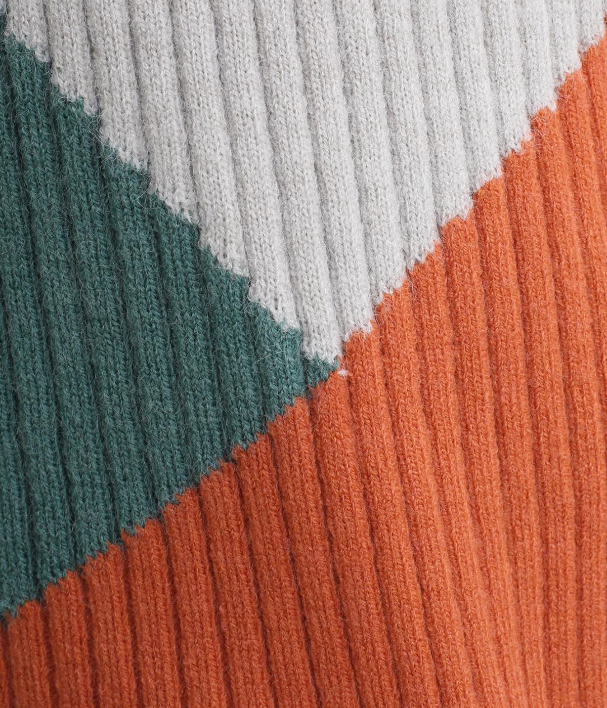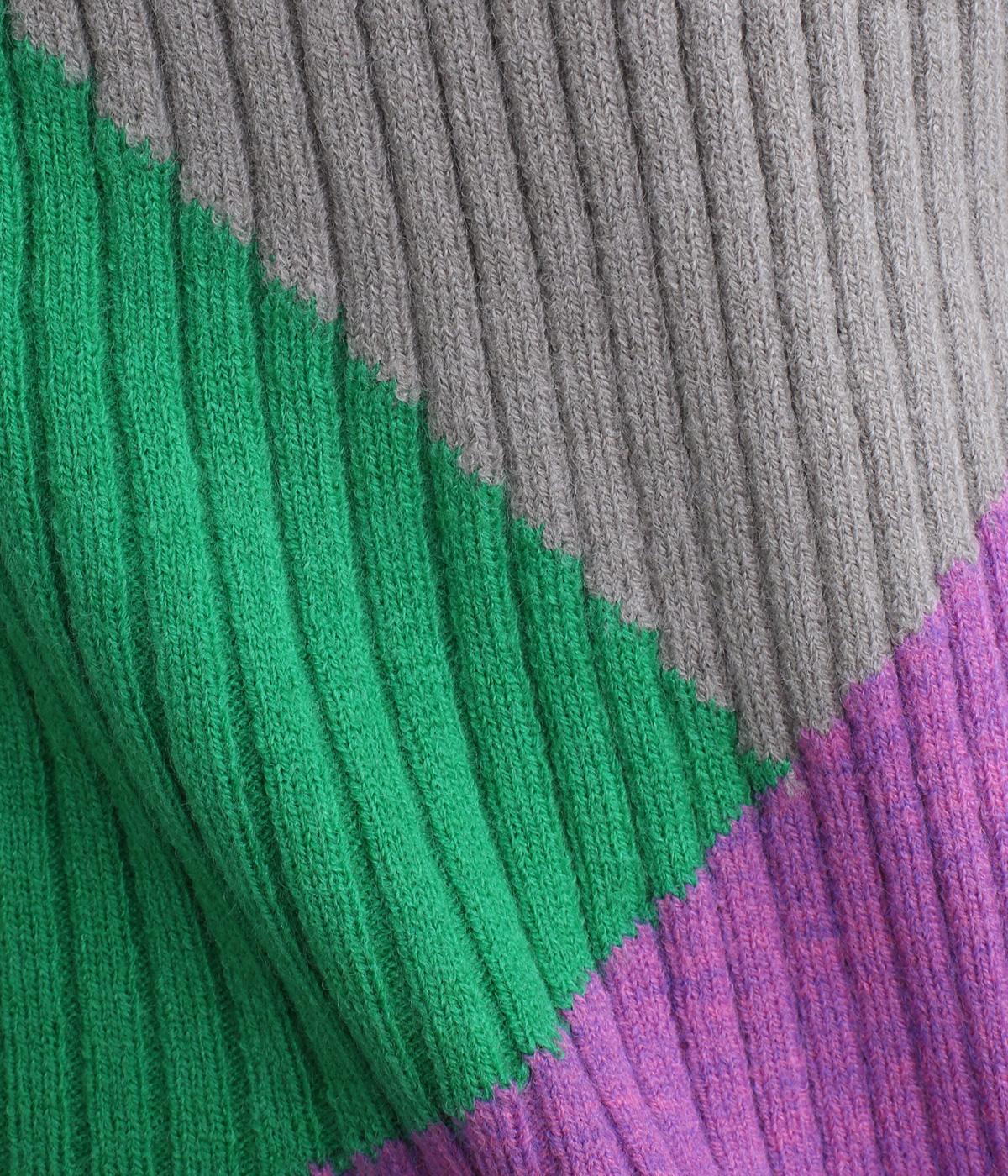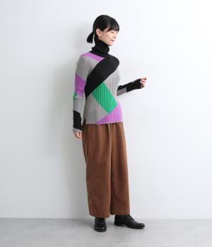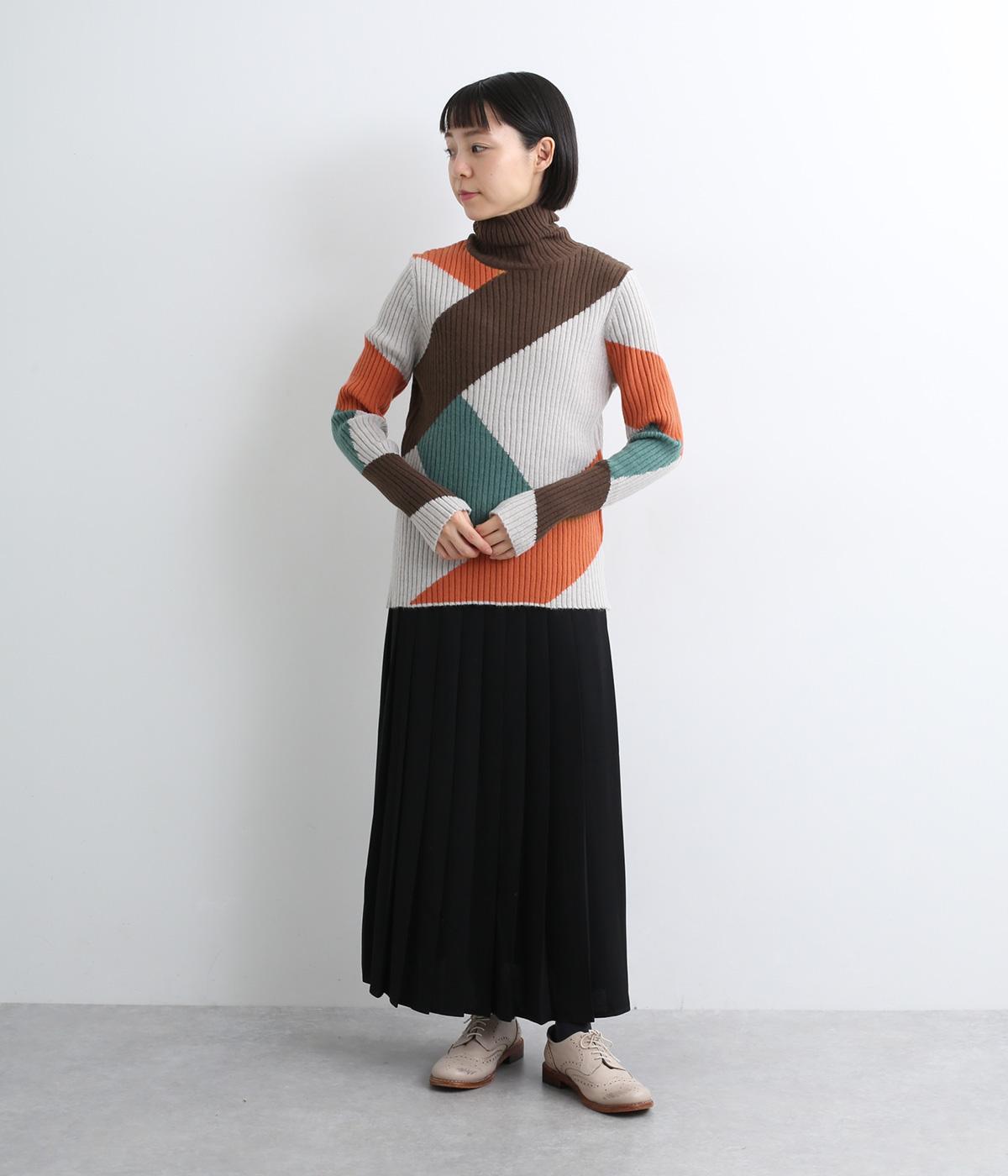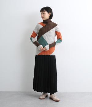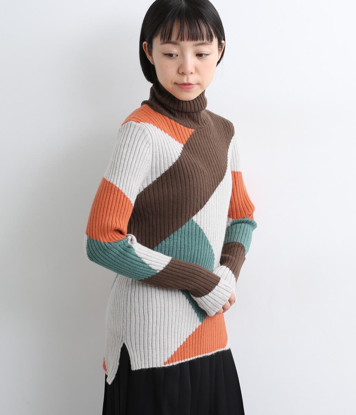 マルチカラーのユニークな配色デザインが目を引くニット。長めのハイネックが首元をやさしく包み込み、あたたかな着用感を叶えてくれます。生地の縦方向のリブが全体をすっきりとした印象に。横姿を素敵に演出する、前後差のある着丈とサイドスリットもポイントです。