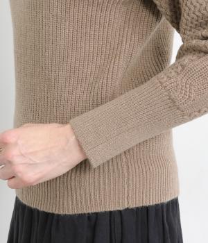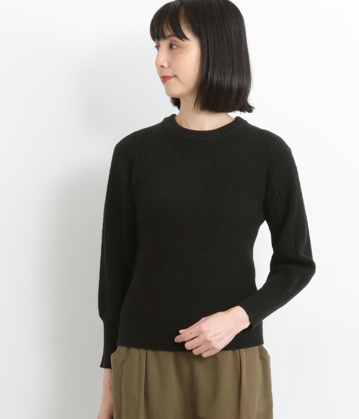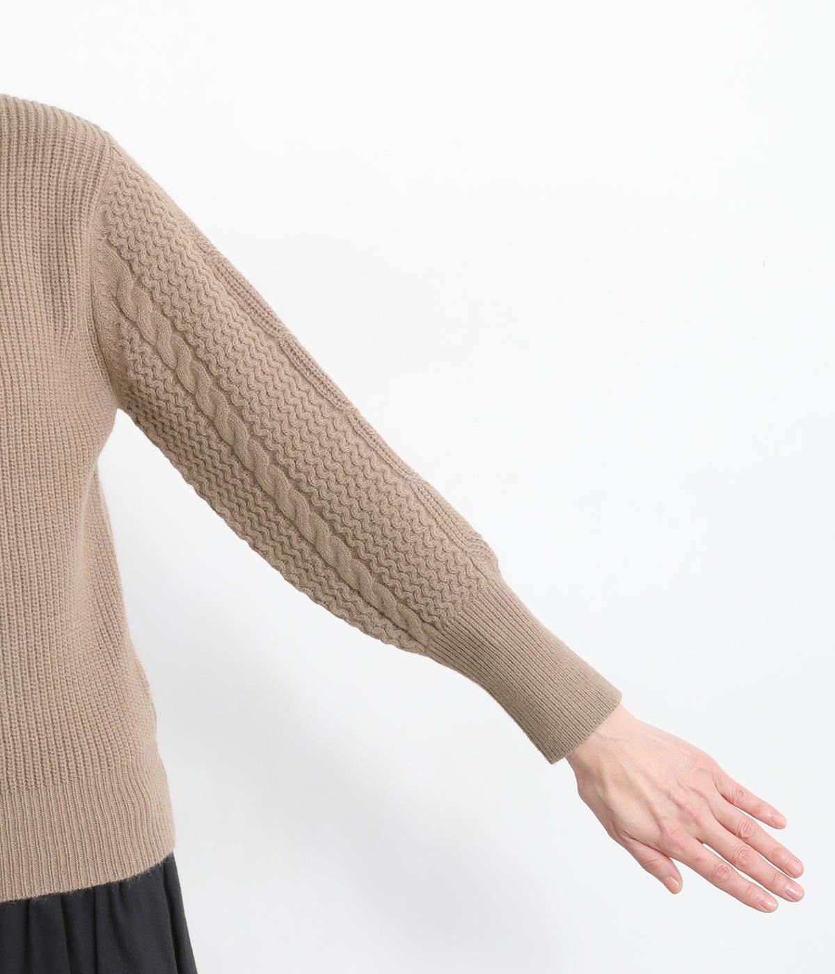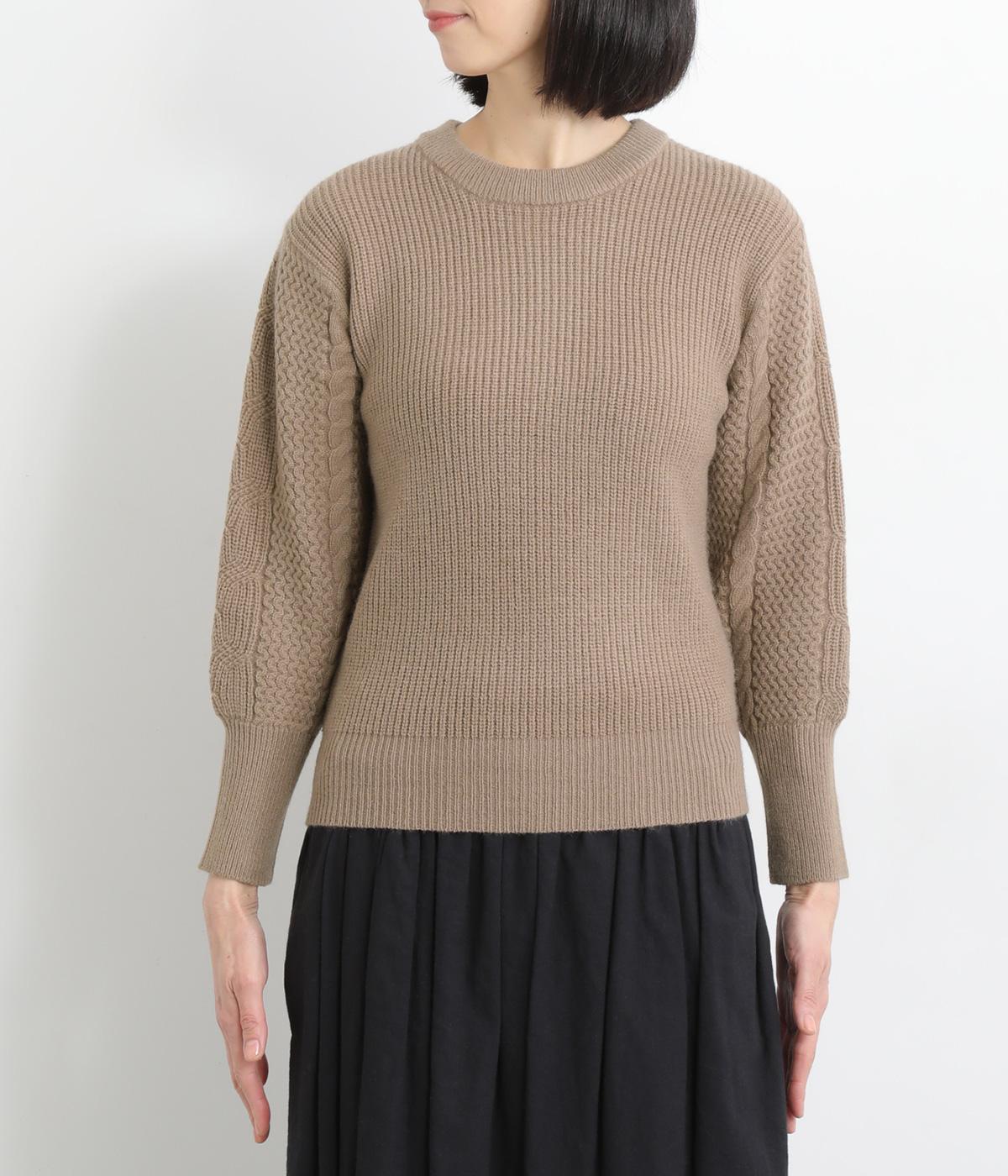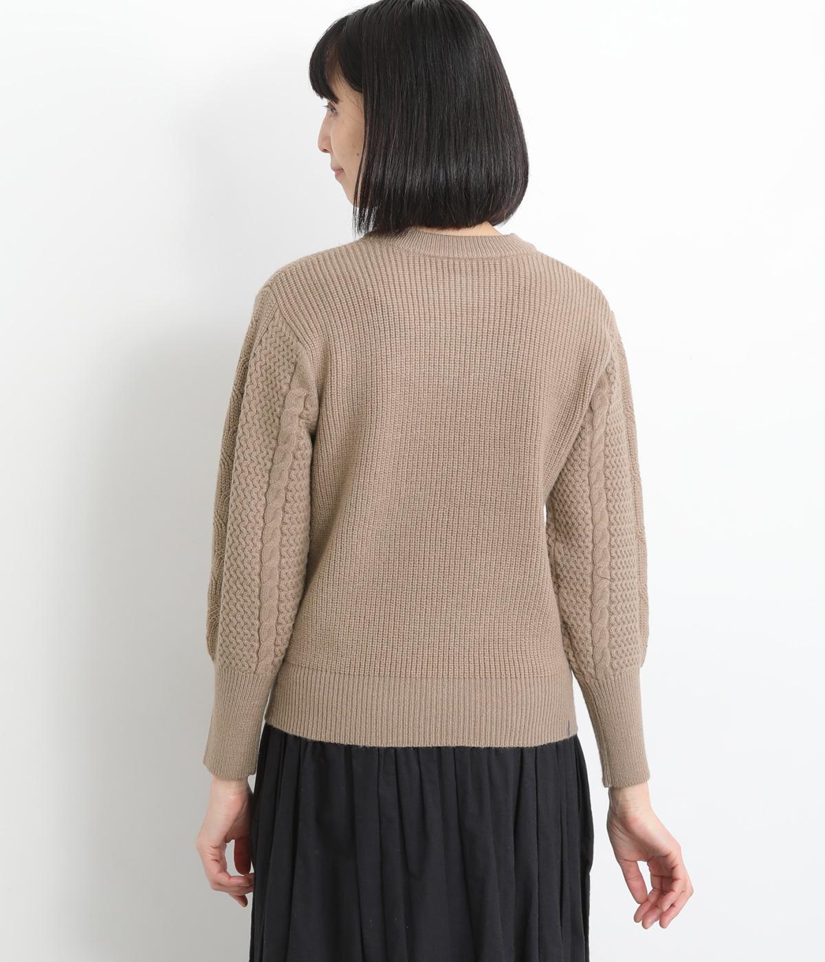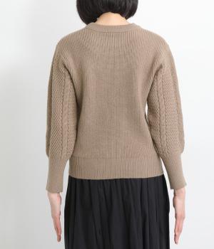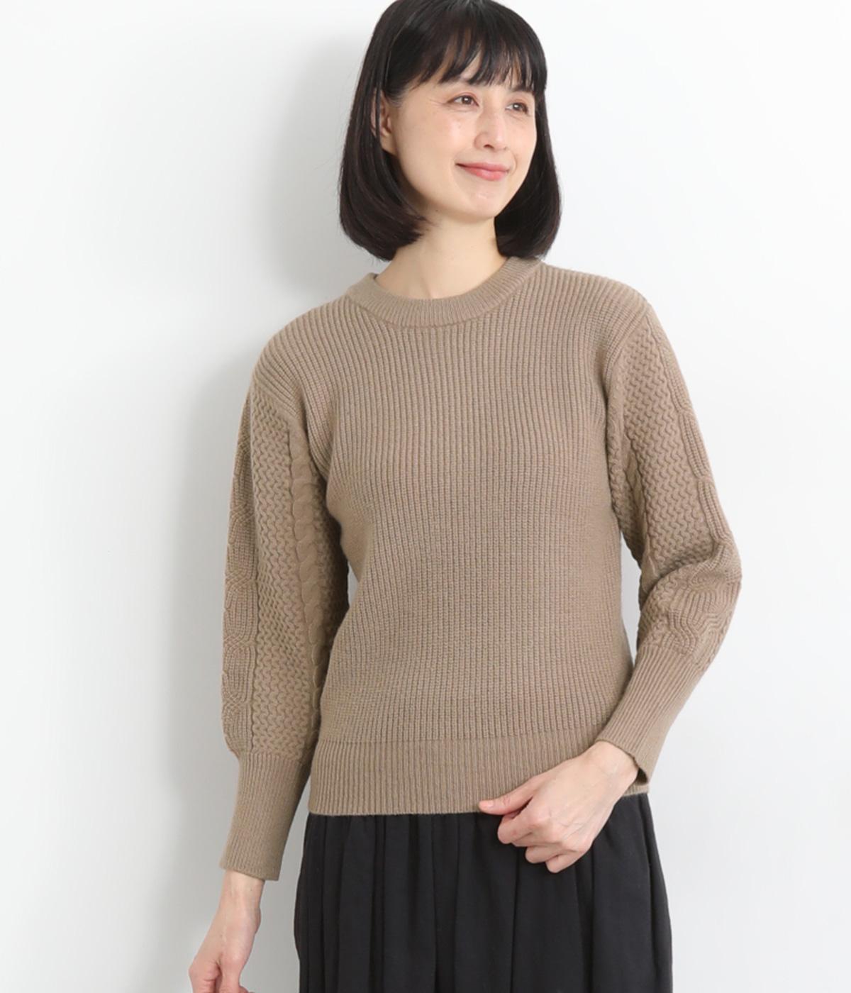 袖にあしらわれたケーブル編みが目を引く、表情ゆたかなニットです。立体的な編み模様が存在感を放ち、装いに奥行きをつくります。身頃と袖口はシンプルなリブ編みで仕上げ、全体をすっきりまとめました。ほどよくゆとりのあるシルエットで、さまざまなボトムスと好相性です。
