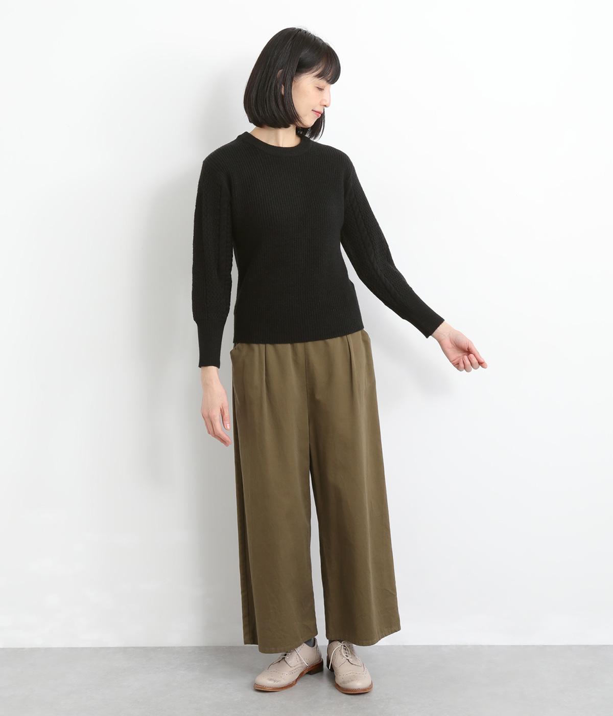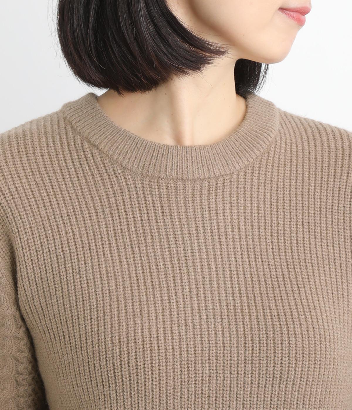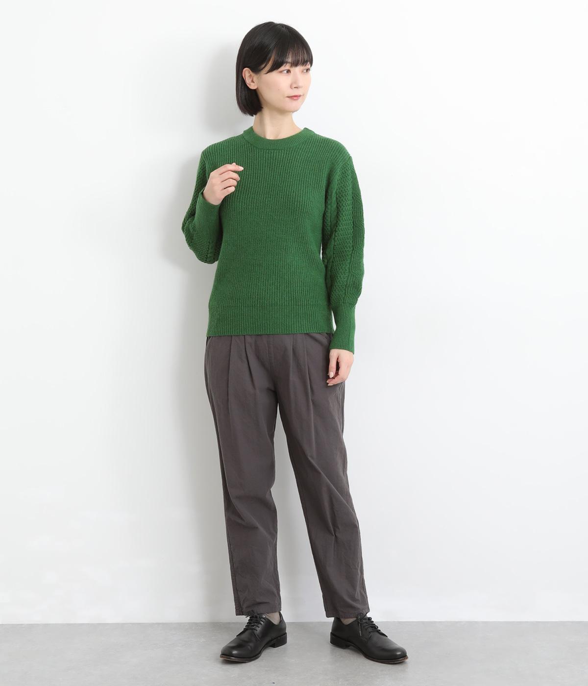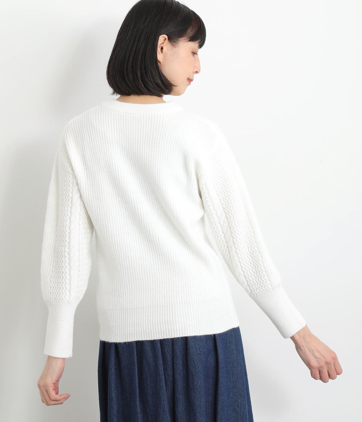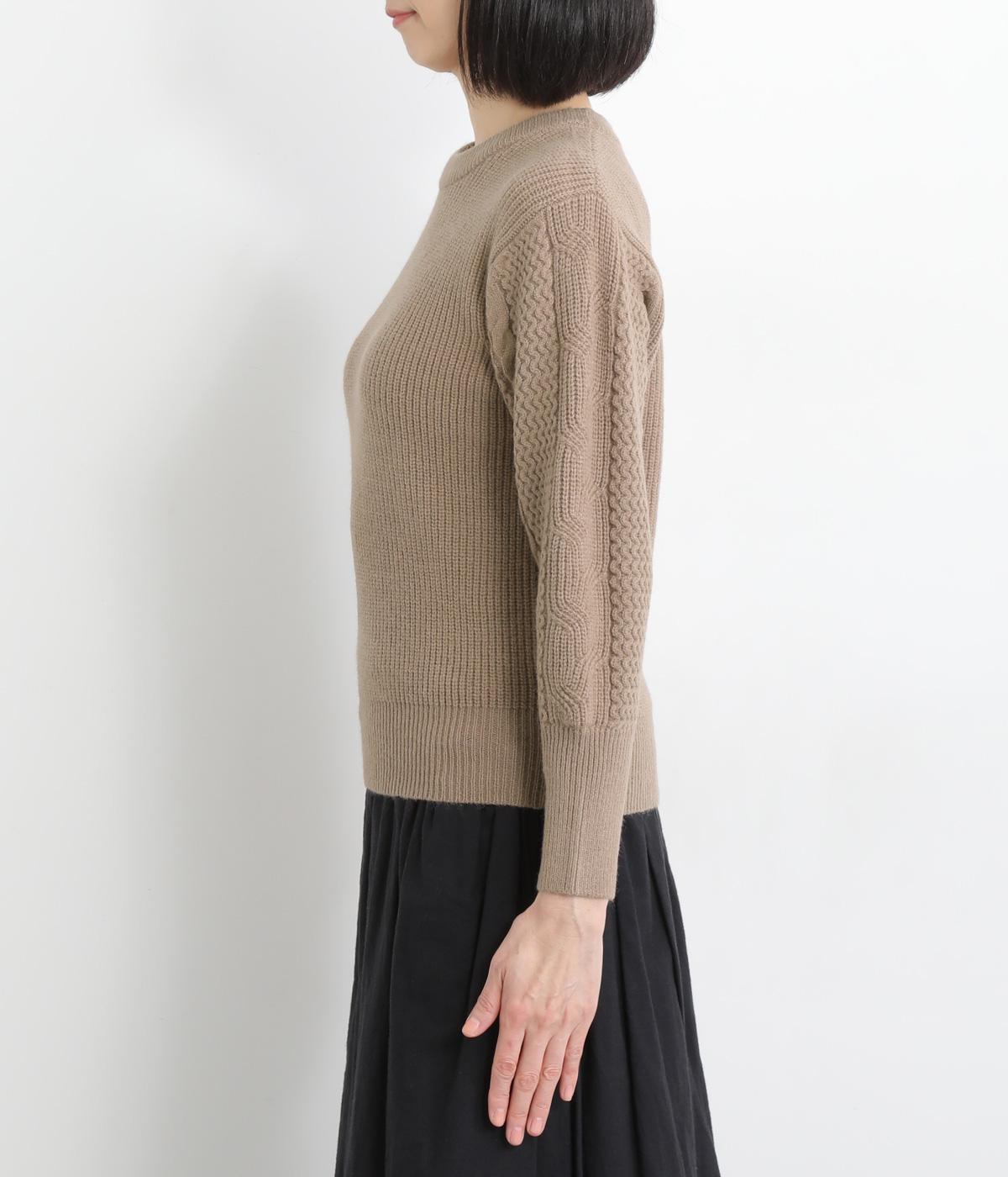 袖にあしらわれたケーブル編みが目を引く、表情ゆたかなニットです。立体的な編み模様が存在感を放ち、装いに奥行きをつくります。身頃と袖口はシンプルなリブ編みで仕上げ、全体をすっきりまとめました。ほどよくゆとりのあるシルエットで、さまざまなボトムスと好相性です。