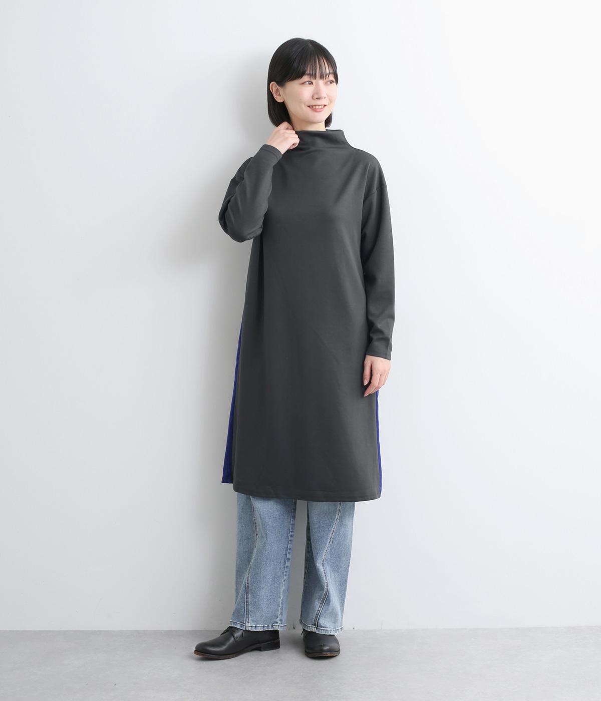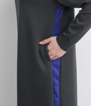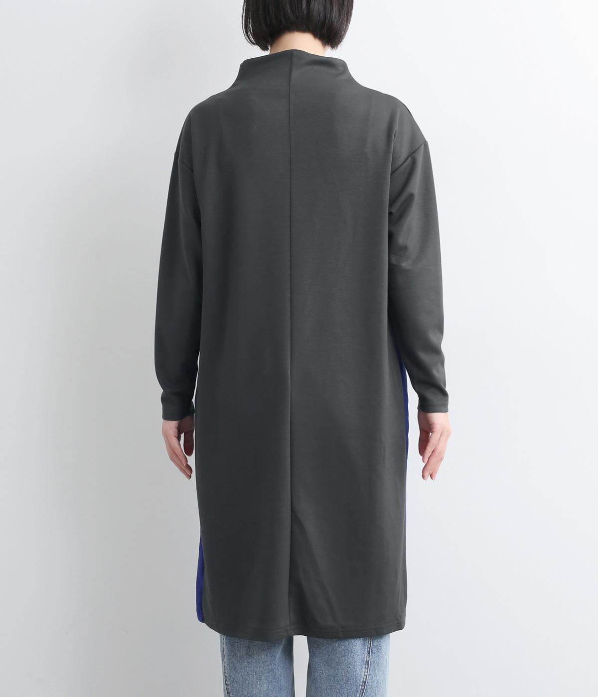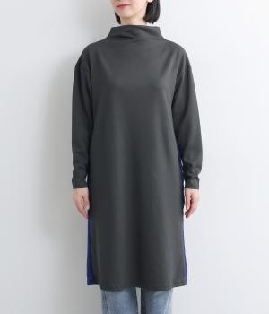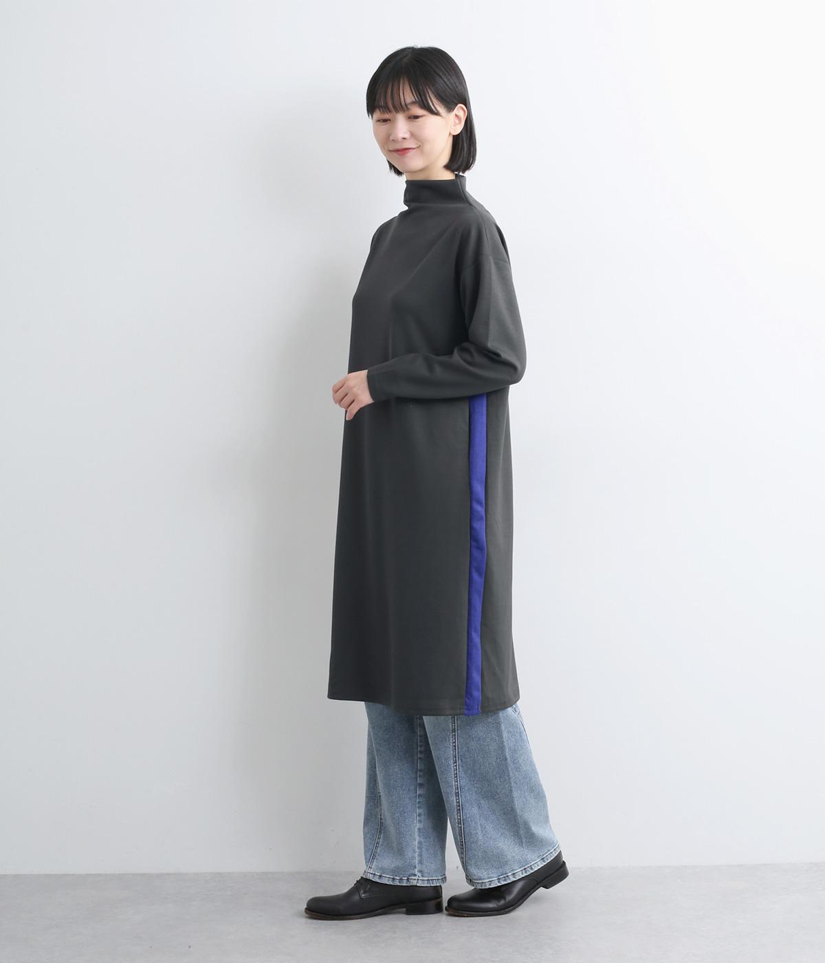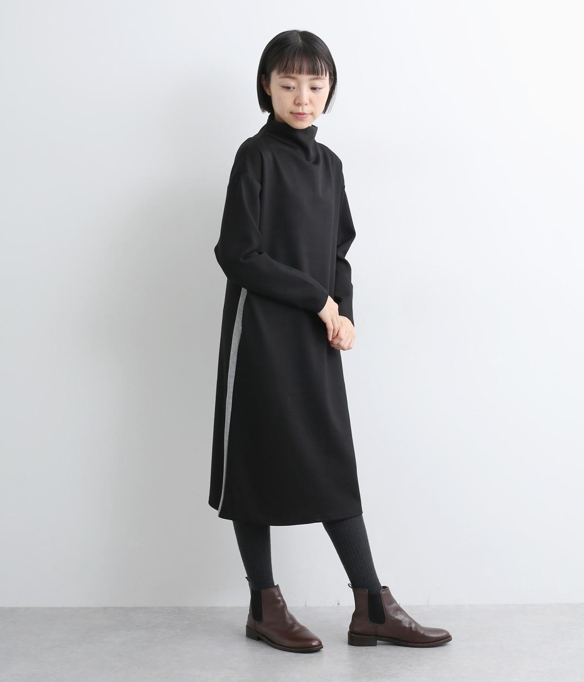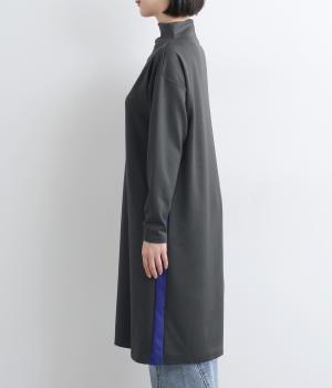 ボトルネックと滑らかな生地感が上品なワンピース。スポーティな配色ラインをプラスして、ファッションムードを高めました。一枚でもボトムスとのレイヤードもサマになる、ひざ下丈もグッド。両サイドには便利なポケットつきです。