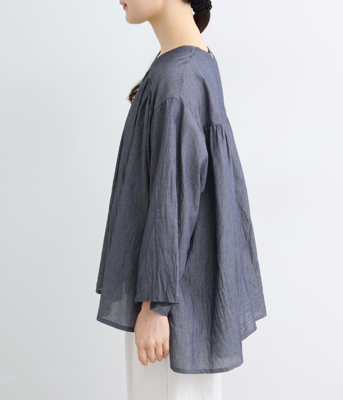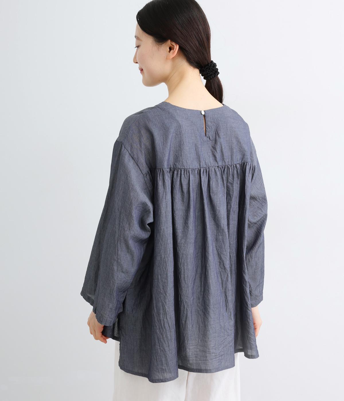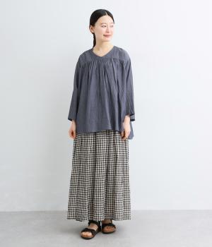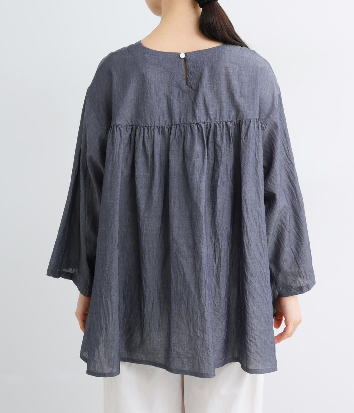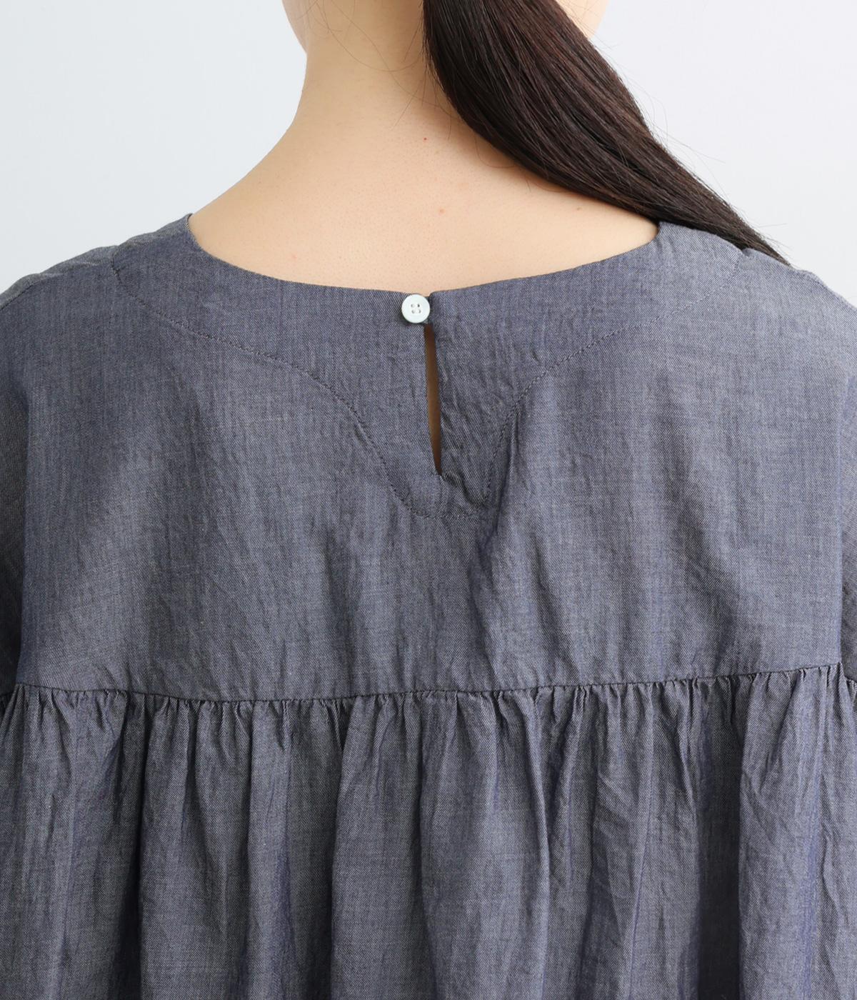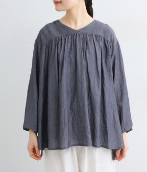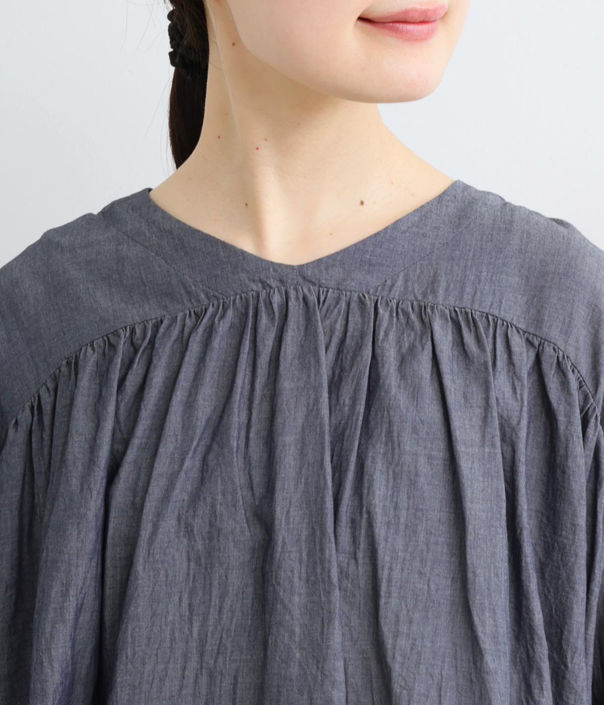 高い位置に切り替えを入れて、ギャザーの映えるふんわりシルエットに仕立てました。後ろ裾がやや長めなので、ヒップまわりをカバーしてくれるのも嬉しいポイント。詰まりすぎない緩やかなVネックが、顔まわりをすっきりと見せます。