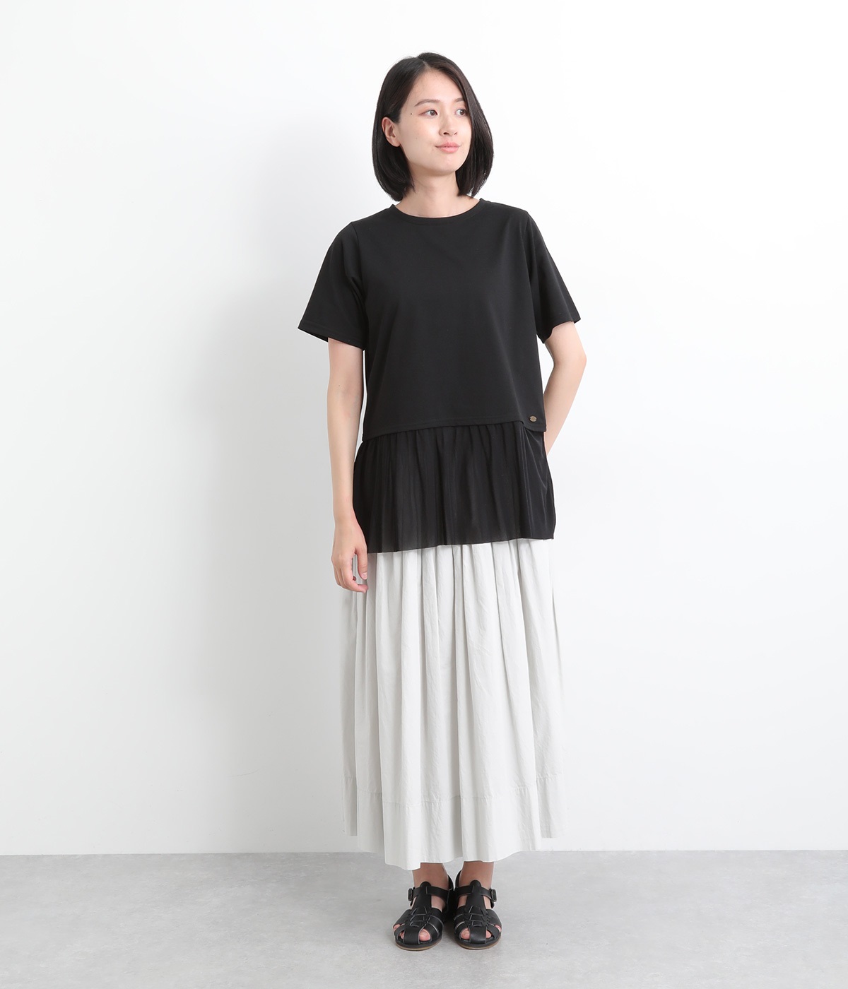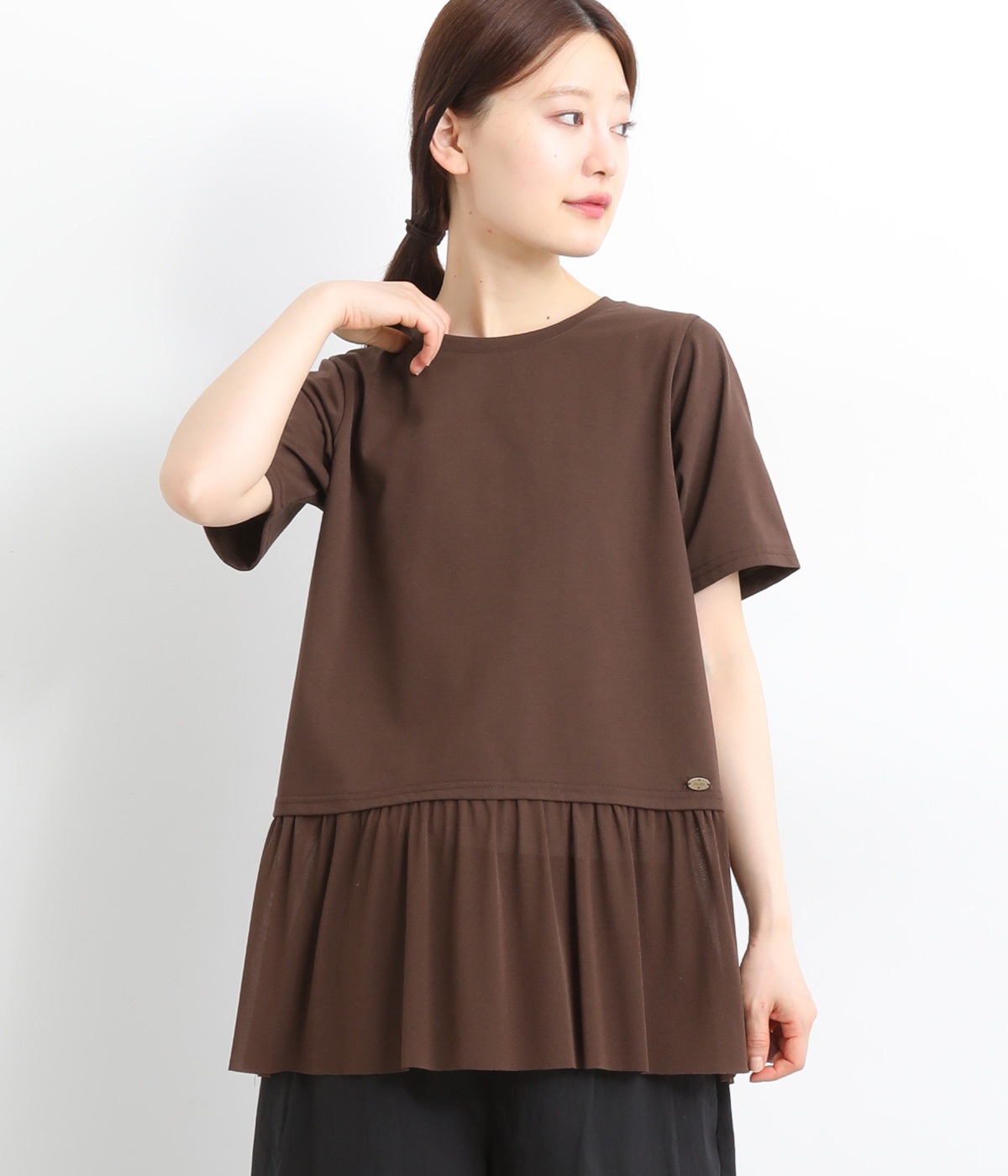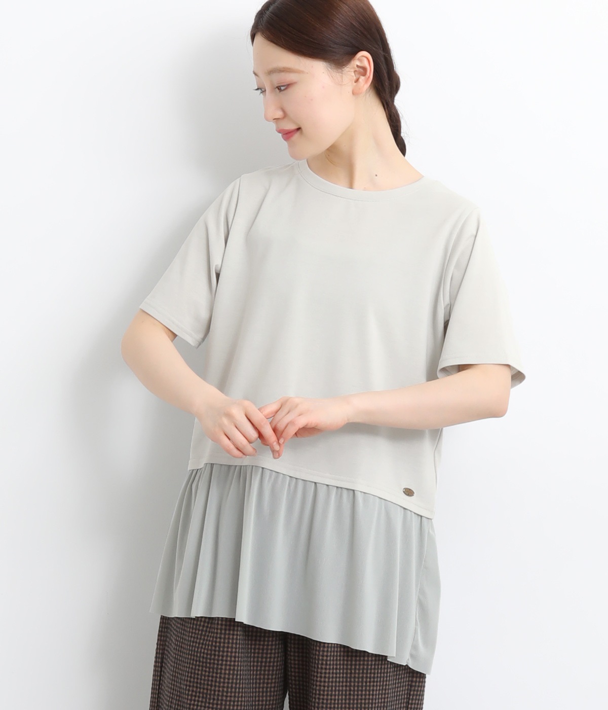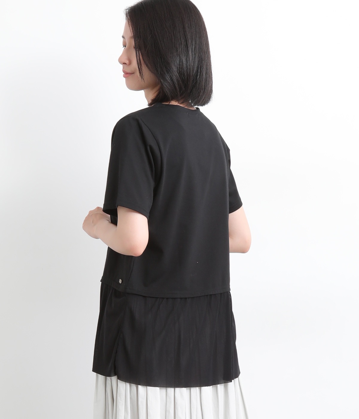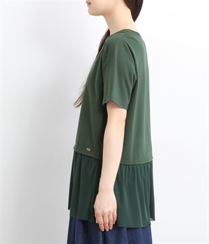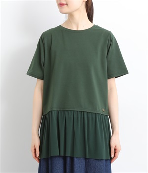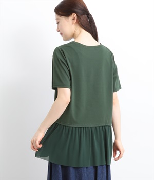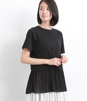 裾にチュールを合わせたレイヤード風デザインが着映えするプルオーバーです。シンプルなTシャツをベースにしているのでスタイリングしやすいのもグッドポイント。カットソー部分はやや短めにしていてバランスよく着こなせます。
