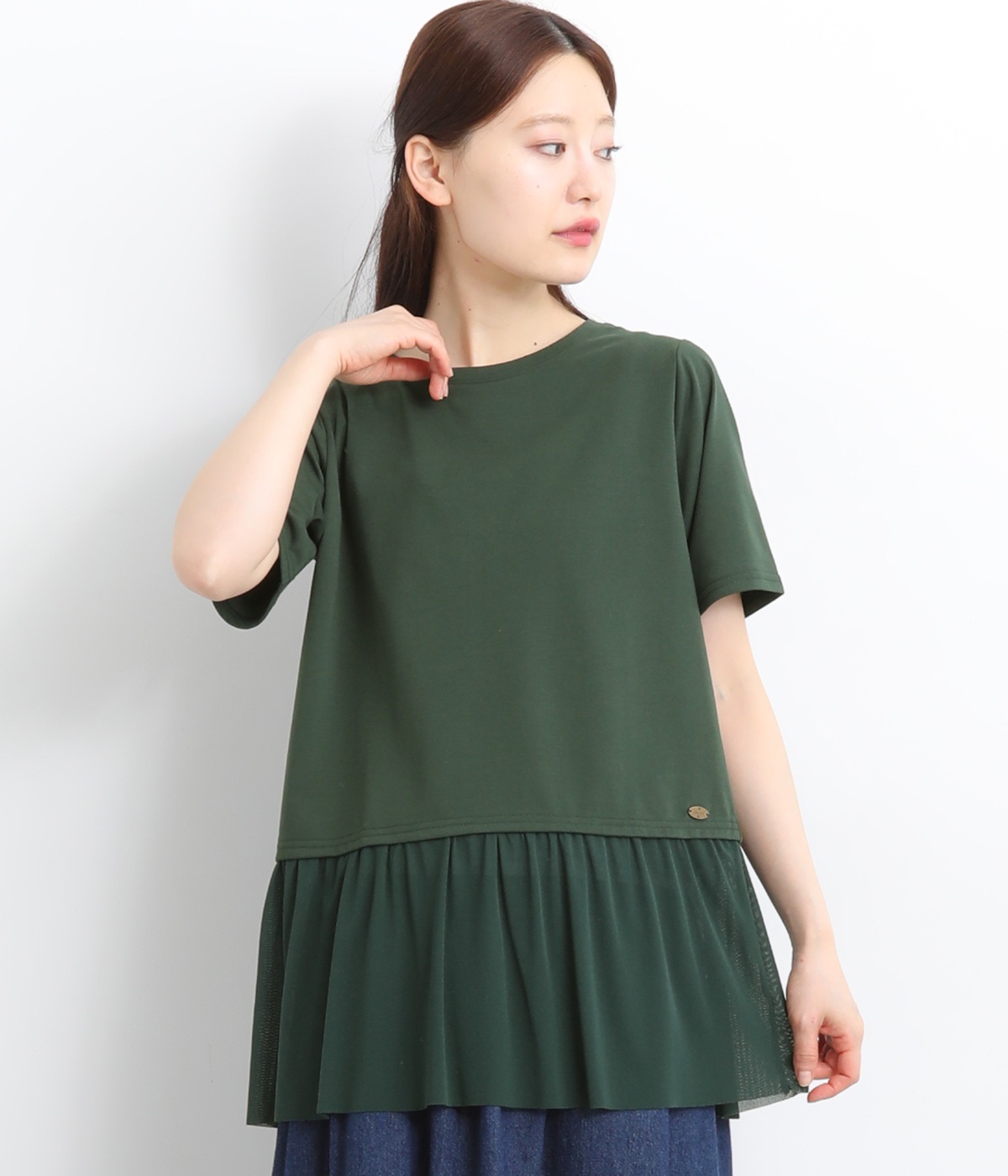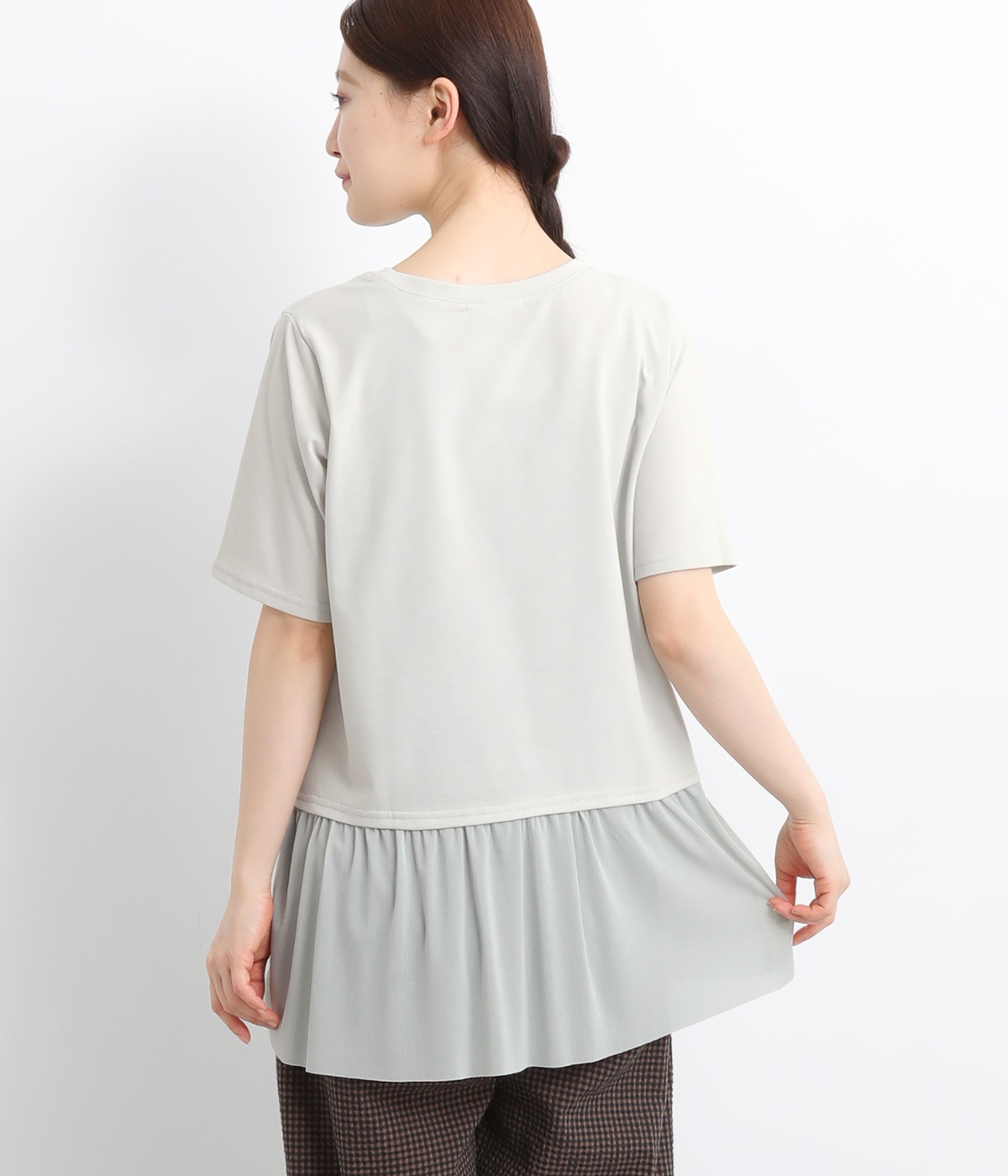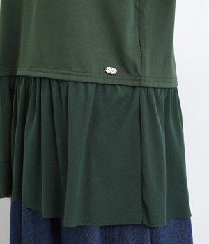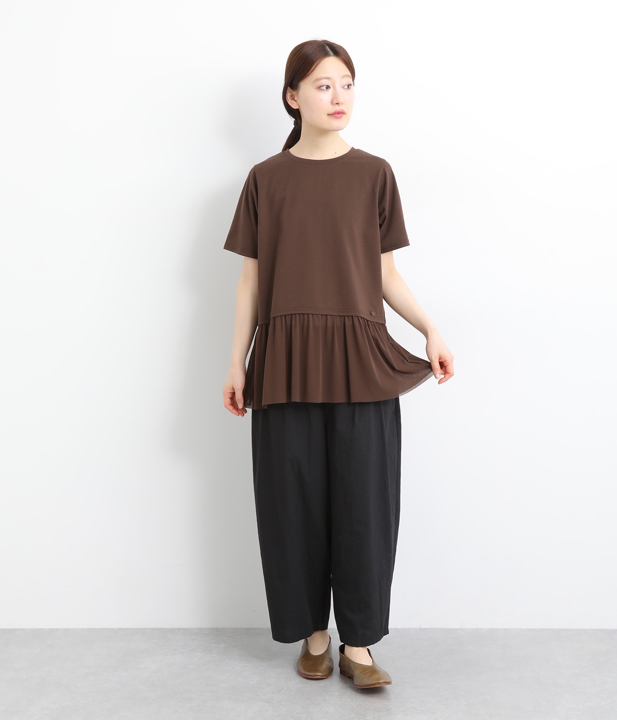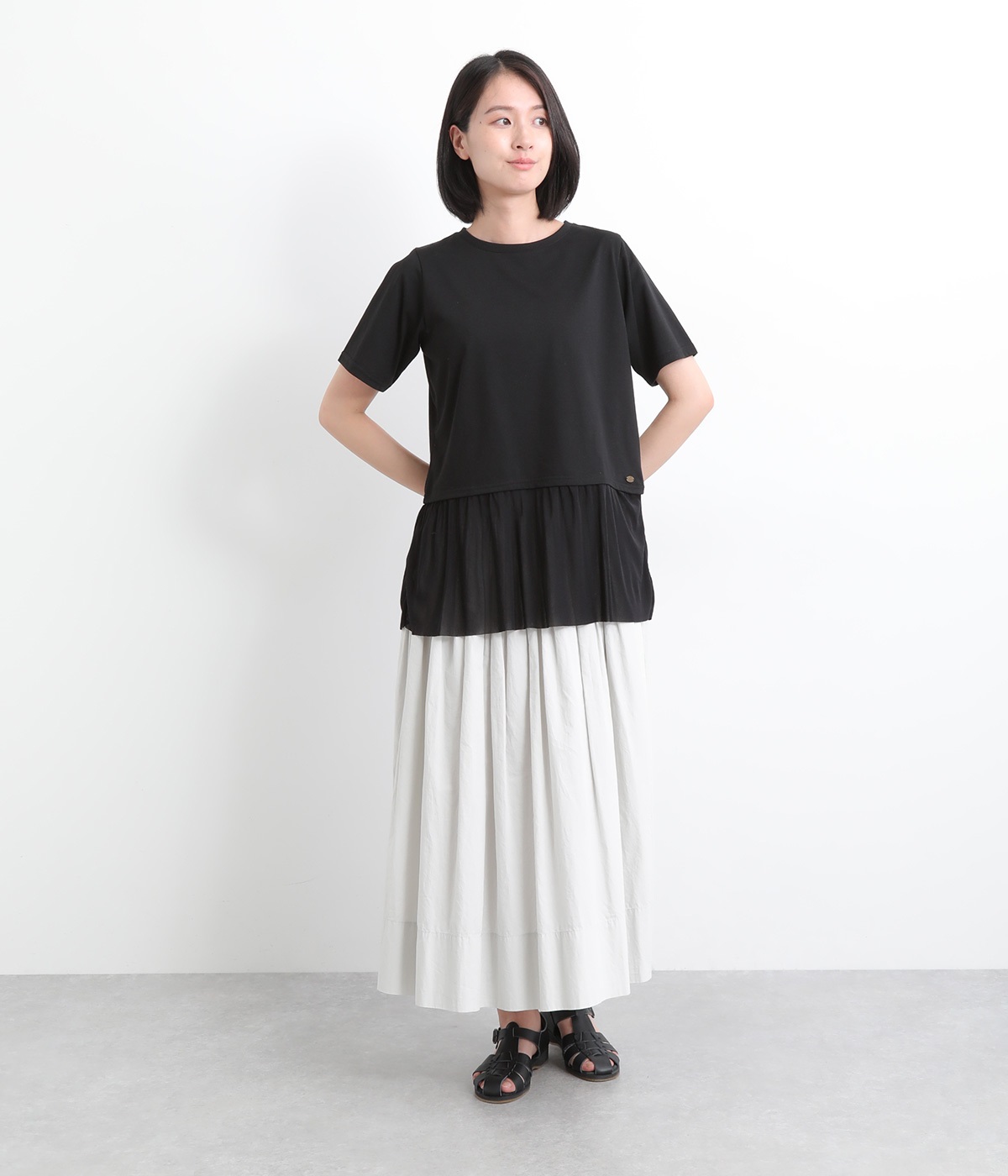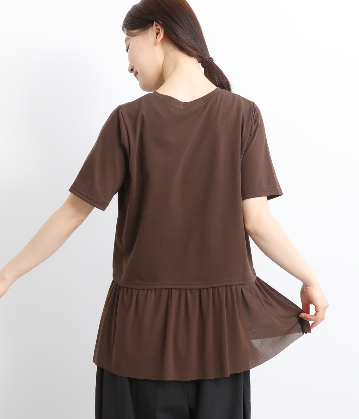 裾にチュールを合わせたレイヤード風デザインが着映えするプルオーバーです。シンプルなTシャツをベースにしているのでスタイリングしやすいのもグッドポイント。カットソー部分はやや短めにしていてバランスよく着こなせます。