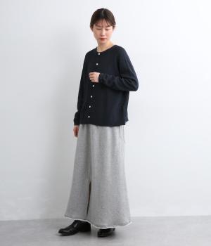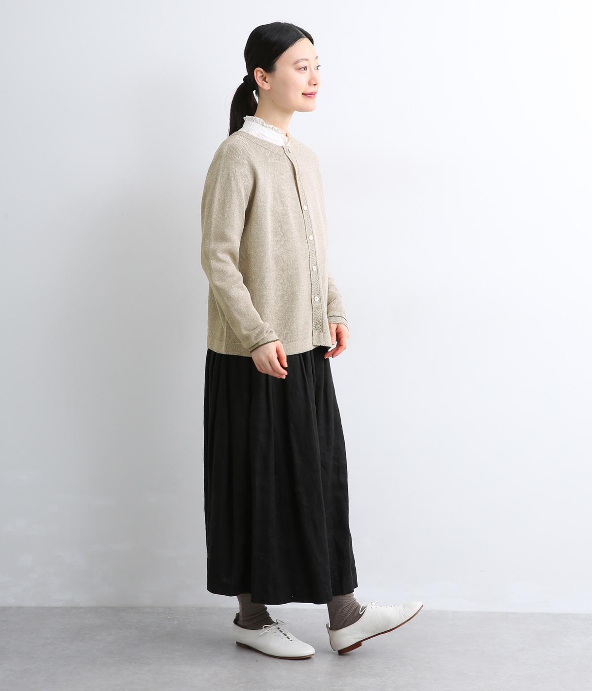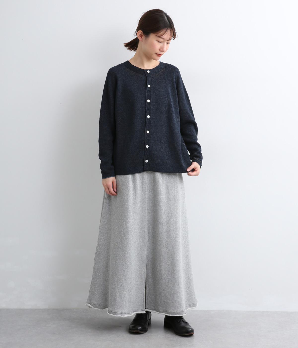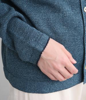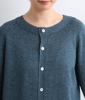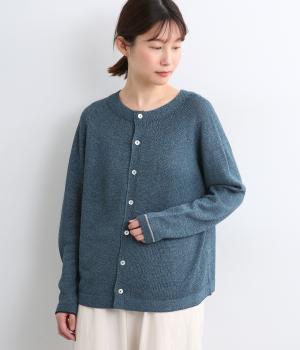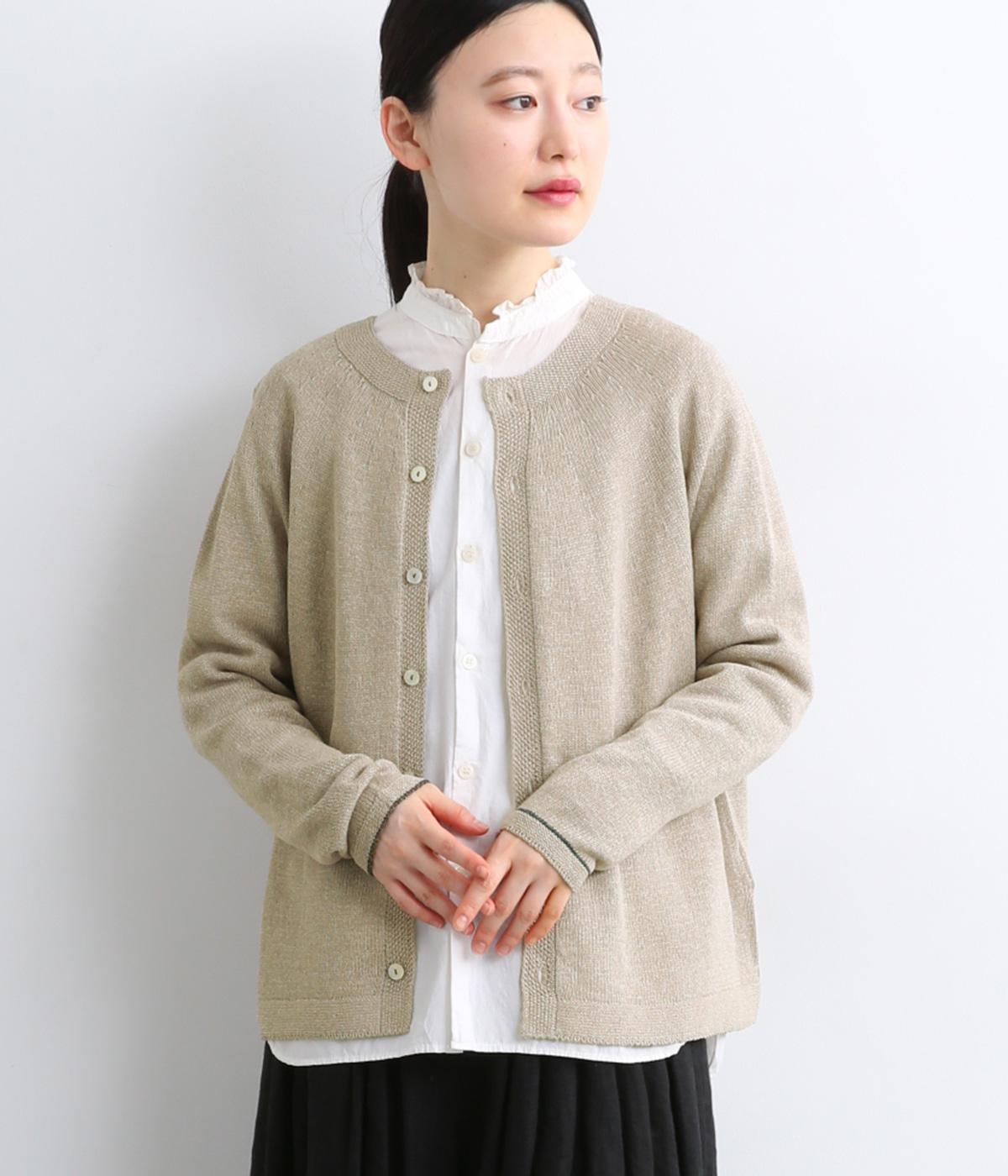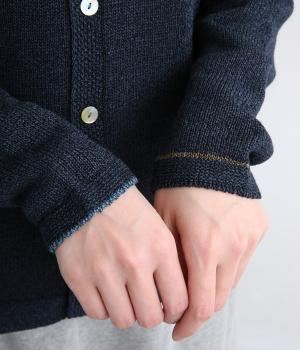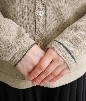 ホールガーメントで仕立てたカーディガンは、縫い目が少なく、自然な落ち感とやさしいフィット感をたのしめます。定番シルエットながら、ざっくり編みの透け感があるので、見た目にも涼感があります。左右の袖で異なる配色ラインを施し、さりげないアクセントに。上品な貝ボタンが、全体を落ち着いた印象にまとめています。