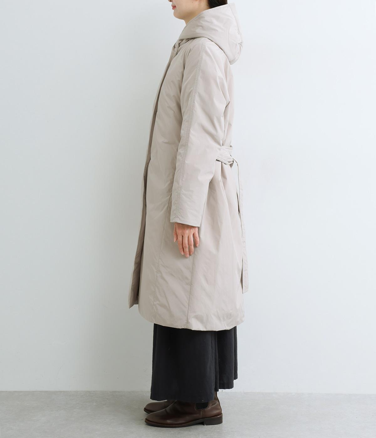 表地にはほんのりとした上品な光沢のあるポリエステル生地、裏地にはつるりとしたナイロンキルト生地を使用。フェザーに比べダウンの比率が高いのでとても軽くあたたかな着心地です。