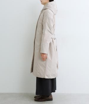 首元からひざ下まであたたかく包み込むロング丈のダウンコート。Aラインのシルエットが全体のバランスをすっきりと見せてくれます。ウエスト位置をより強調するベルトループと共布のベルトつき。風の侵入を防ぐ、袖口につけたリブもポイントです。