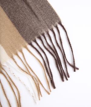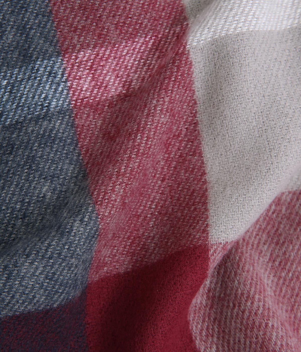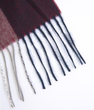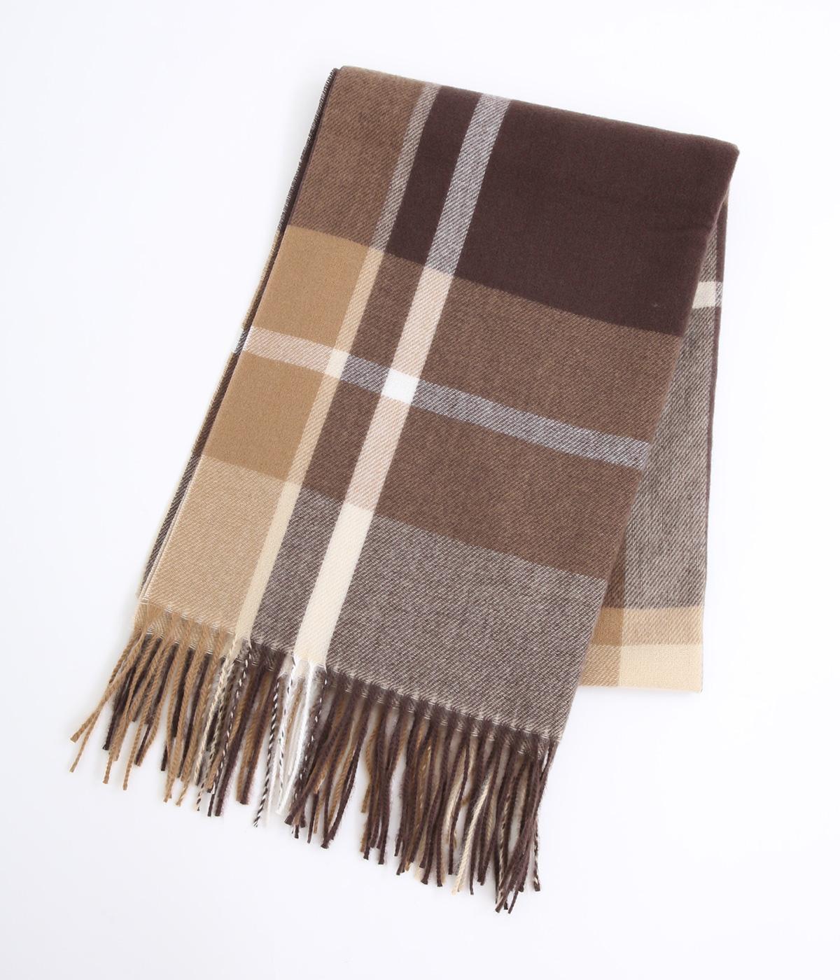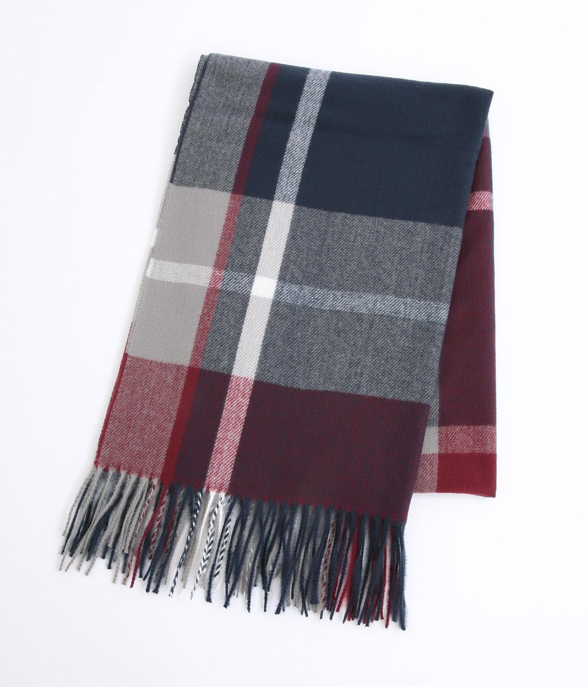 使い勝手のいいダークトーン配色にすこしポイントカラーを入れた、大人なチェック柄が好印象。ベーシックな細長にフリンジつきのデザインも◎。肩にかけるだけでもさまになり、首に巻いたときのボリューム感もちょうどいい仕上がりです。