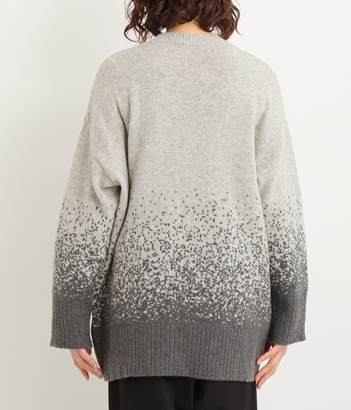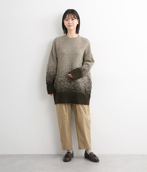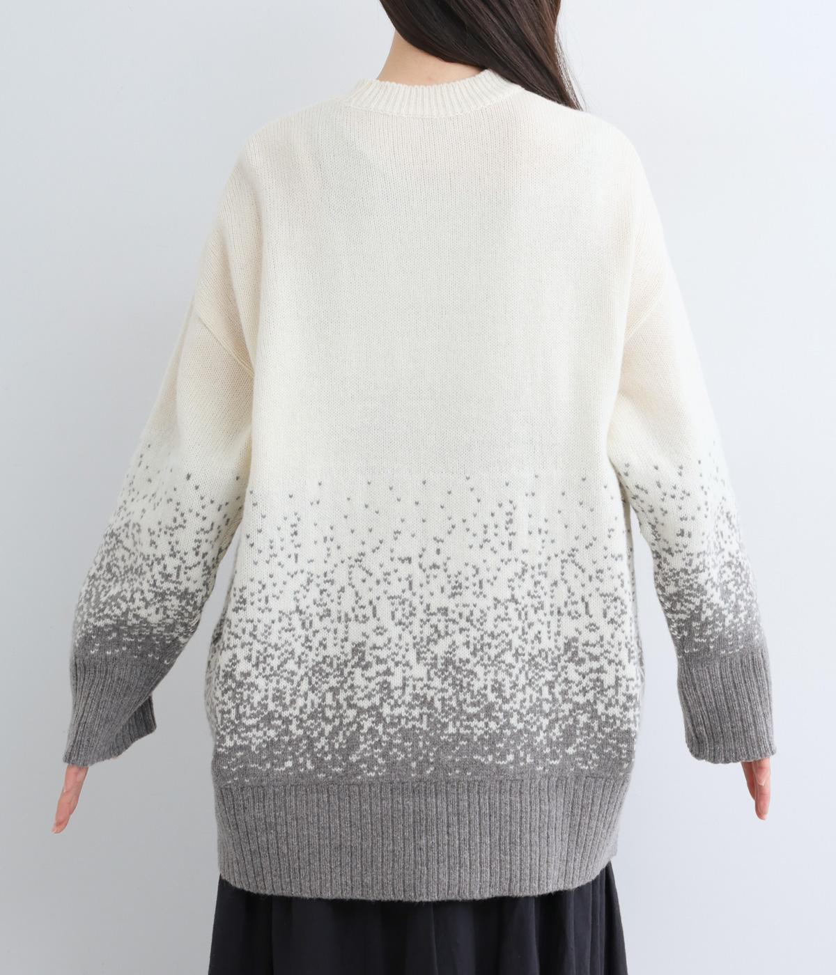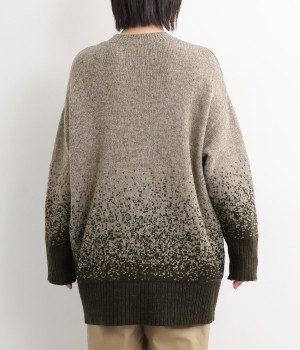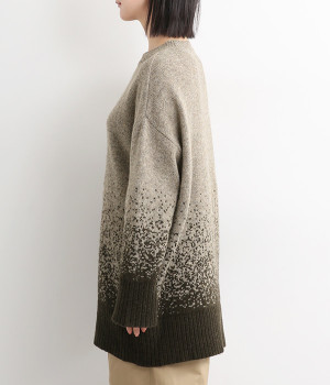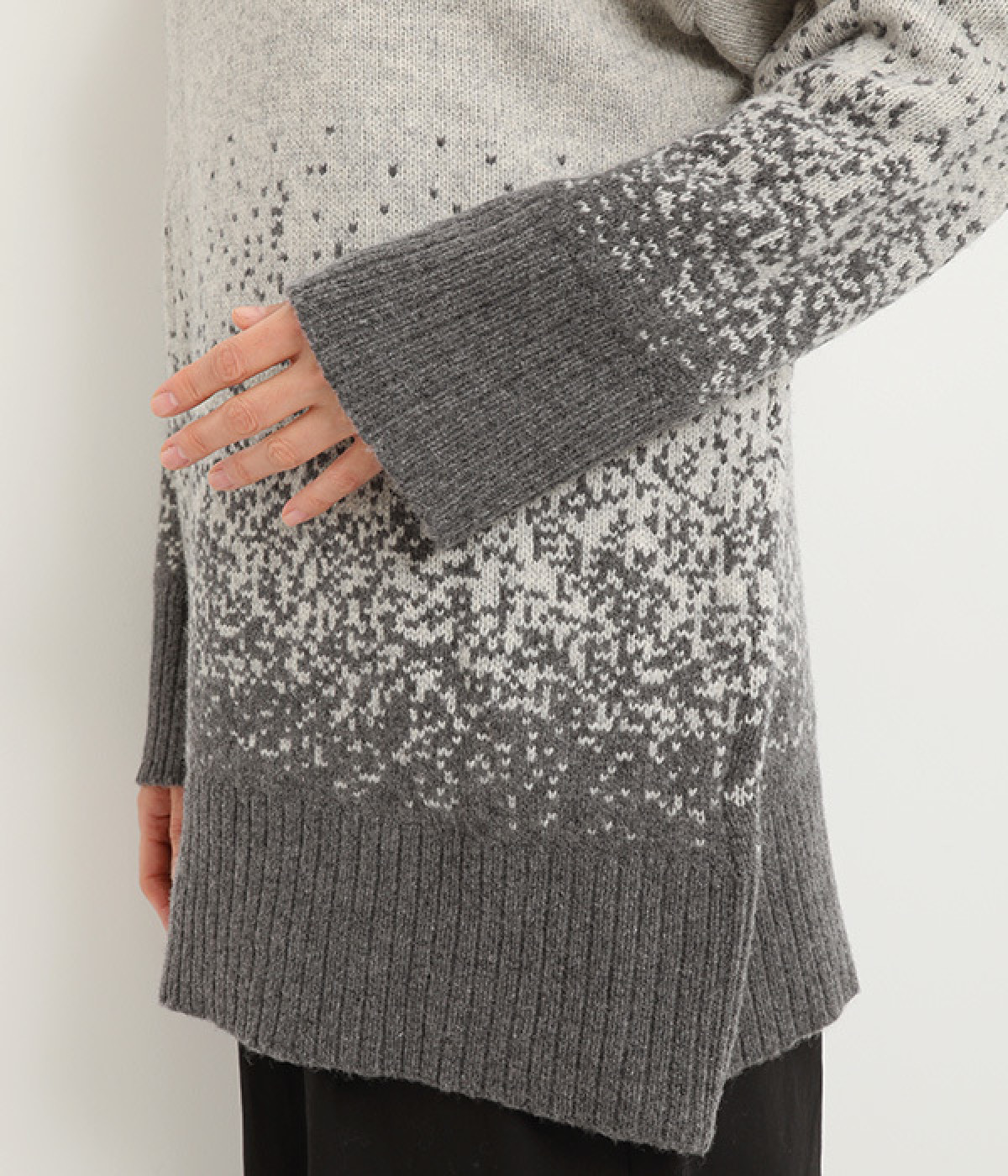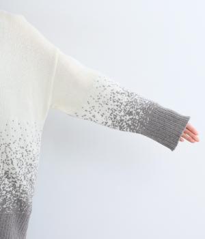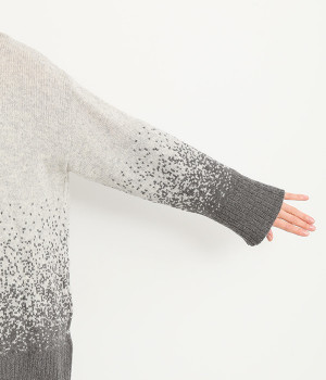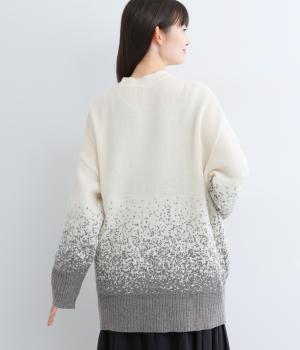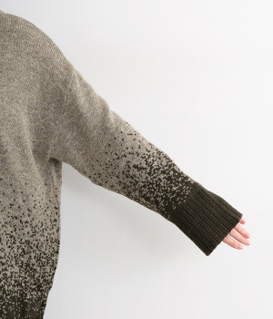 袖口や裾のスタイリッシュなグラデーションデザインがポイント。お尻をすっぽりと隠す長い着丈をすっきりとした印象に見せてくれます。きゅっと詰まった首元が大人らしい上品なムードをプラス。存在感がありつつも合わせるボトムスを選びにくい便利な一枚です。