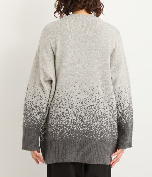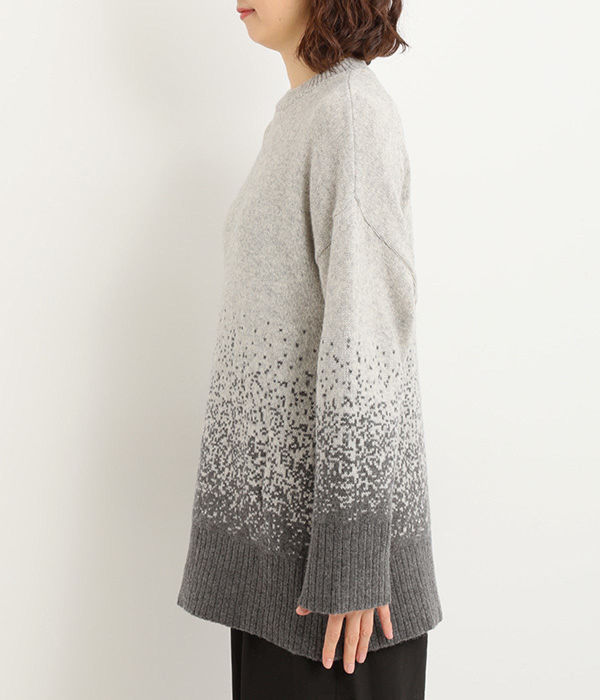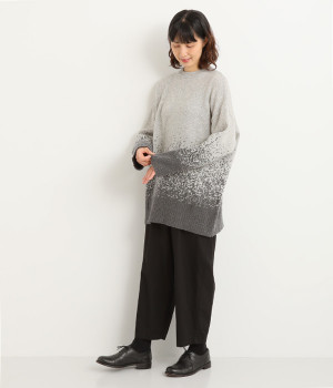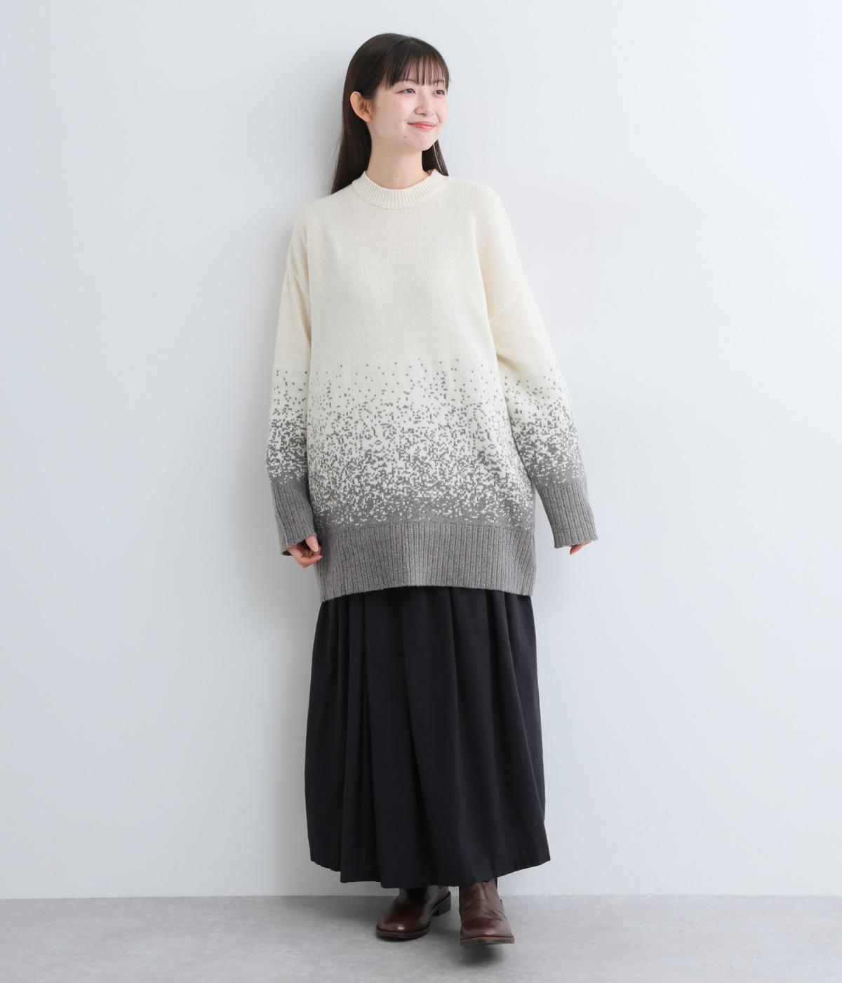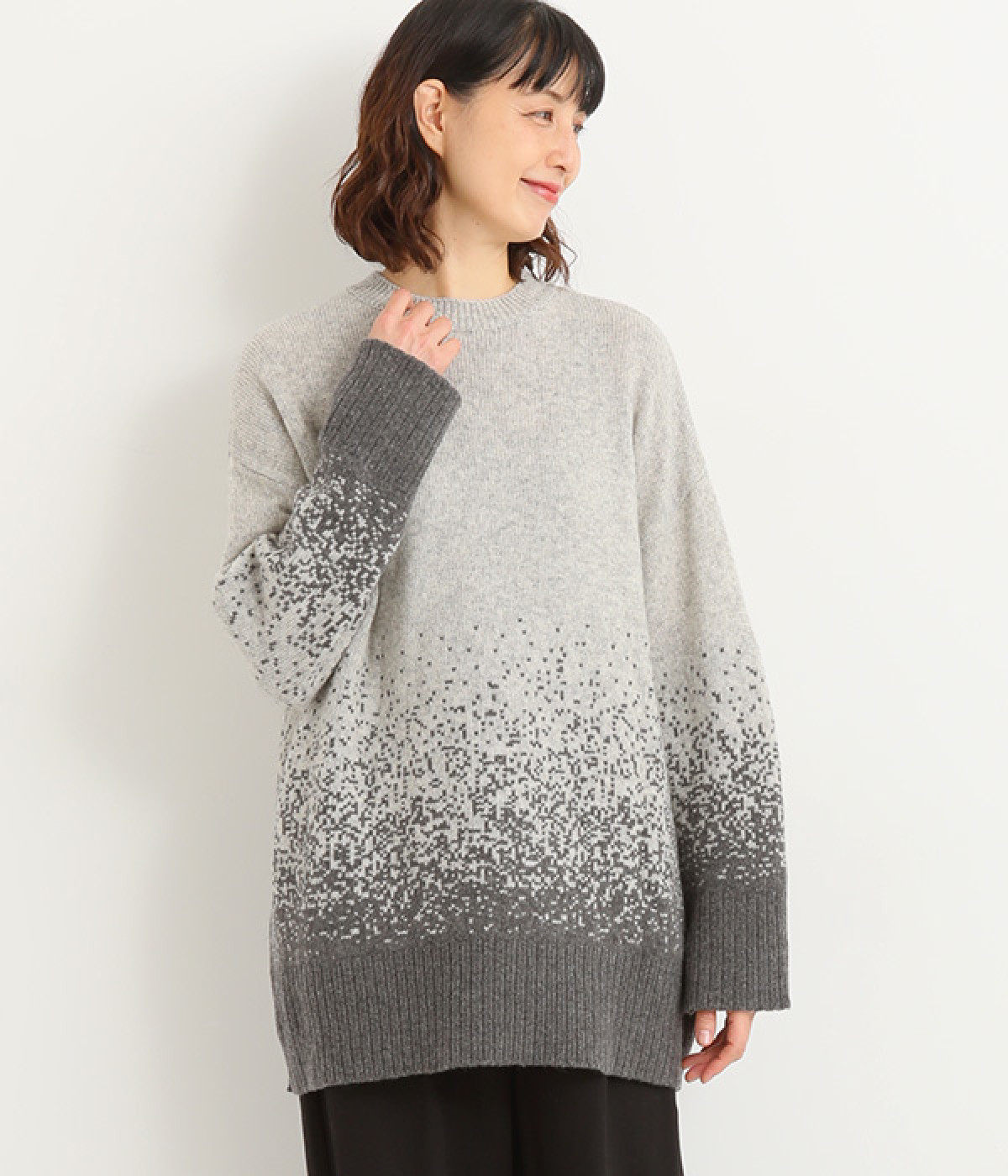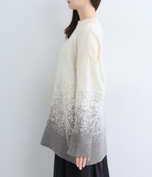 袖口や裾のスタイリッシュなグラデーションデザインがポイント。お尻をすっぽりと隠す長い着丈をすっきりとした印象に見せてくれます。きゅっと詰まった首元が大人らしい上品なムードをプラス。存在感がありつつも合わせるボトムスを選びにくい便利な一枚です。