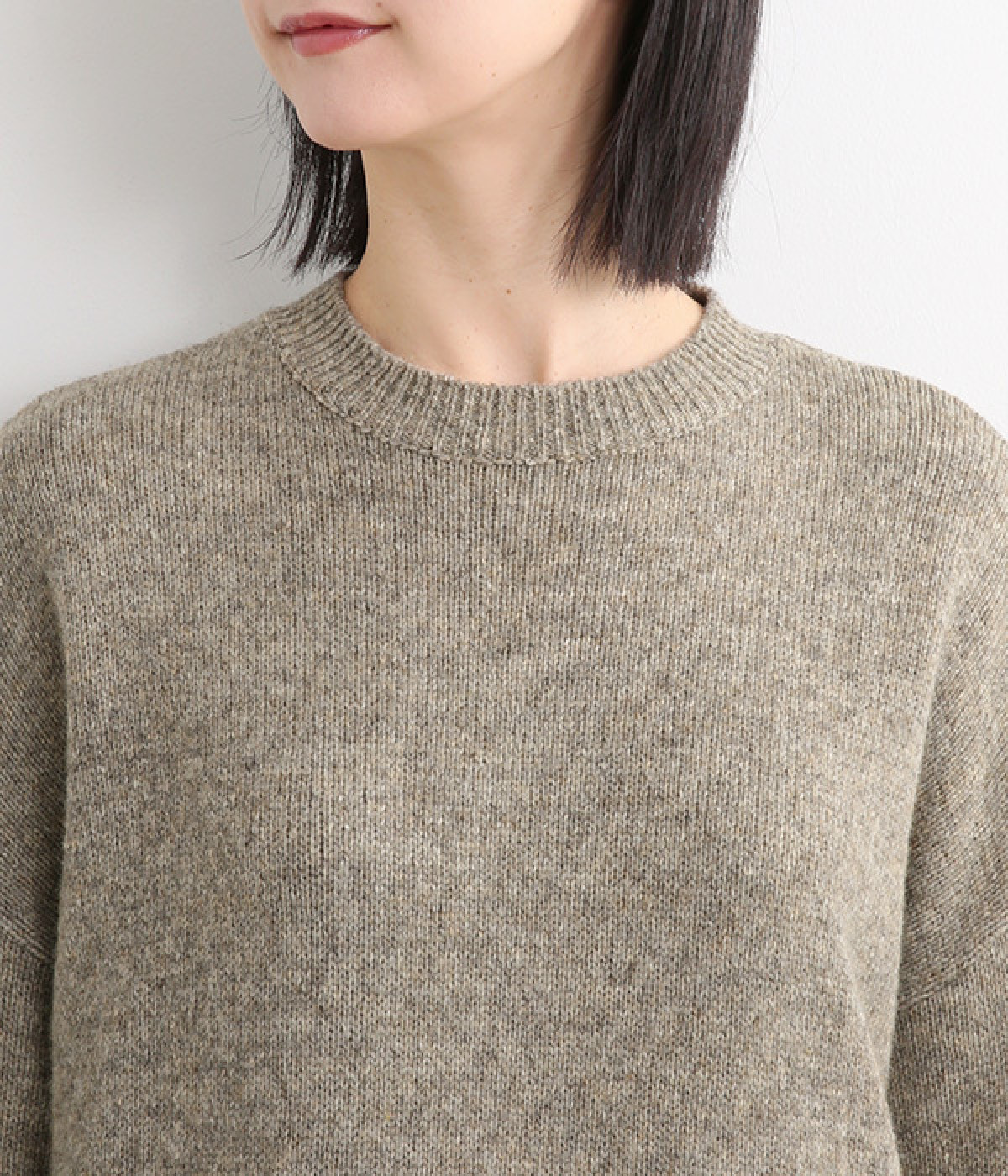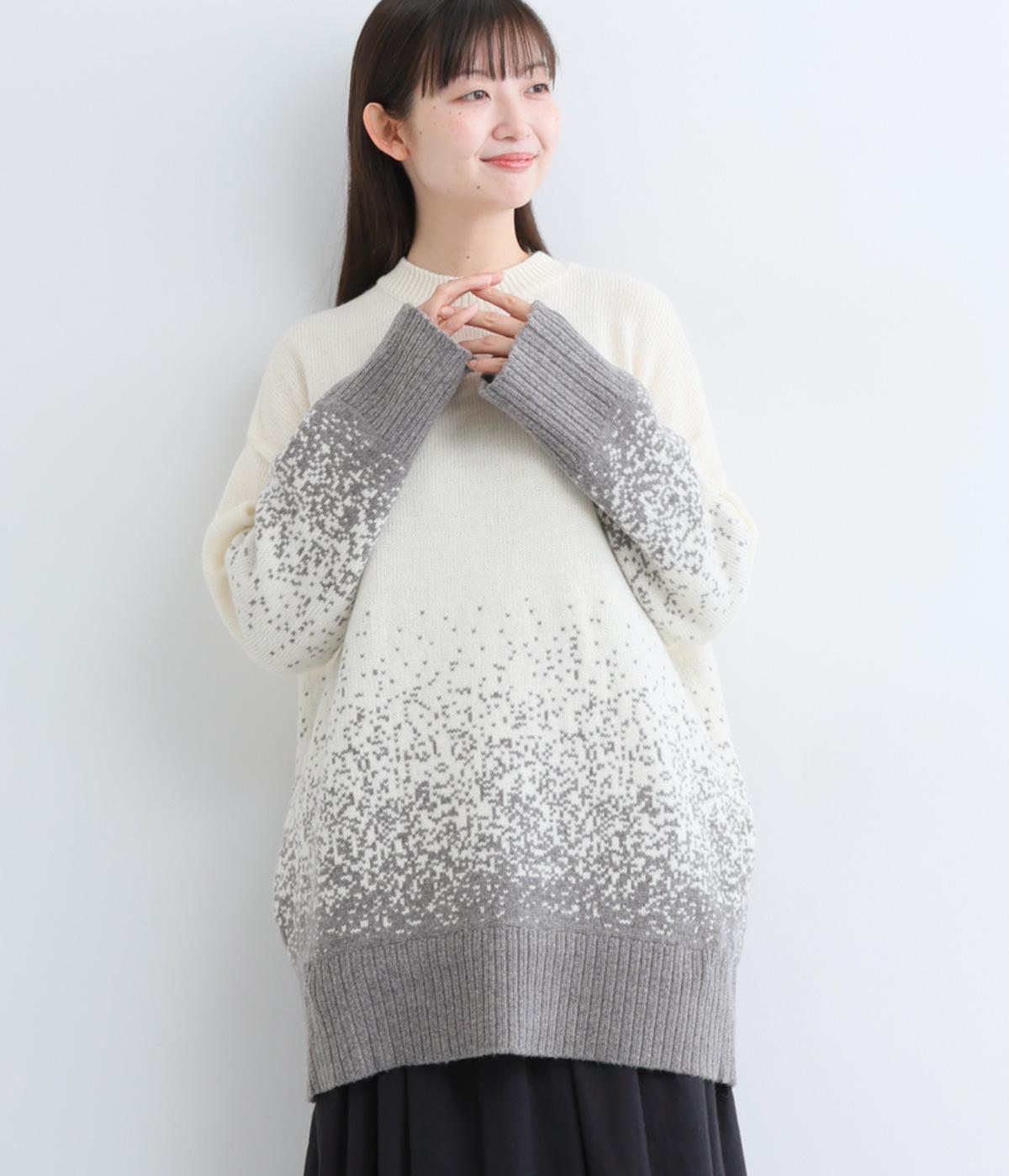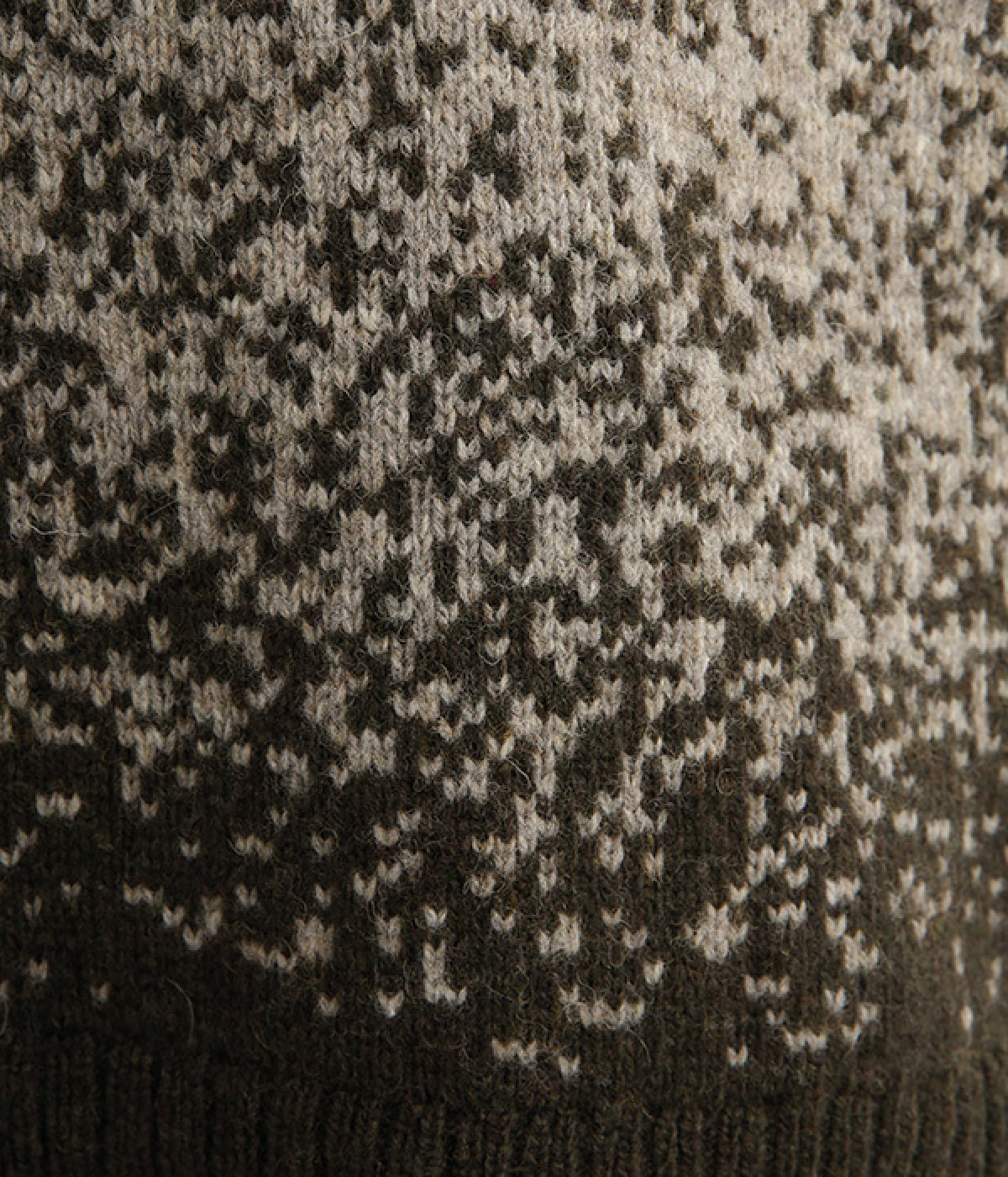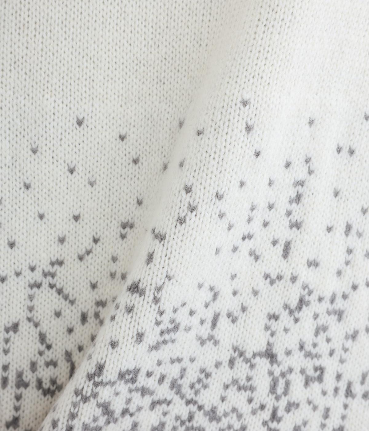 ウールをメインに混紡した保温性の高いニットです。柄部分に自然と厚みが出るので、お腹や腰まわりはよりあたたかな着用感。フラットな編地でほっこり感を軽減した大人らしい印象に仕上げました。