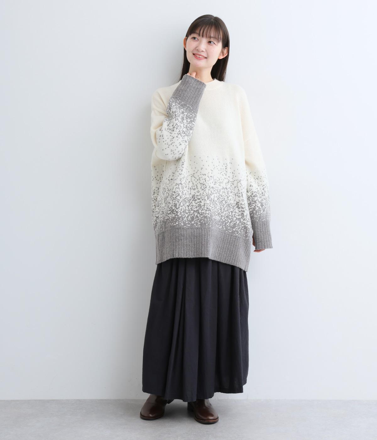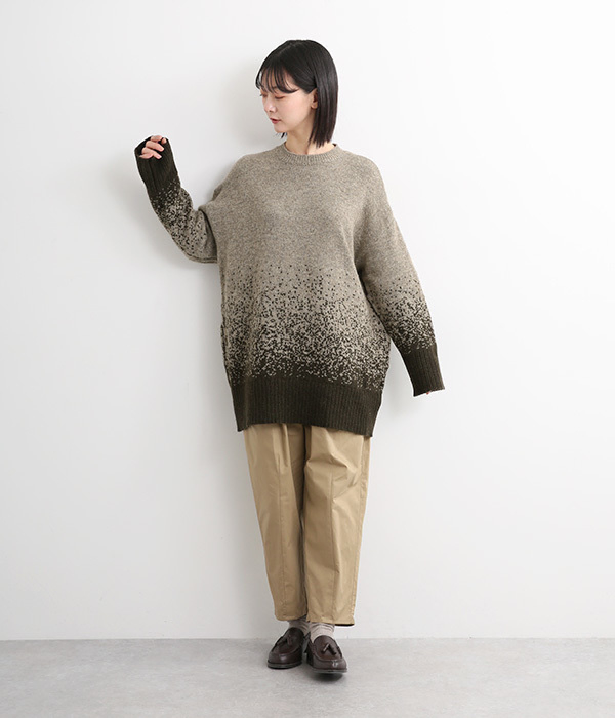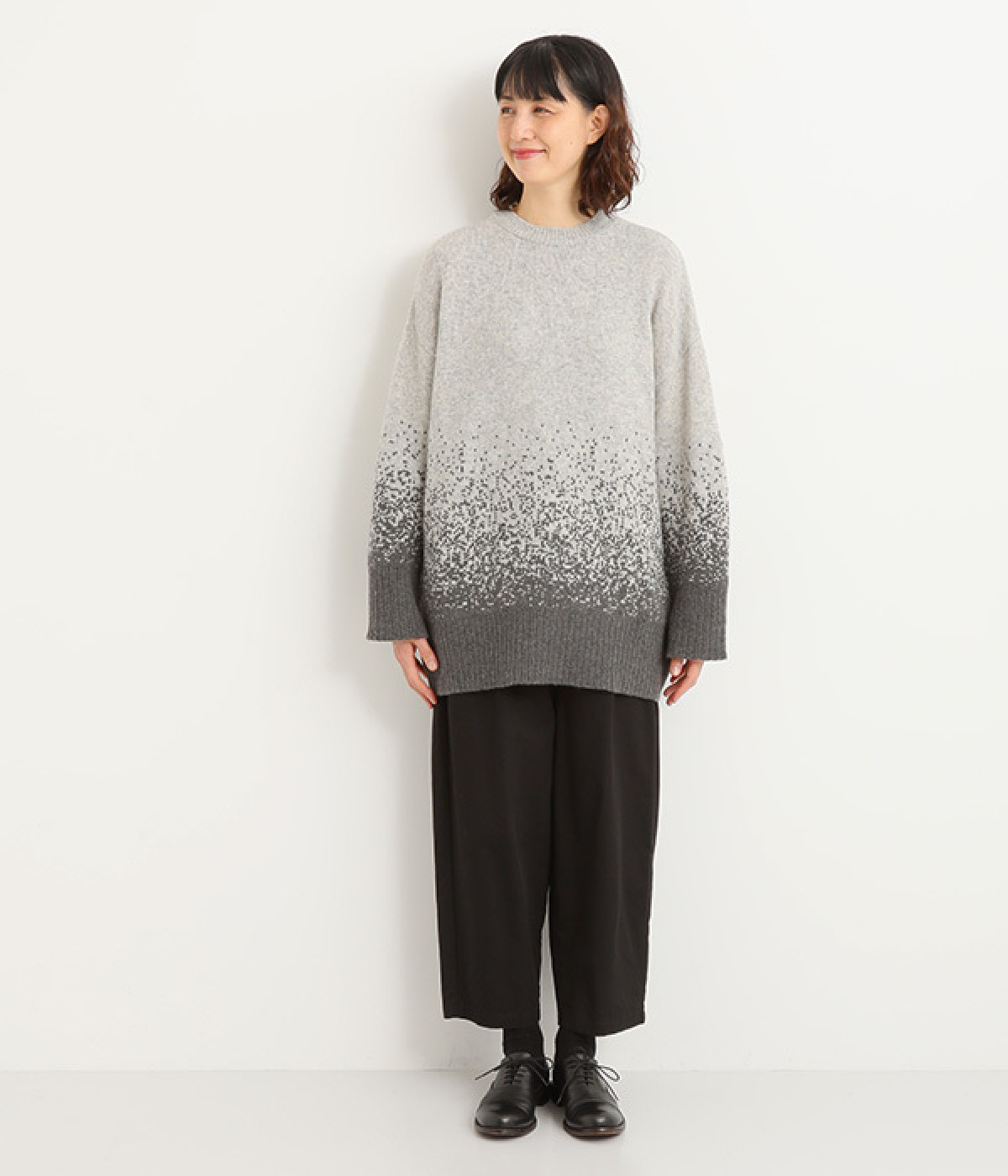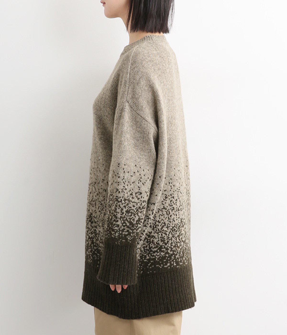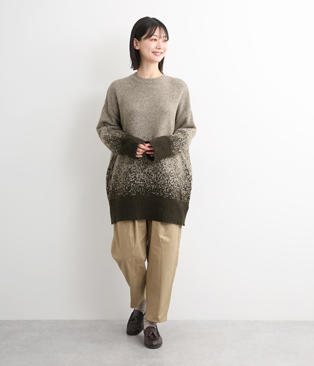 ウールをメインに混紡した保温性の高いニットです。柄部分に自然と厚みが出るので、お腹や腰まわりはよりあたたかな着用感。フラットな編地でほっこり感を軽減した大人らしい印象に仕上げました。