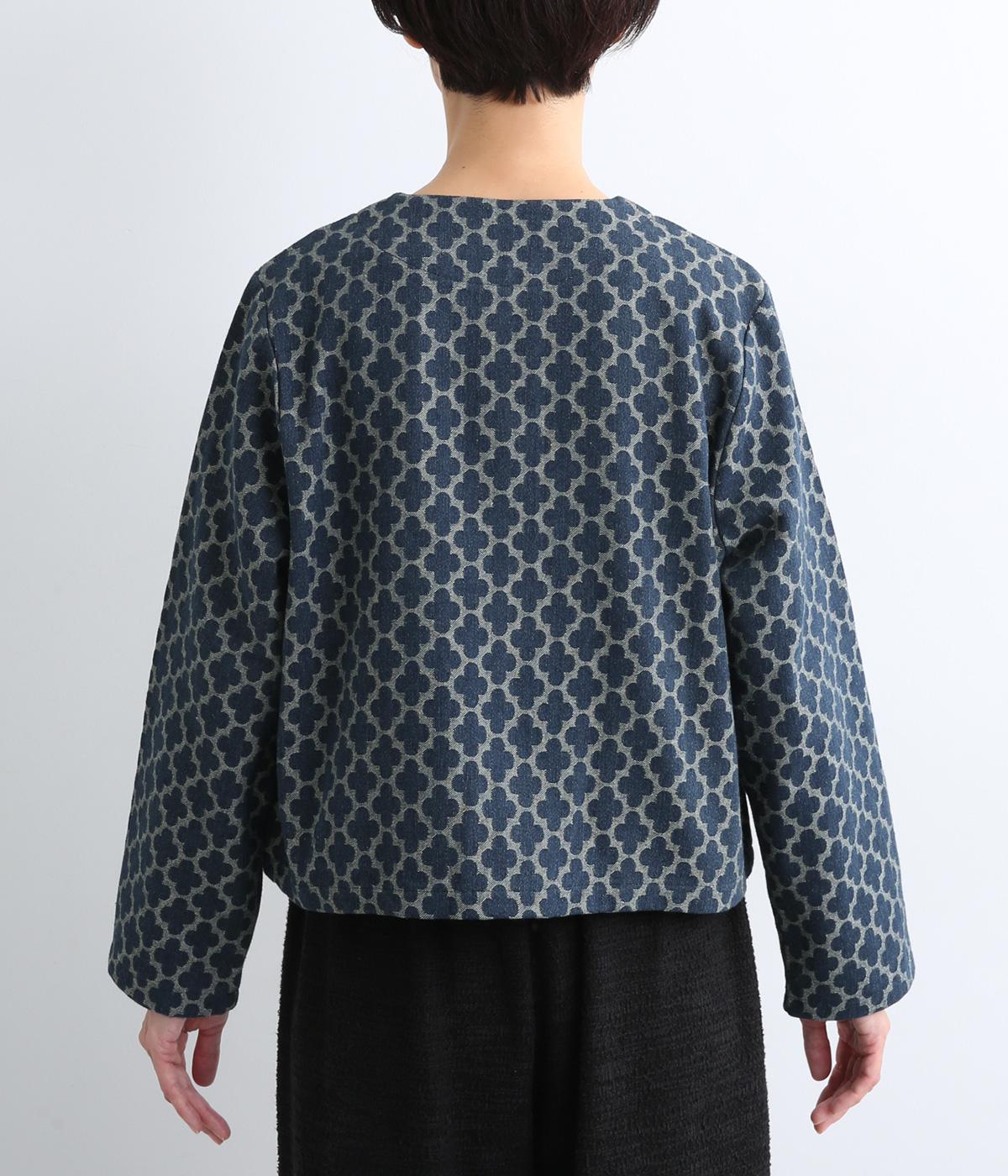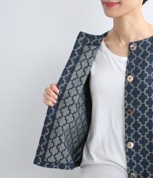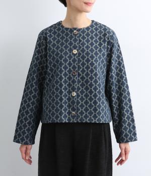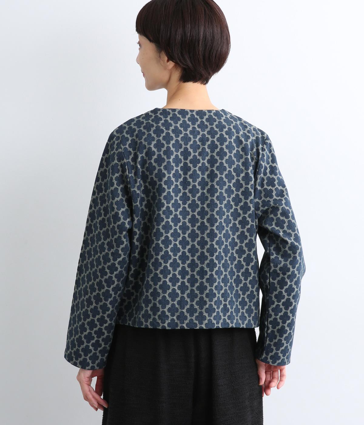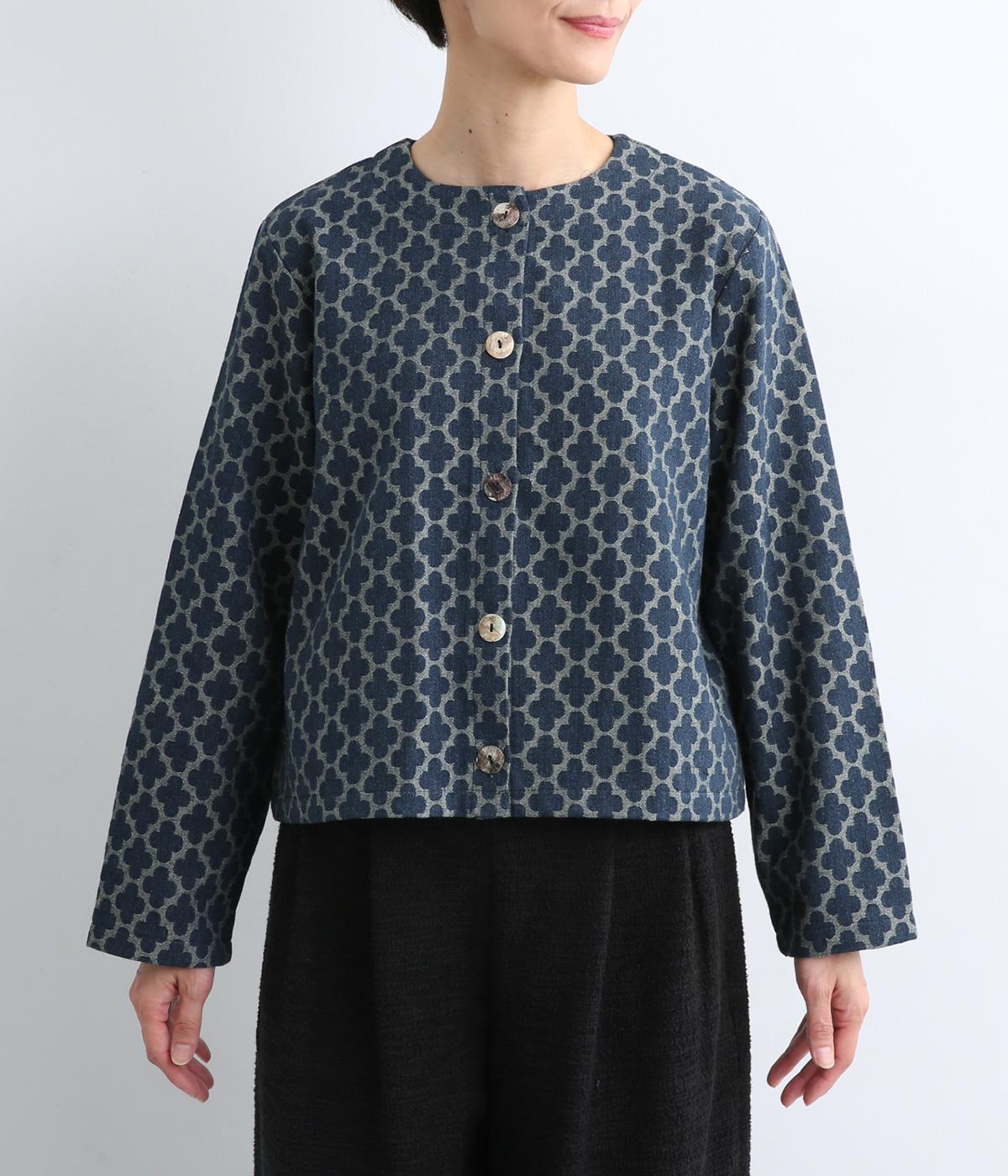 デニムのカジュアルさをおさえた上品なジャカード織りジャケット。ひとつひとつ表情の異なる大きめのシェルボタンをアクセントにしています。コンパクトな着丈でボリュームのあるボトムスにも好相性。サイドには便利なポケットつきです。