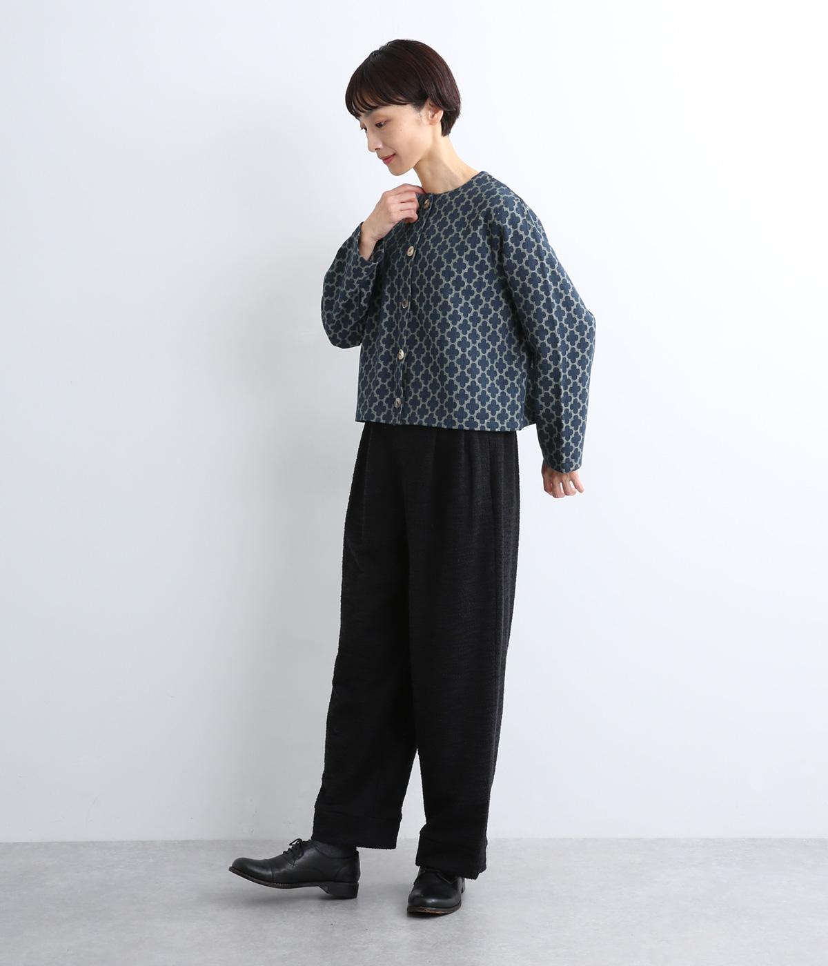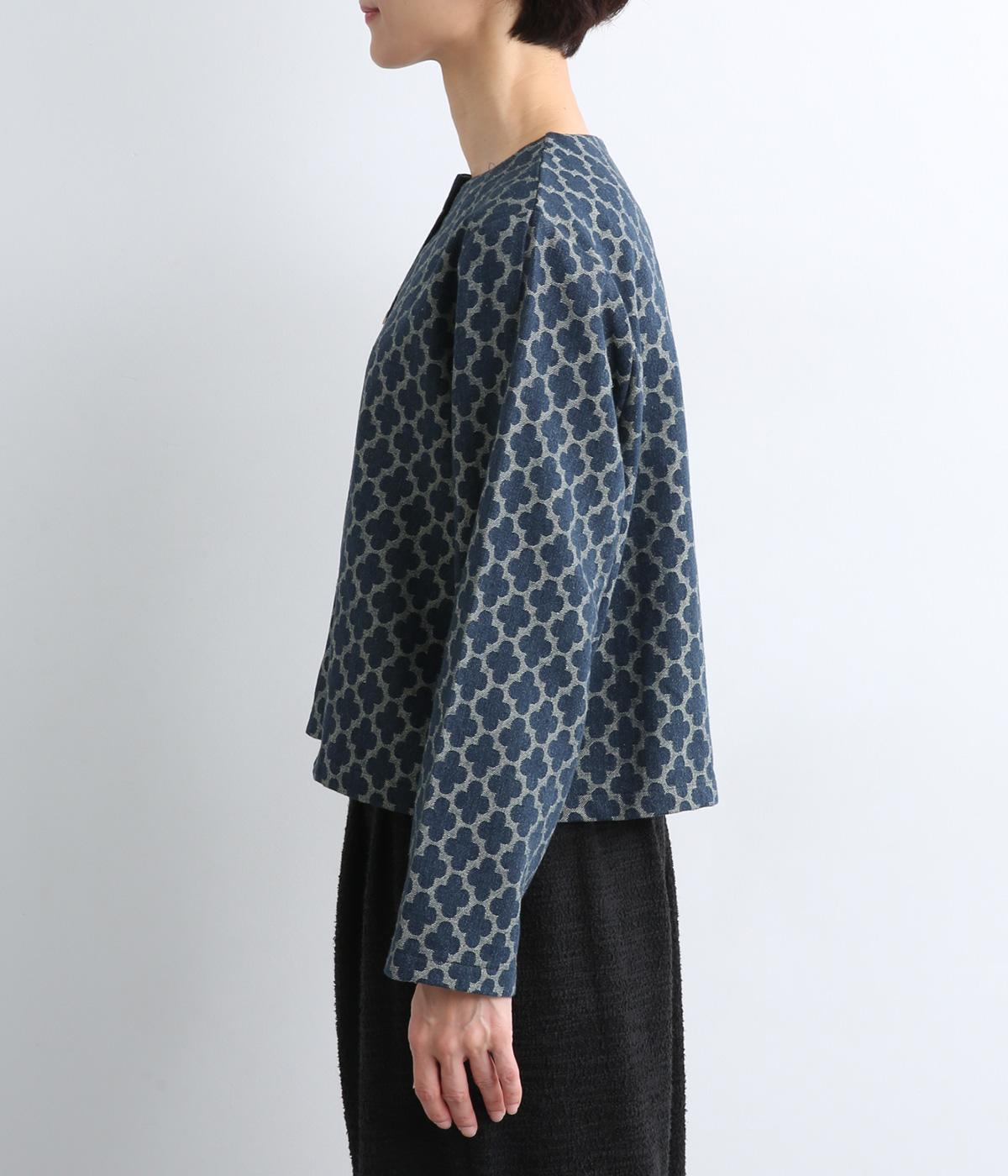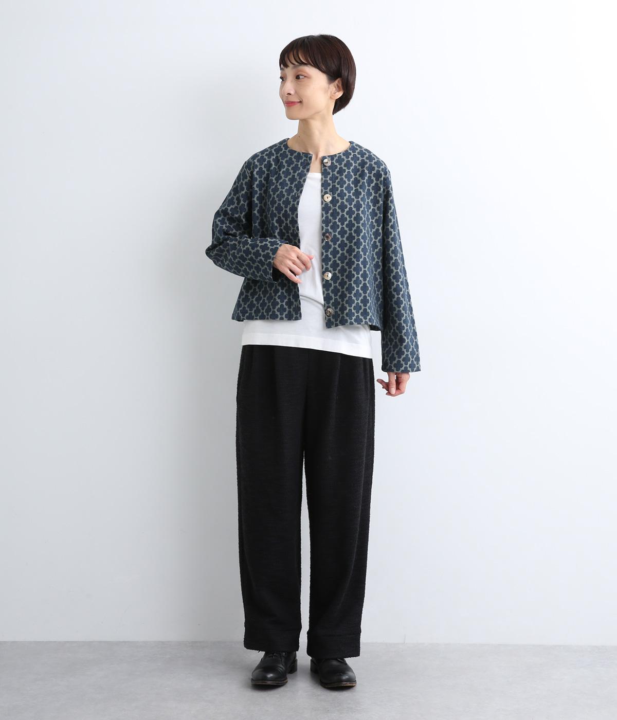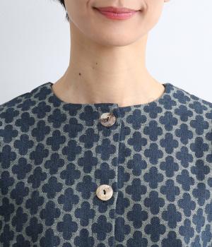 デニムのカジュアルさをおさえた上品なジャカード織りジャケット。ひとつひとつ表情の異なる大きめのシェルボタンをアクセントにしています。コンパクトな着丈でボリュームのあるボトムスにも好相性。サイドには便利なポケットつきです。