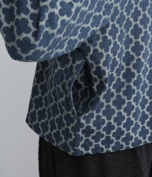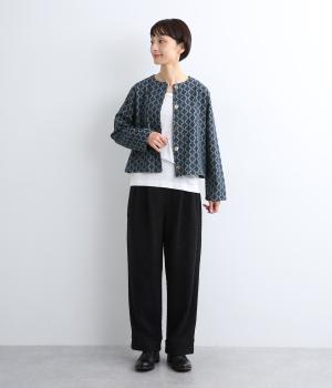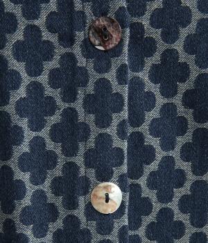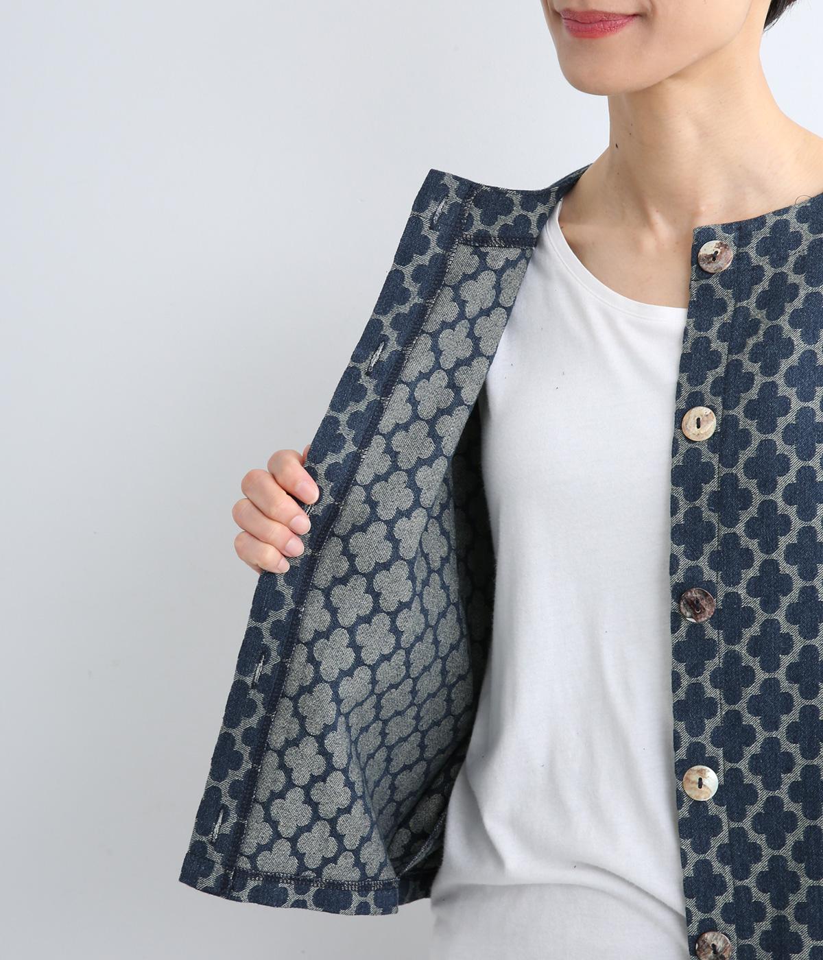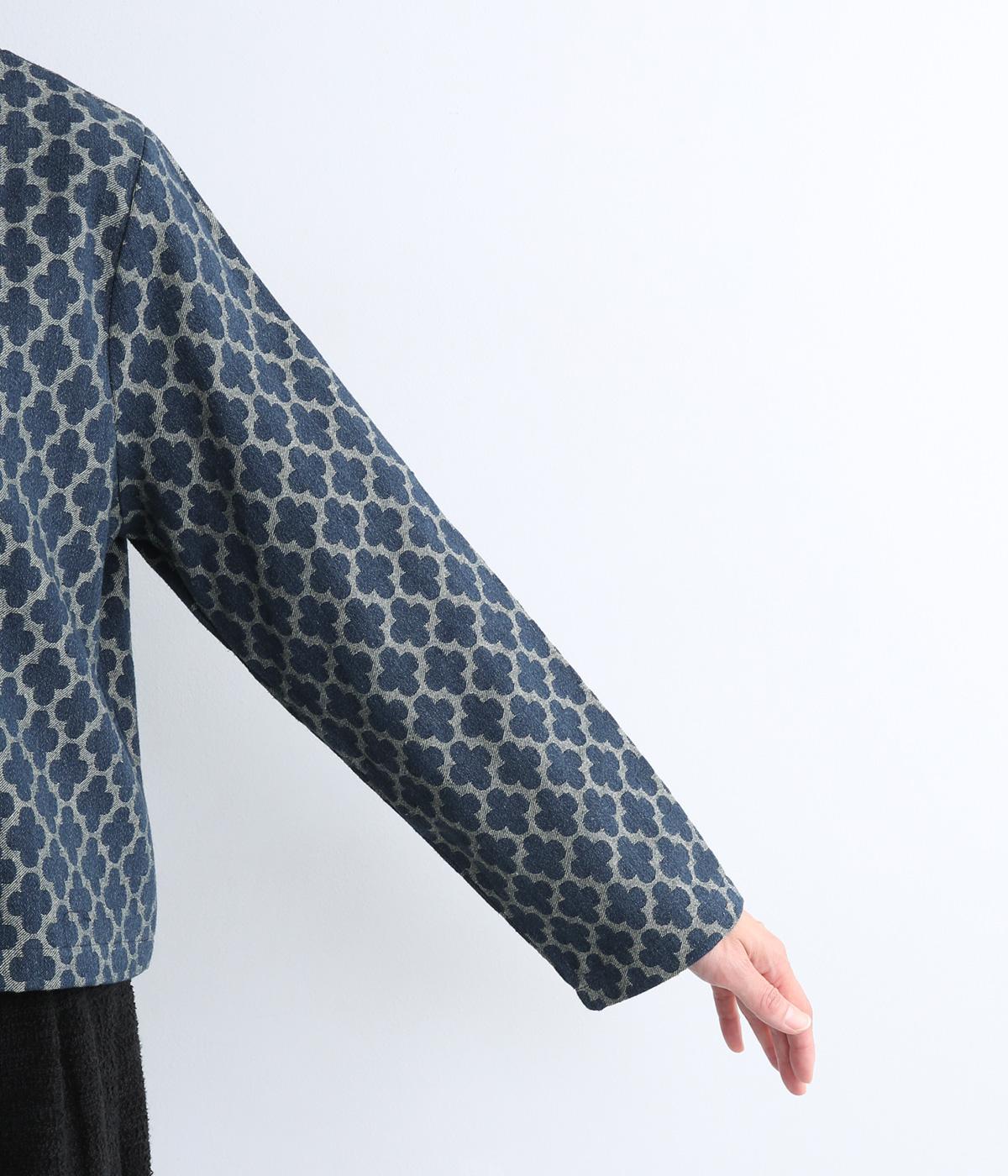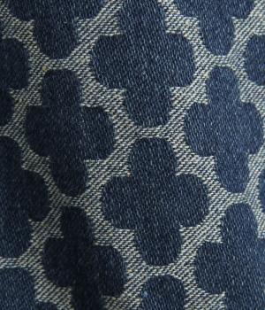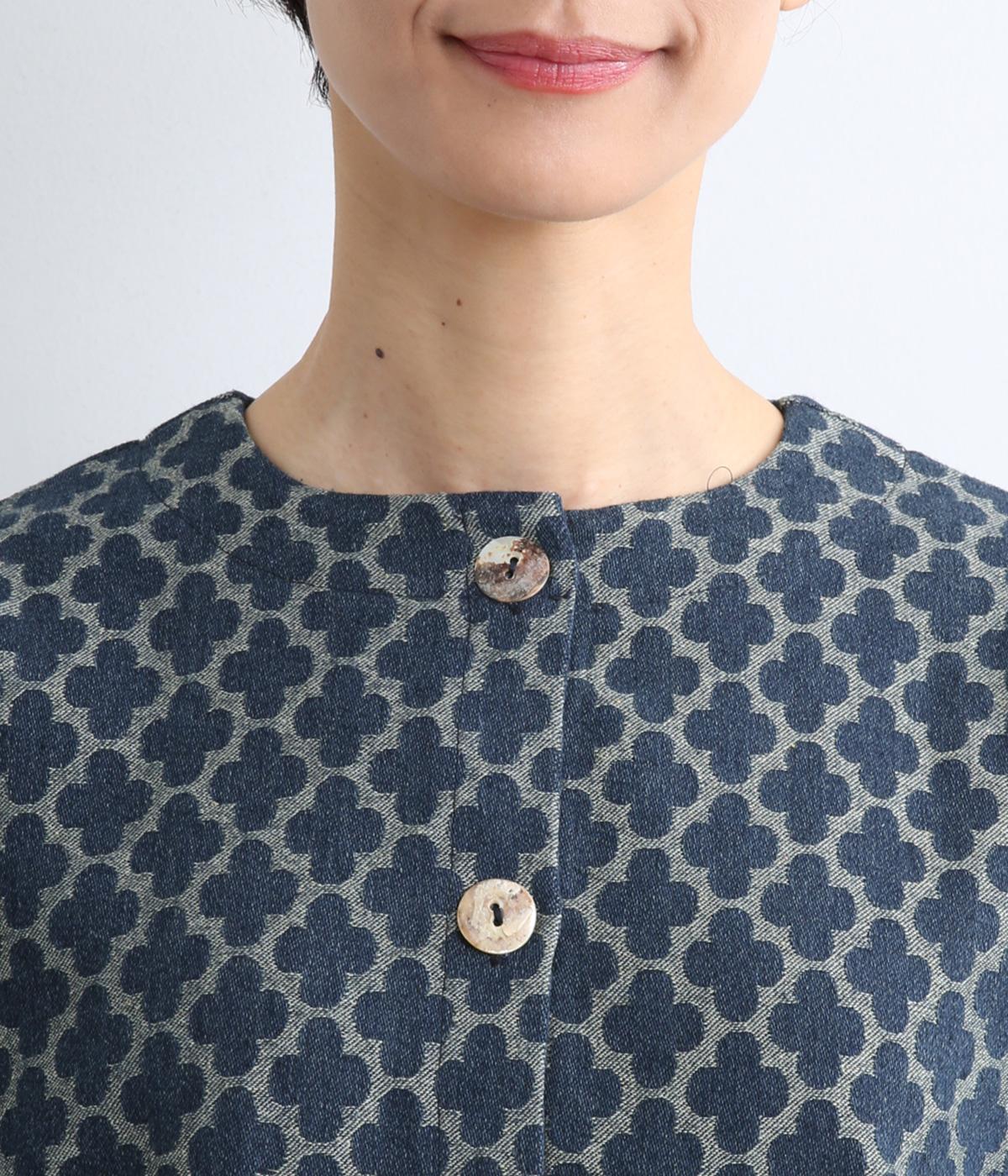 モノグラムのように端正にフラワー柄を並べたジャカード生地。適度なハリとやわらかさを持ちあわせた軽やかなコットン混デニム素材で、ストレスフリーに着用できます。