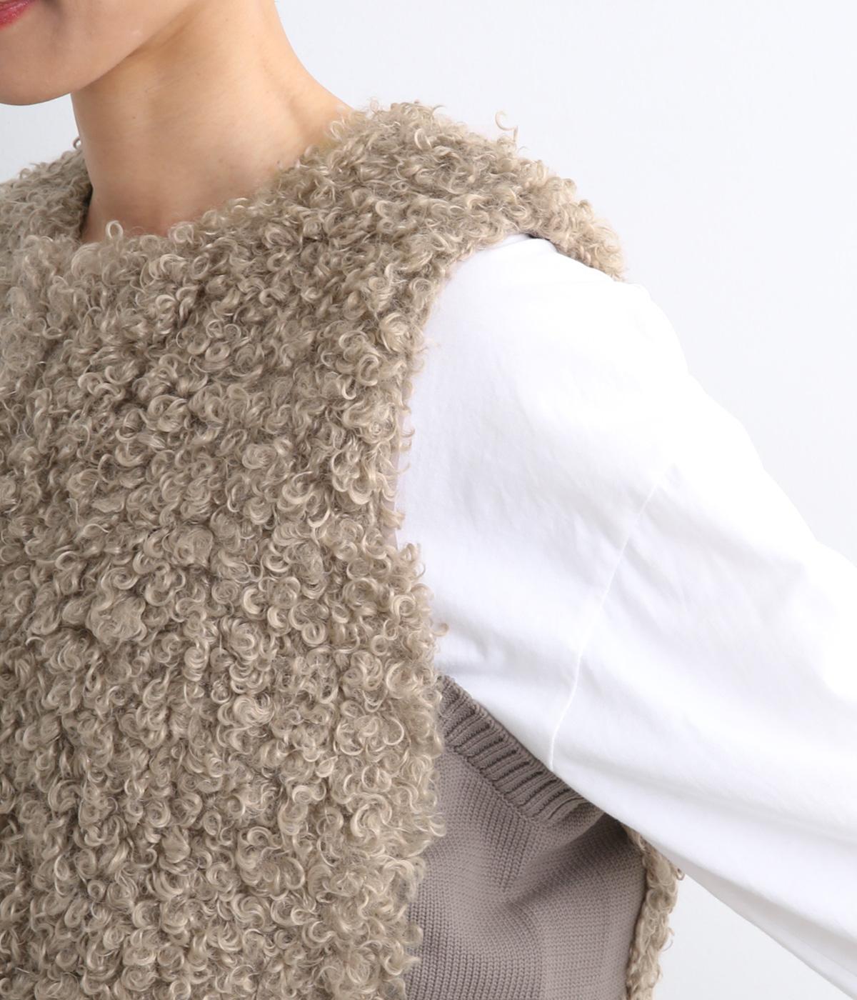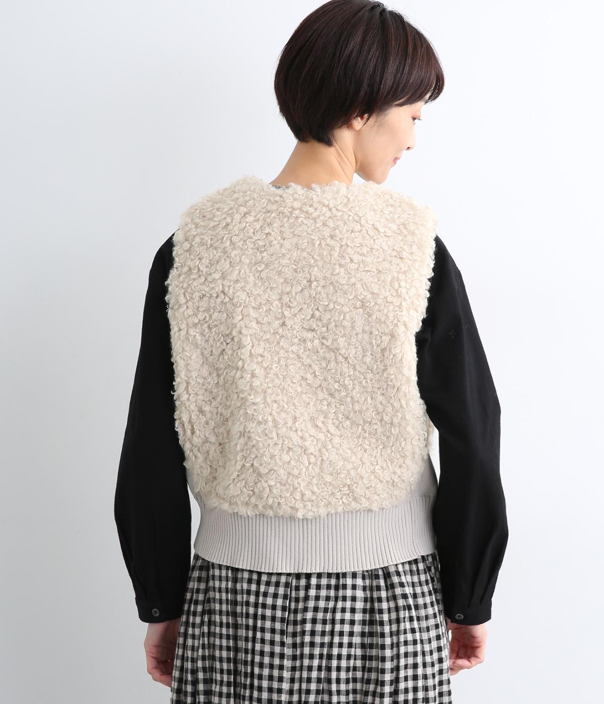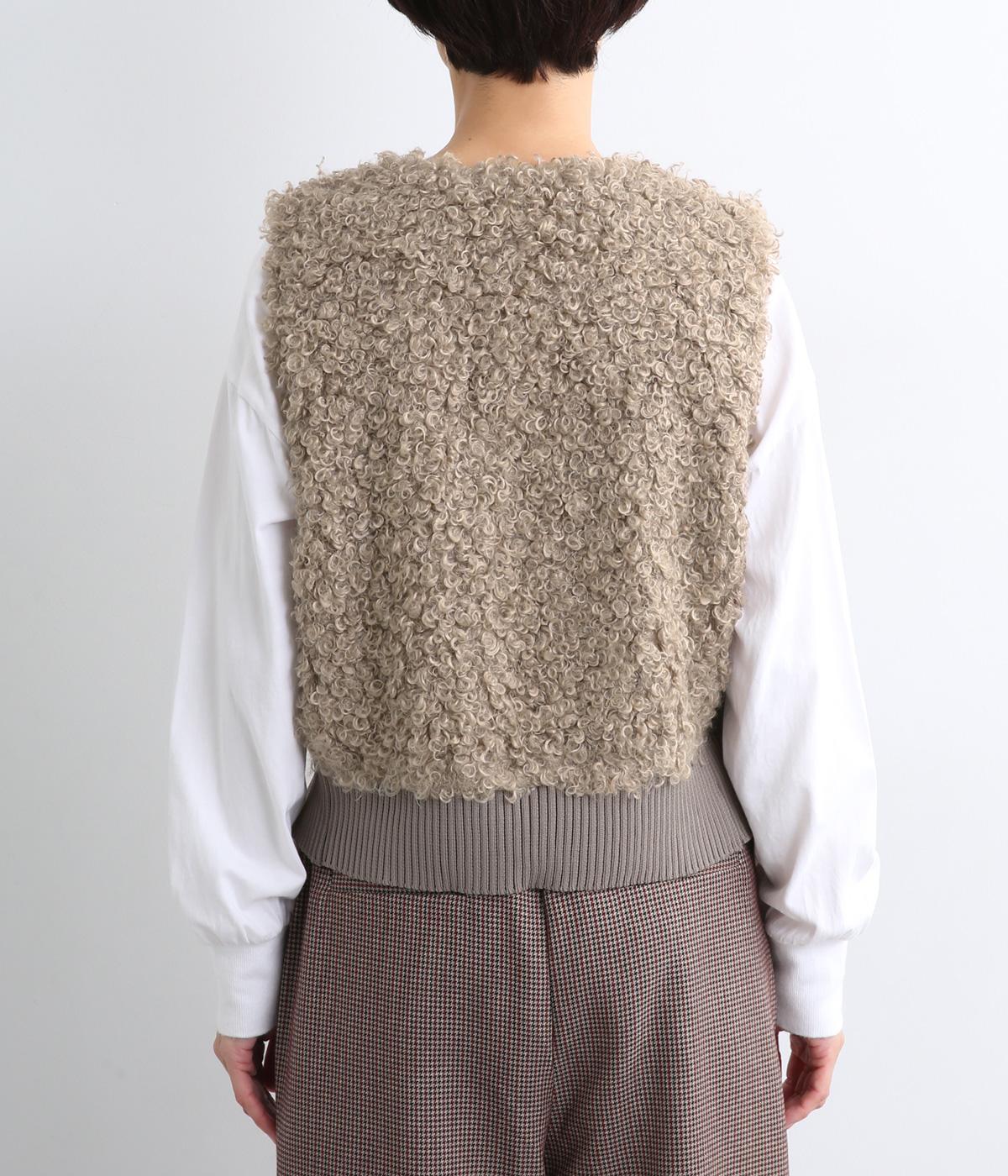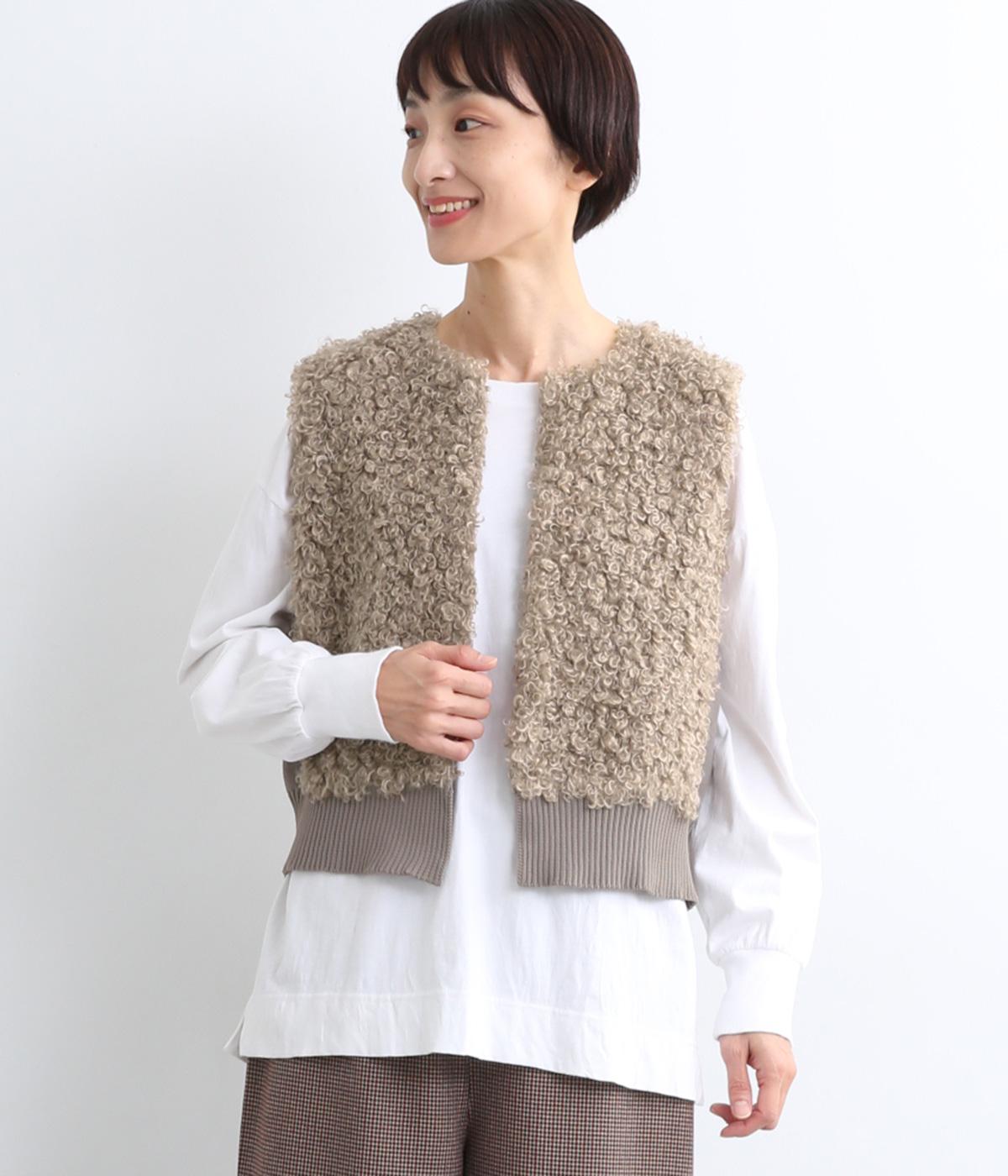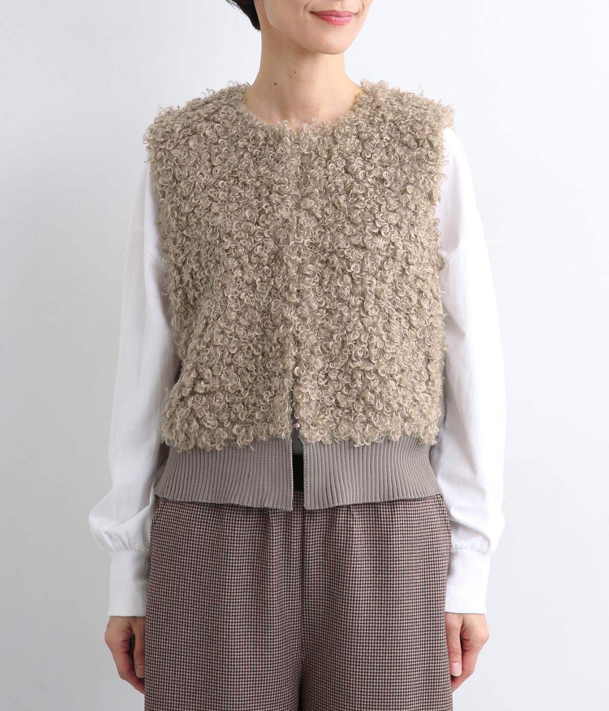 くるんとカールした毛が愛らしいボア素材のベスト。サイドと裾にはニット生地をプラスして全体のボリューム感を整えています。すっきりとした短めの着丈も好バランス。フロントはフック仕様で、閉じても開けたままでもサマ見えします。