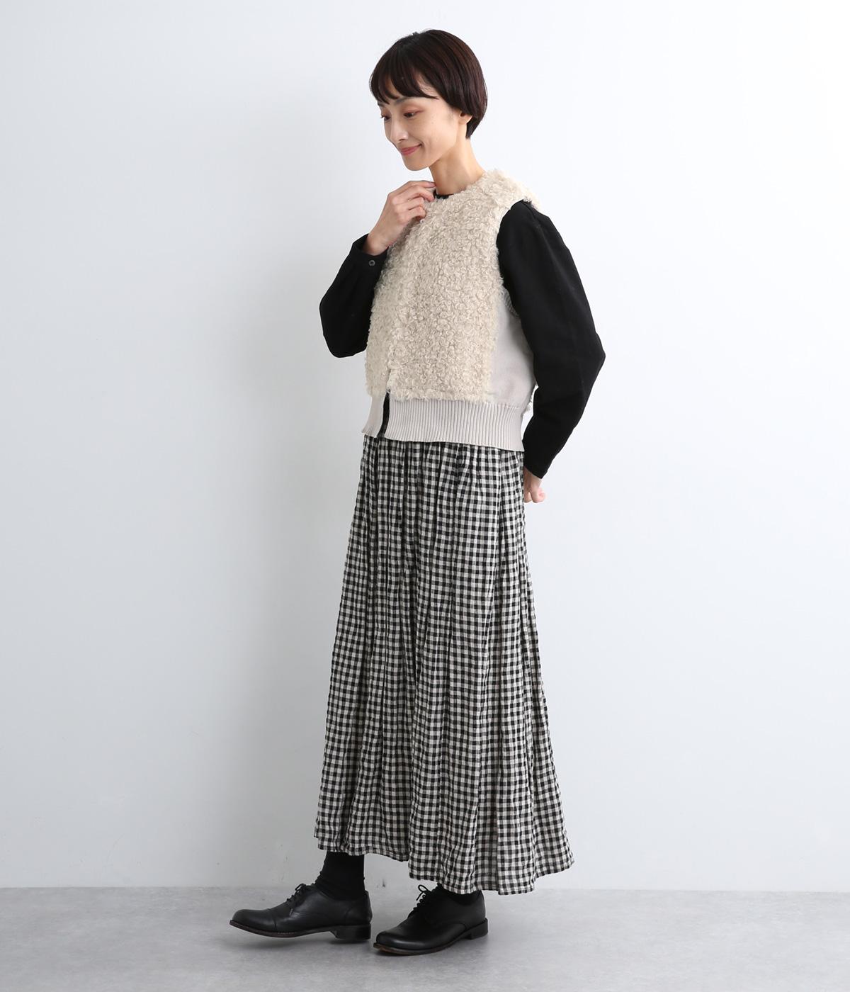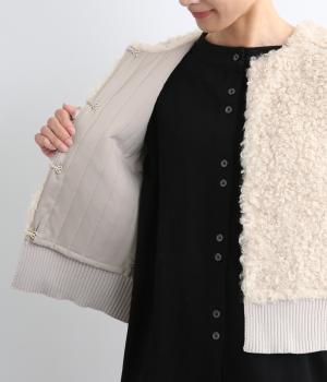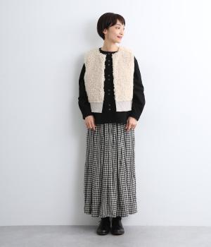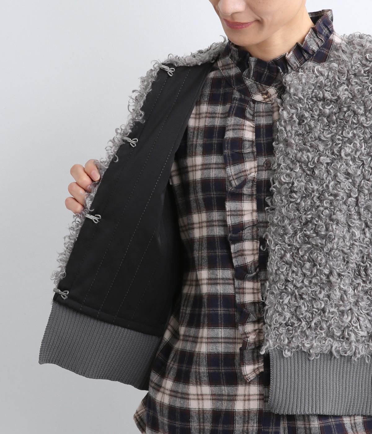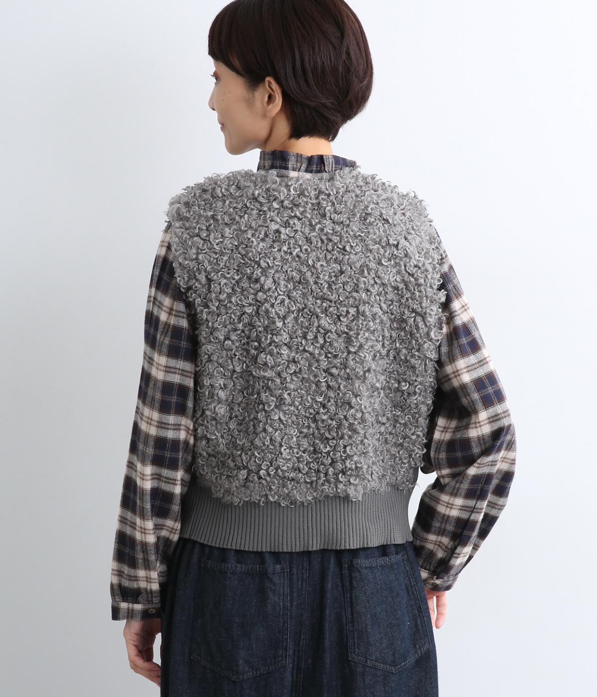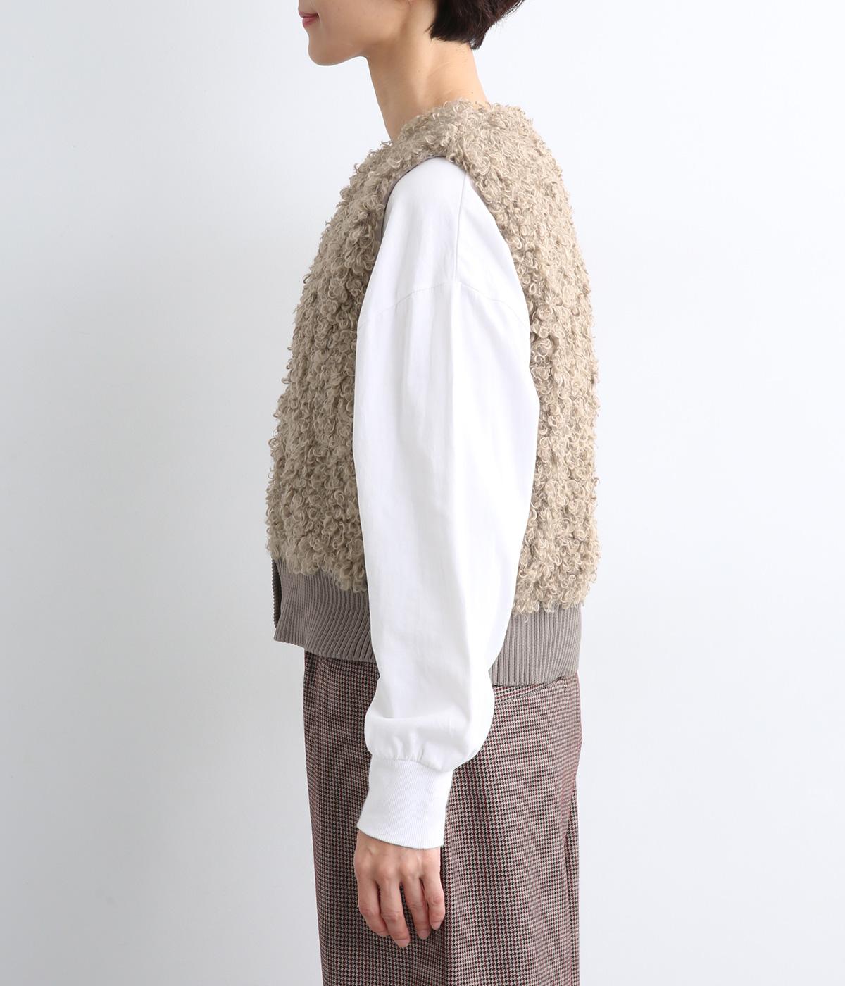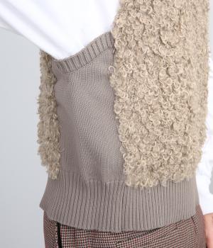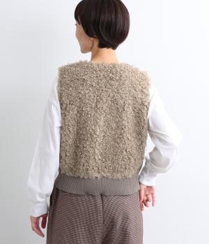 くるんとカールした毛が愛らしいボア素材のベスト。サイドと裾にはニット生地をプラスして全体のボリューム感を整えています。すっきりとした短めの着丈も好バランス。フロントはフック仕様で、閉じても開けたままでもサマ見えします。