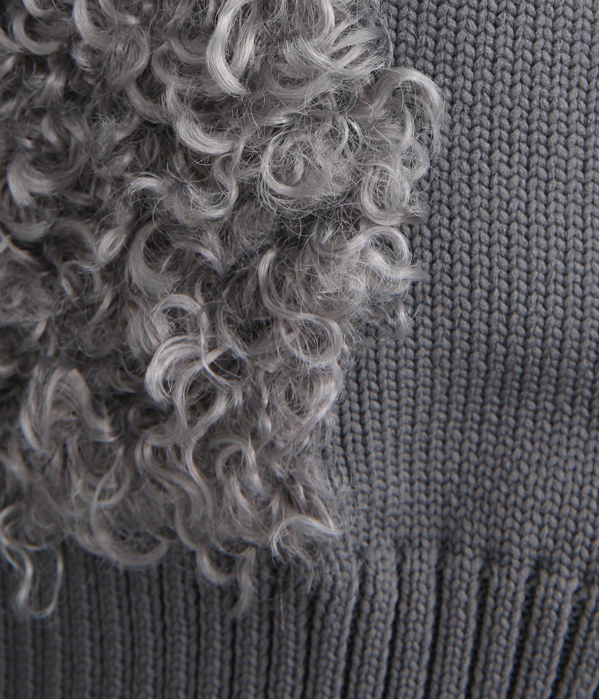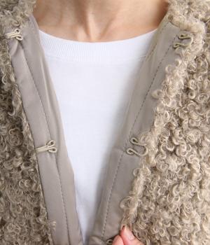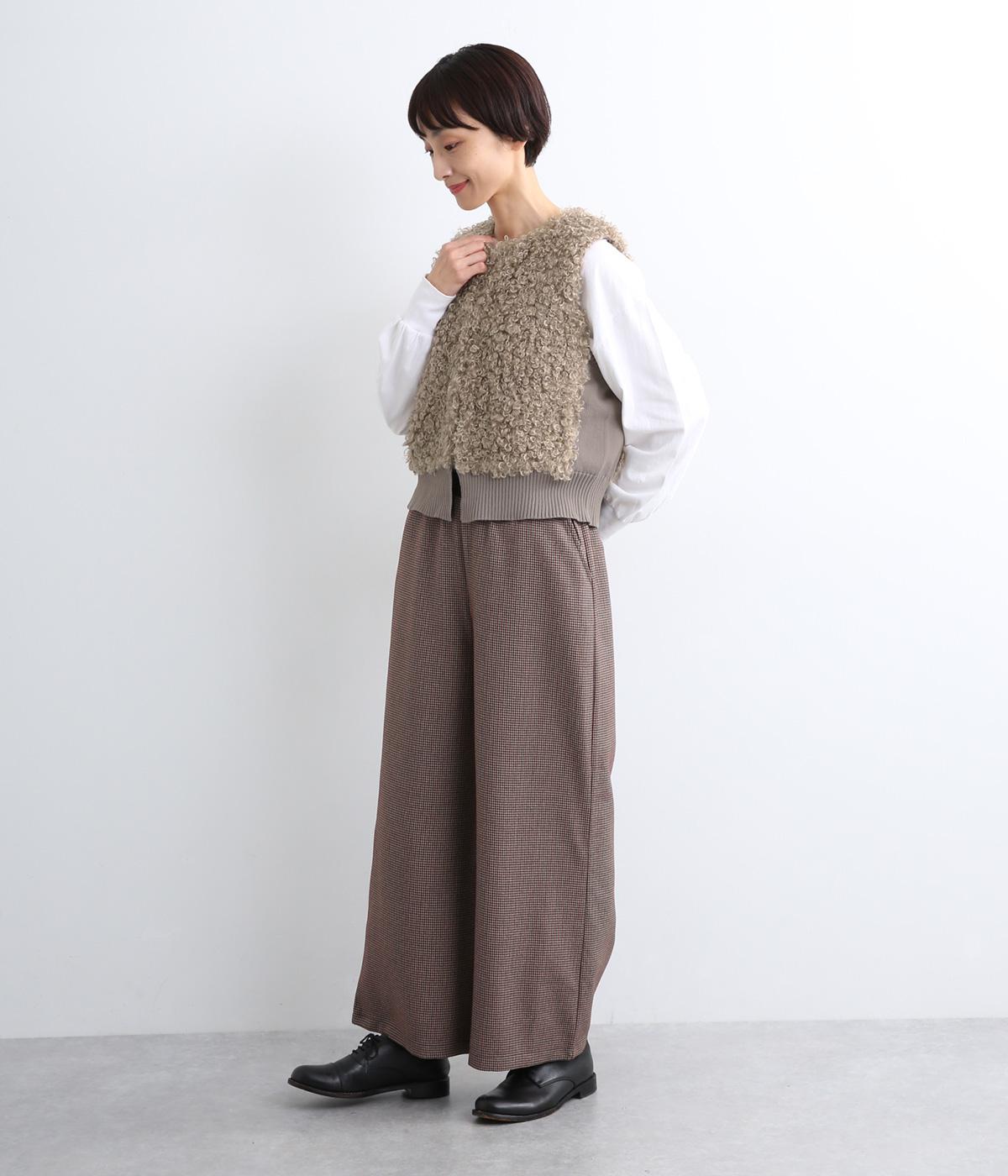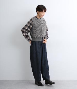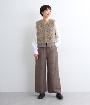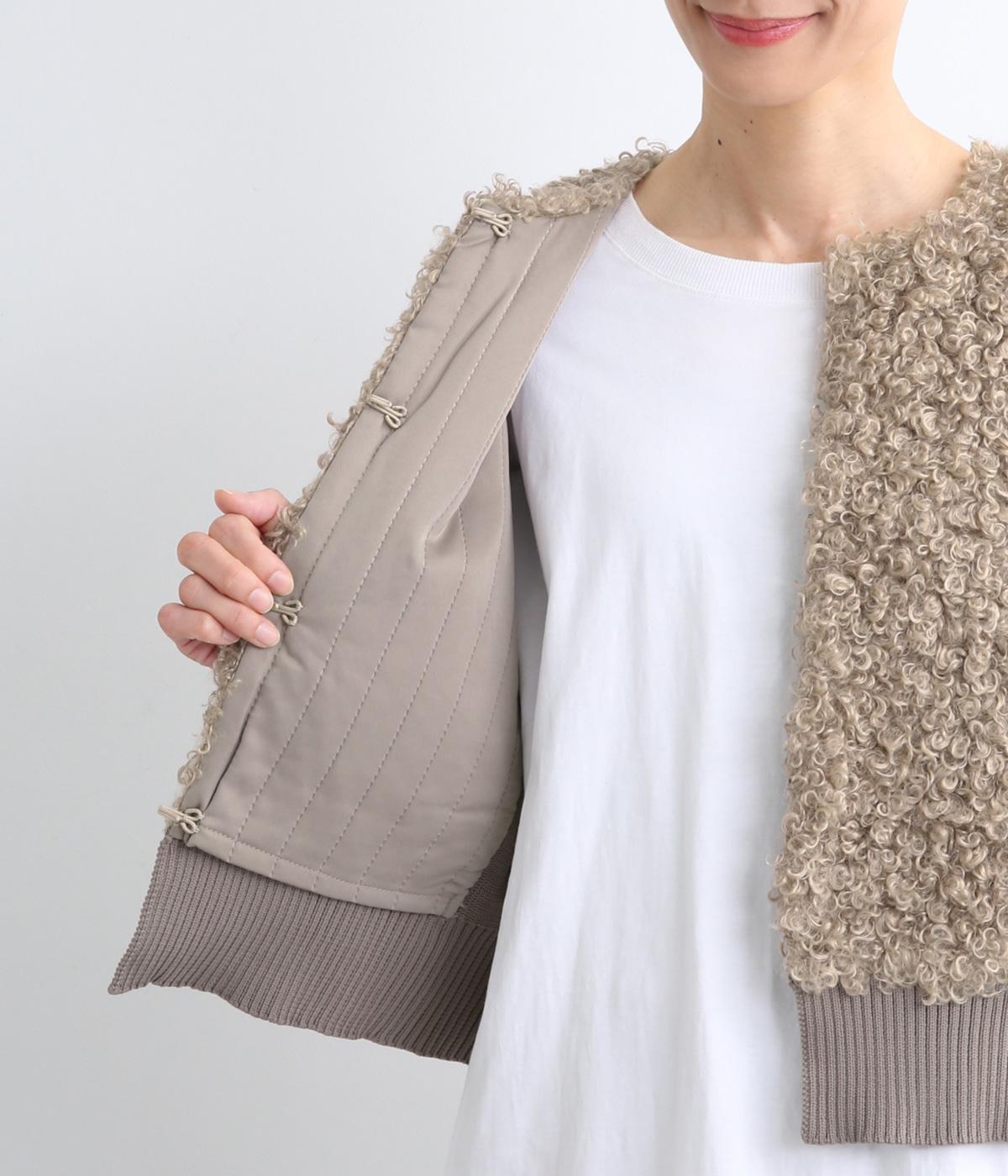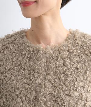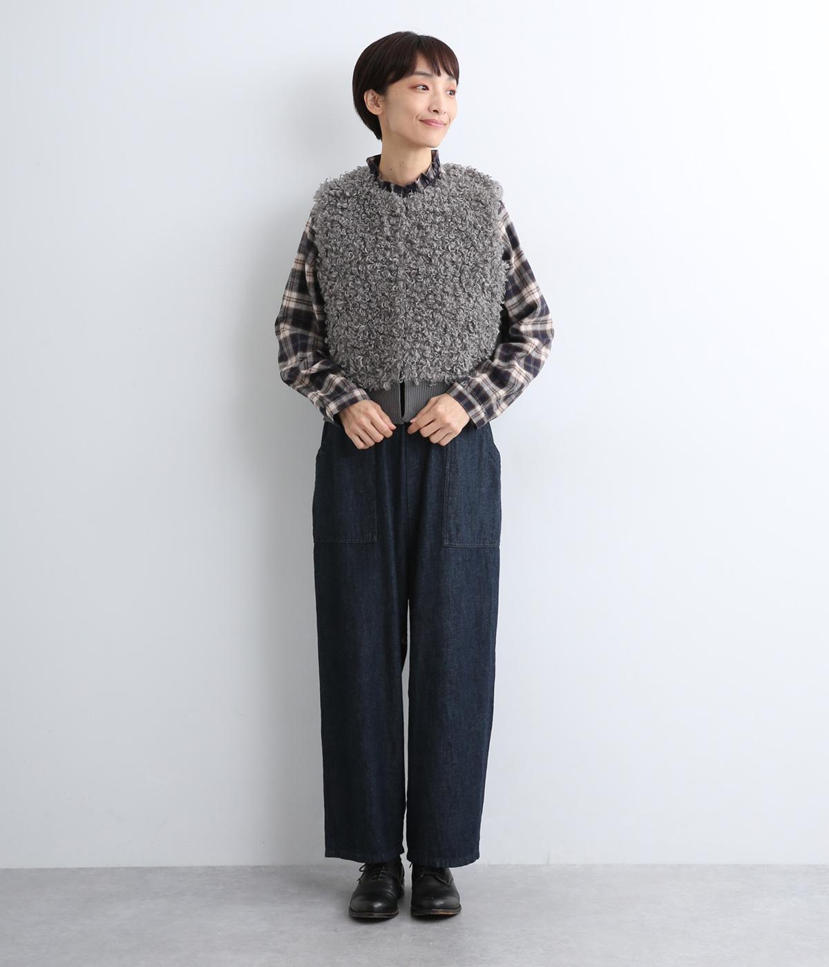 くるんとカールした毛が愛らしいボア素材のベスト。サイドと裾にはニット生地をプラスして全体のボリューム感を整えています。すっきりとした短めの着丈も好バランス。フロントはフック仕様で、閉じても開けたままでもサマ見えします。