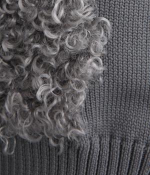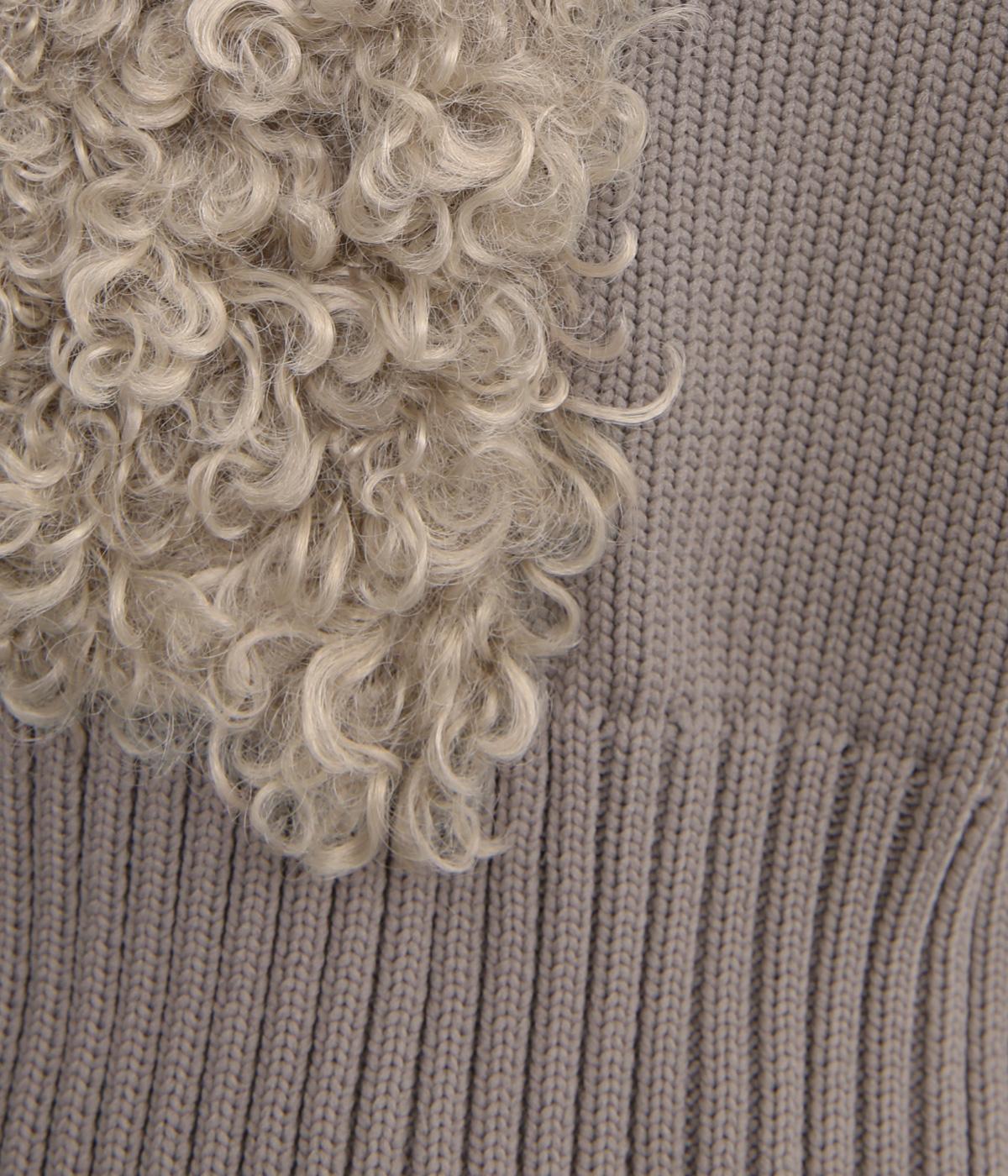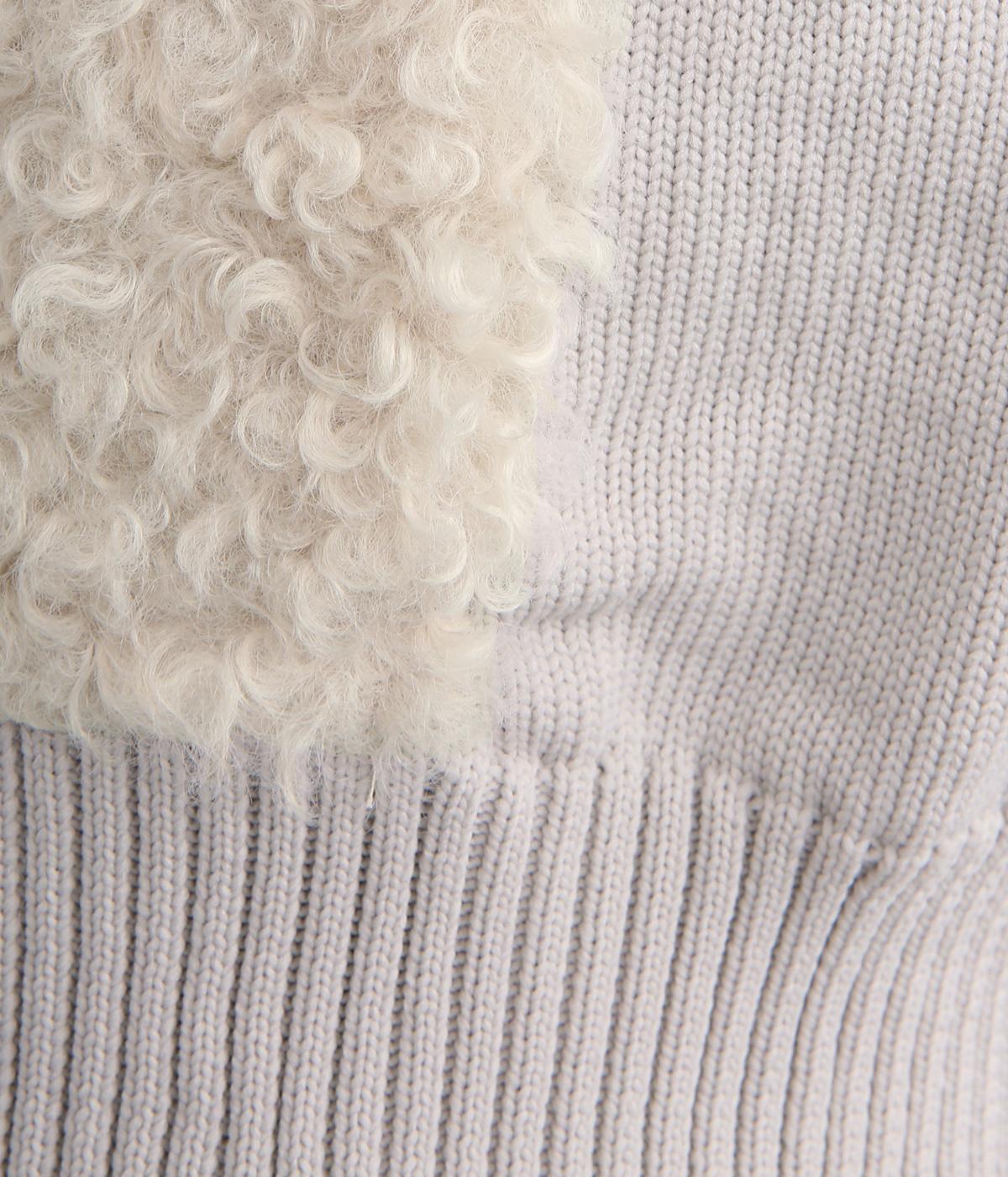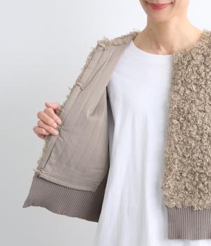 あたたかみのあるボア素材と厚みをおさえたポリエステルのニット生地を組み合わせています。裏側にはストライプ状にステッチを入れた滑りのよい生地を使用しました。
