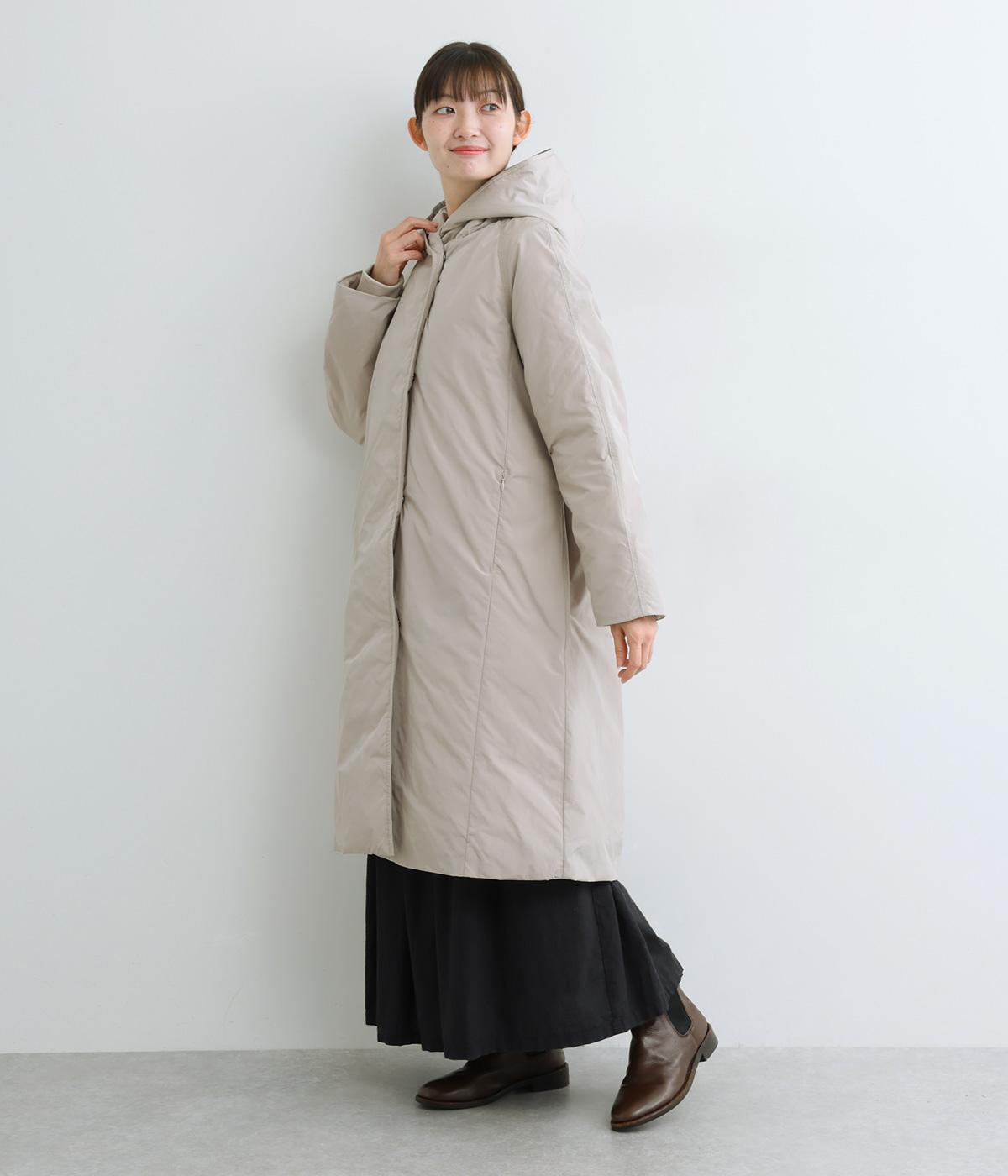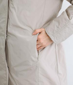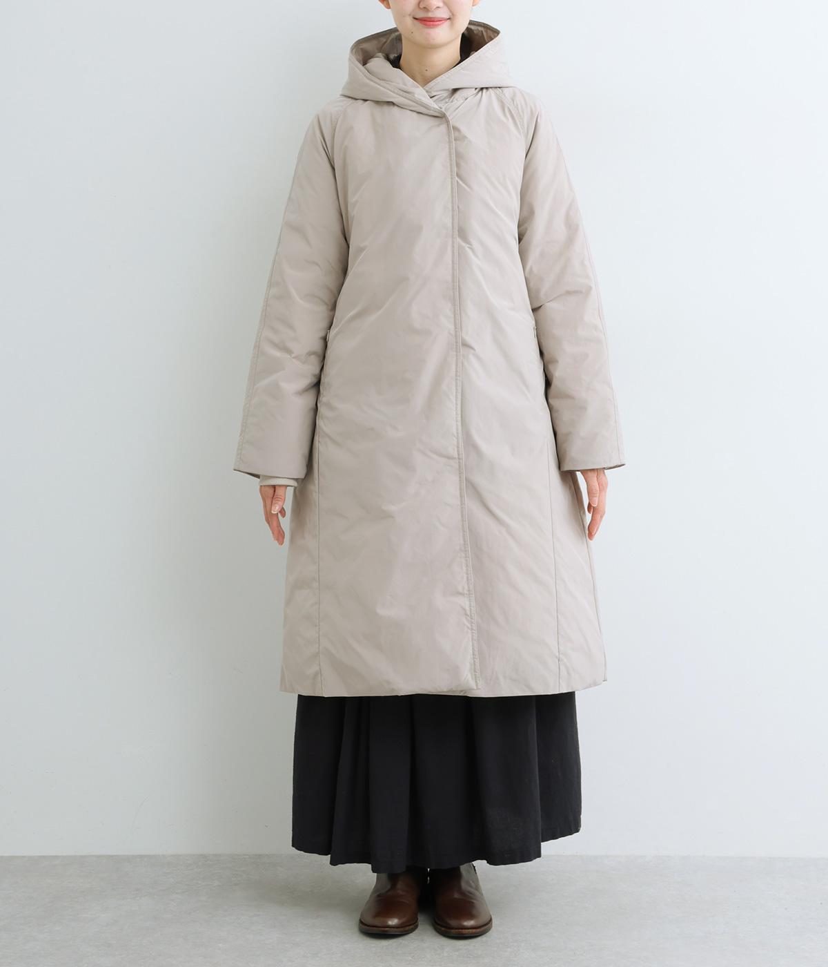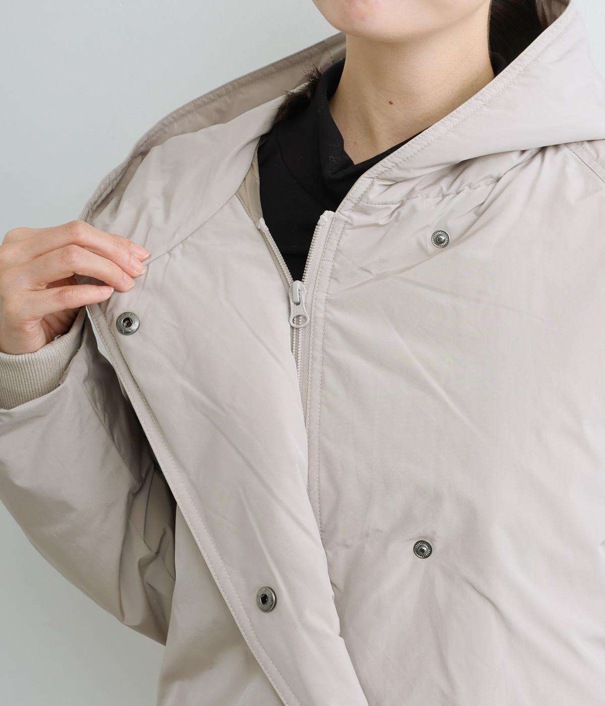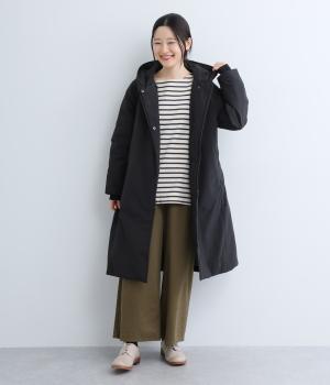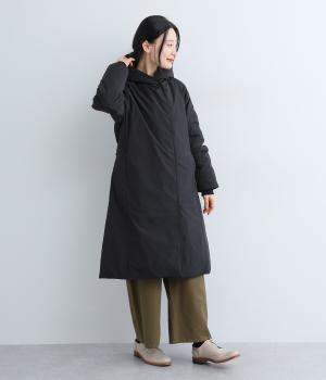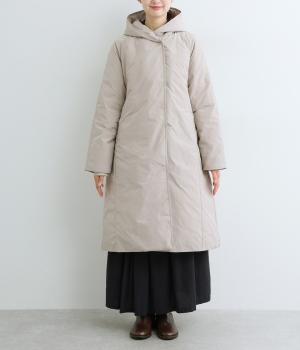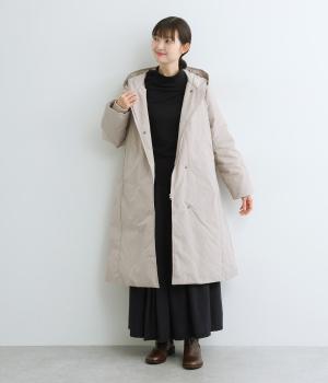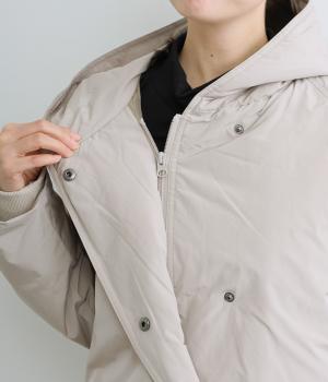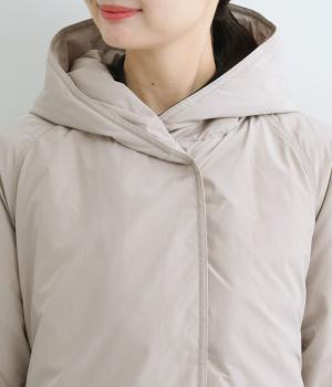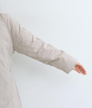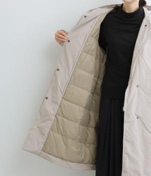 表地にはほんのりとした上品な光沢のあるポリエステル生地、裏地にはつるりとしたナイロンキルト生地を使用。フェザーに比べダウンの比率が高いのでとても軽くあたたかな着心地です。