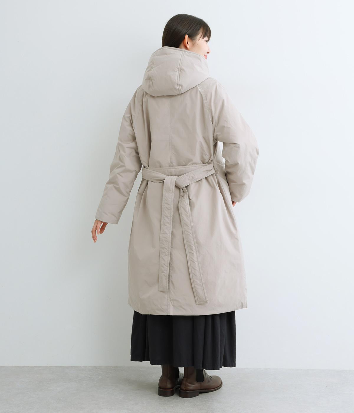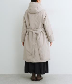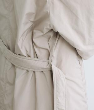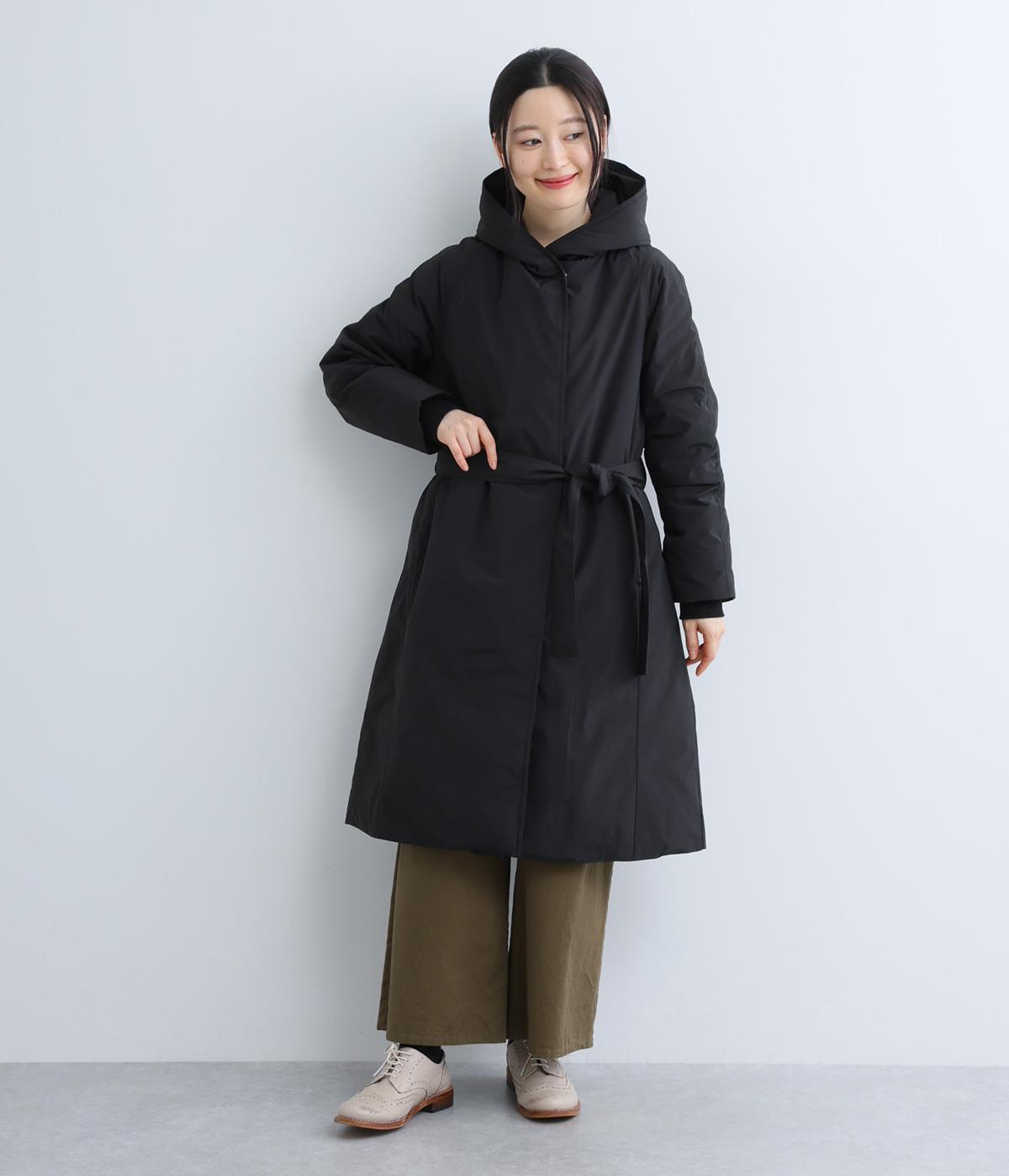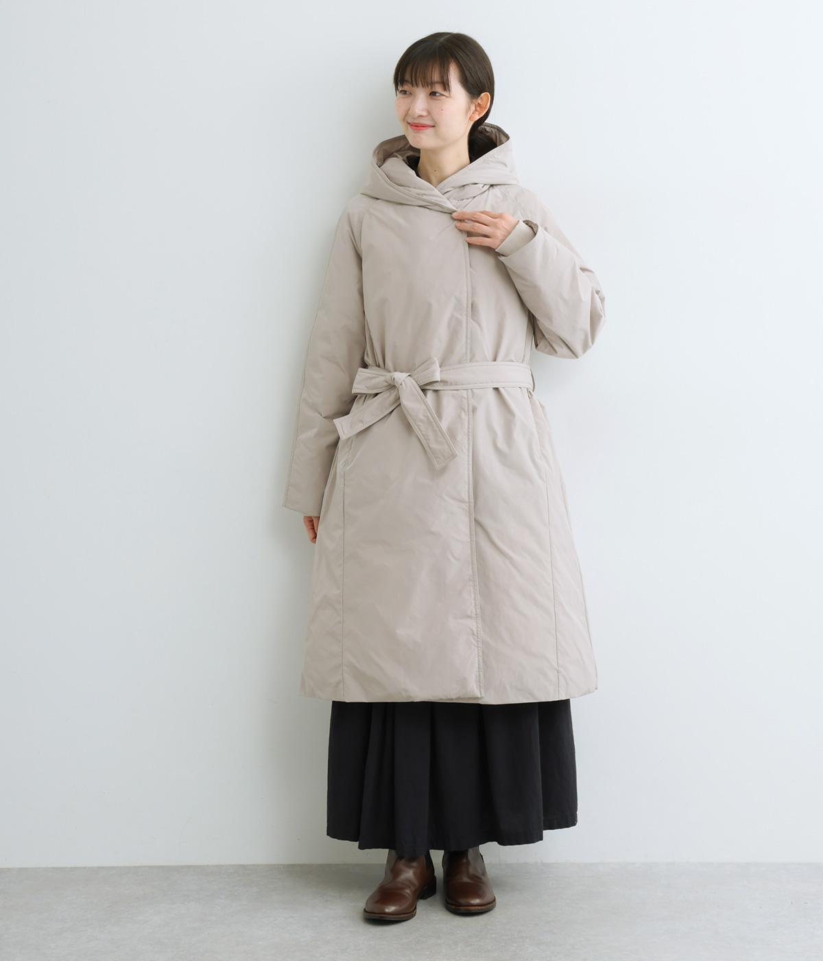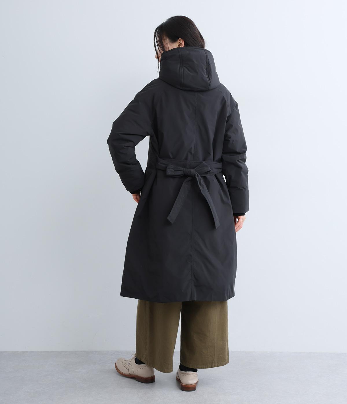 首元からひざ下まであたたかく包み込むロング丈のダウンコート。Aラインのシルエットが全体のバランスをすっきりと見せてくれます。ウエスト位置をより強調するベルトループと共布のベルトつき。風の侵入を防ぐ、袖口につけたリブもポイントです。
