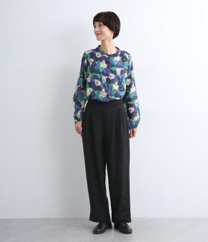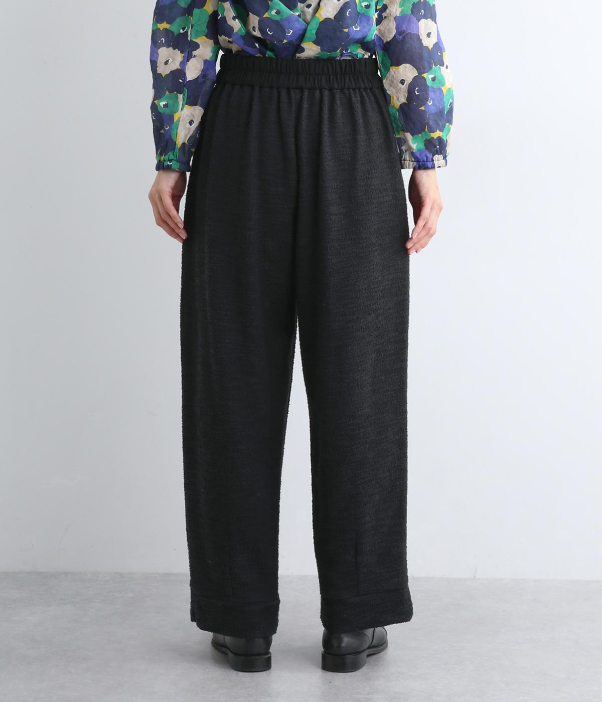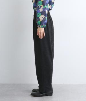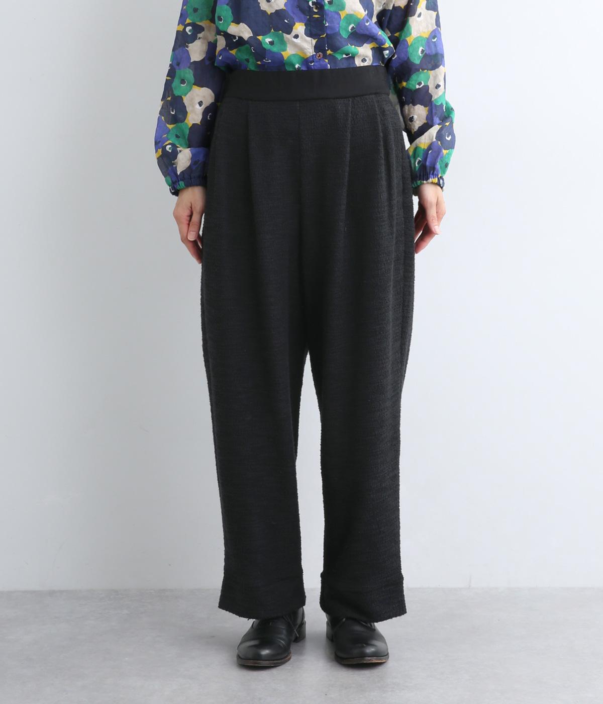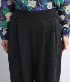 前ウエスト下にタックを入れ、ヒップから太ももにかけてゆとりを出したテーパードパンツ。裾に向かってゆるやかに細くしたシルエットが、上品な生地感も相まってきちんと感を漂わせます。ウエストは後ろにゴムを通しイージーな着用感にもこだわりました。