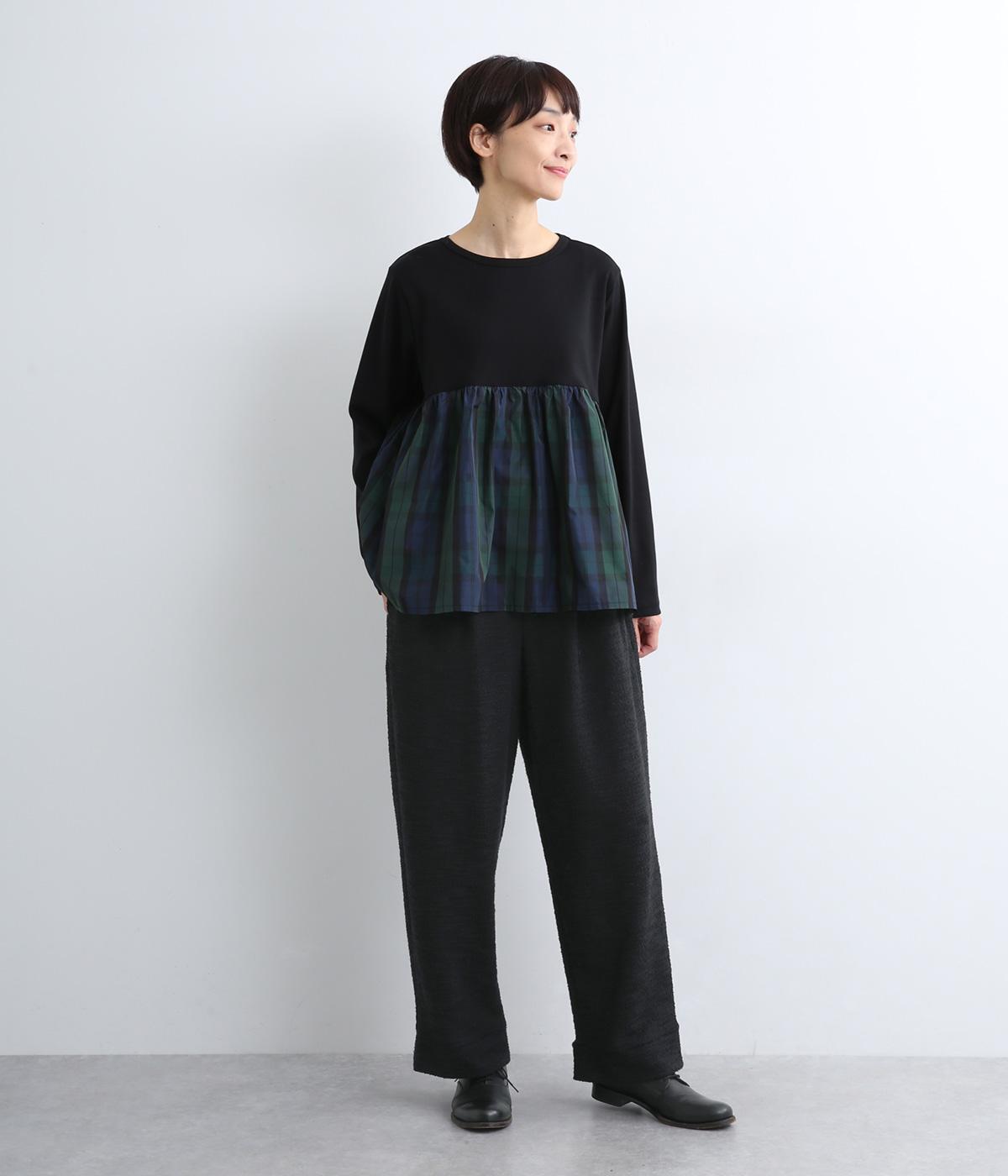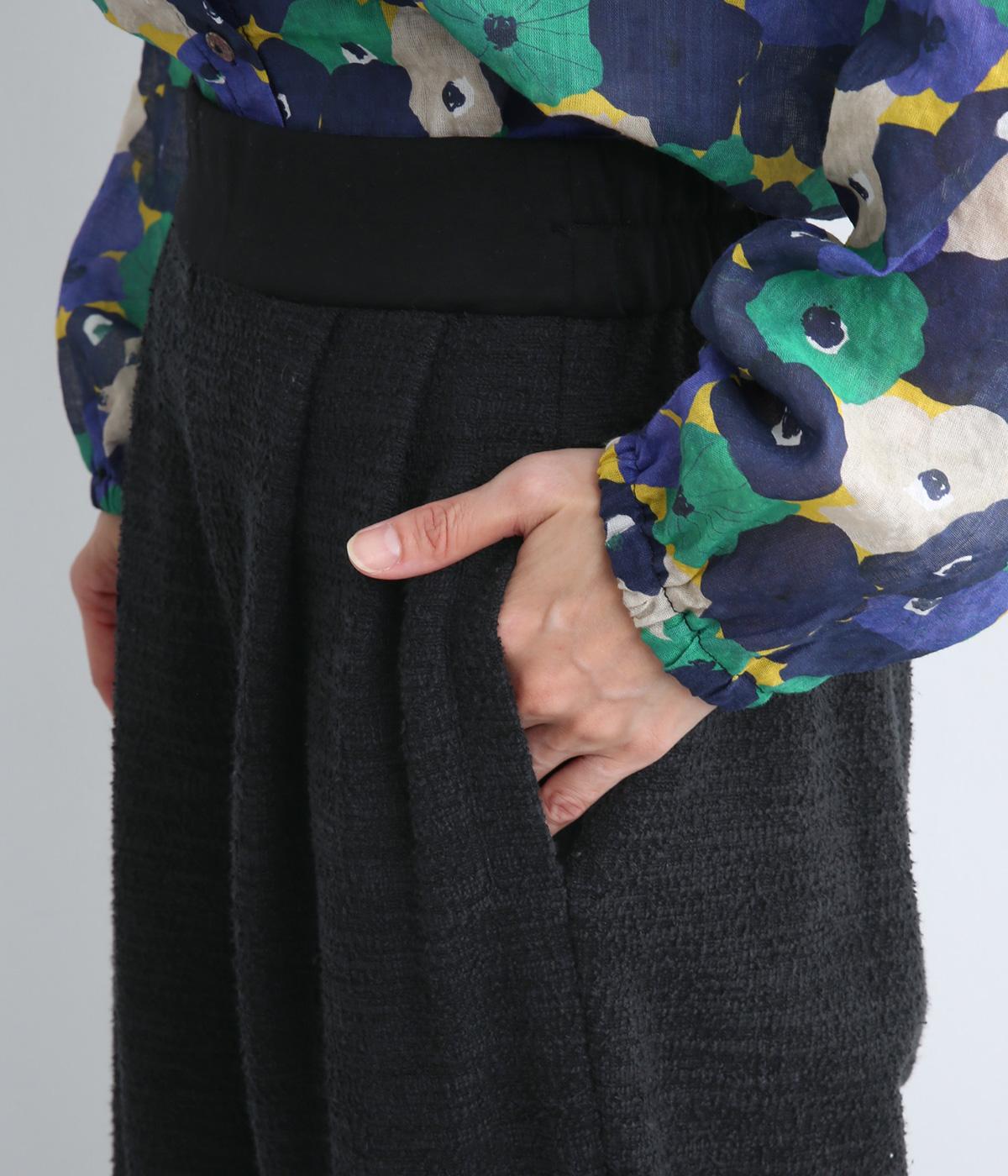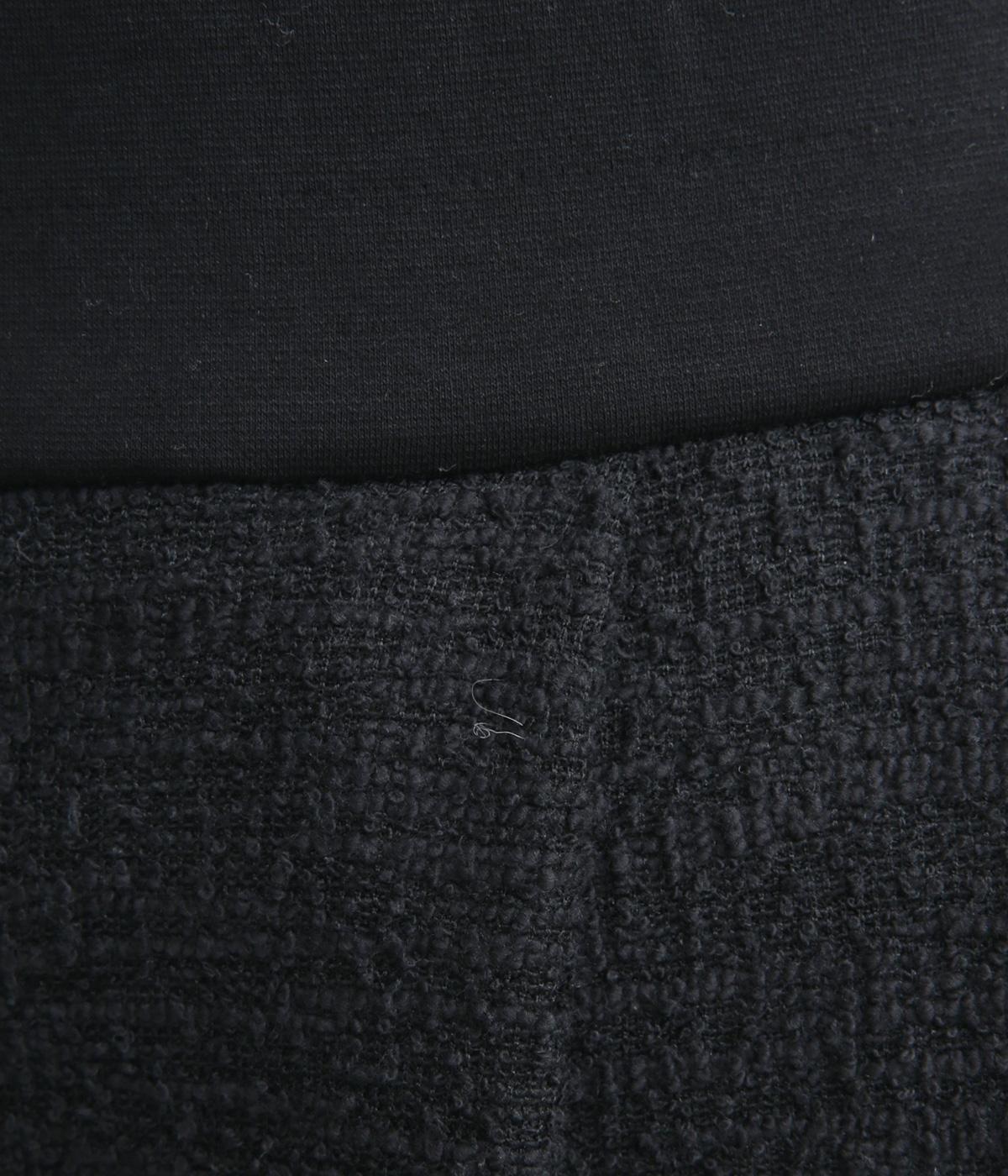 スラブ糸を使って織り上げた表情豊かなツイードインレイ生地を使用。滑らかな表面感が特徴の中肉ポンチ生地をウエスト部分にドッキングしています。