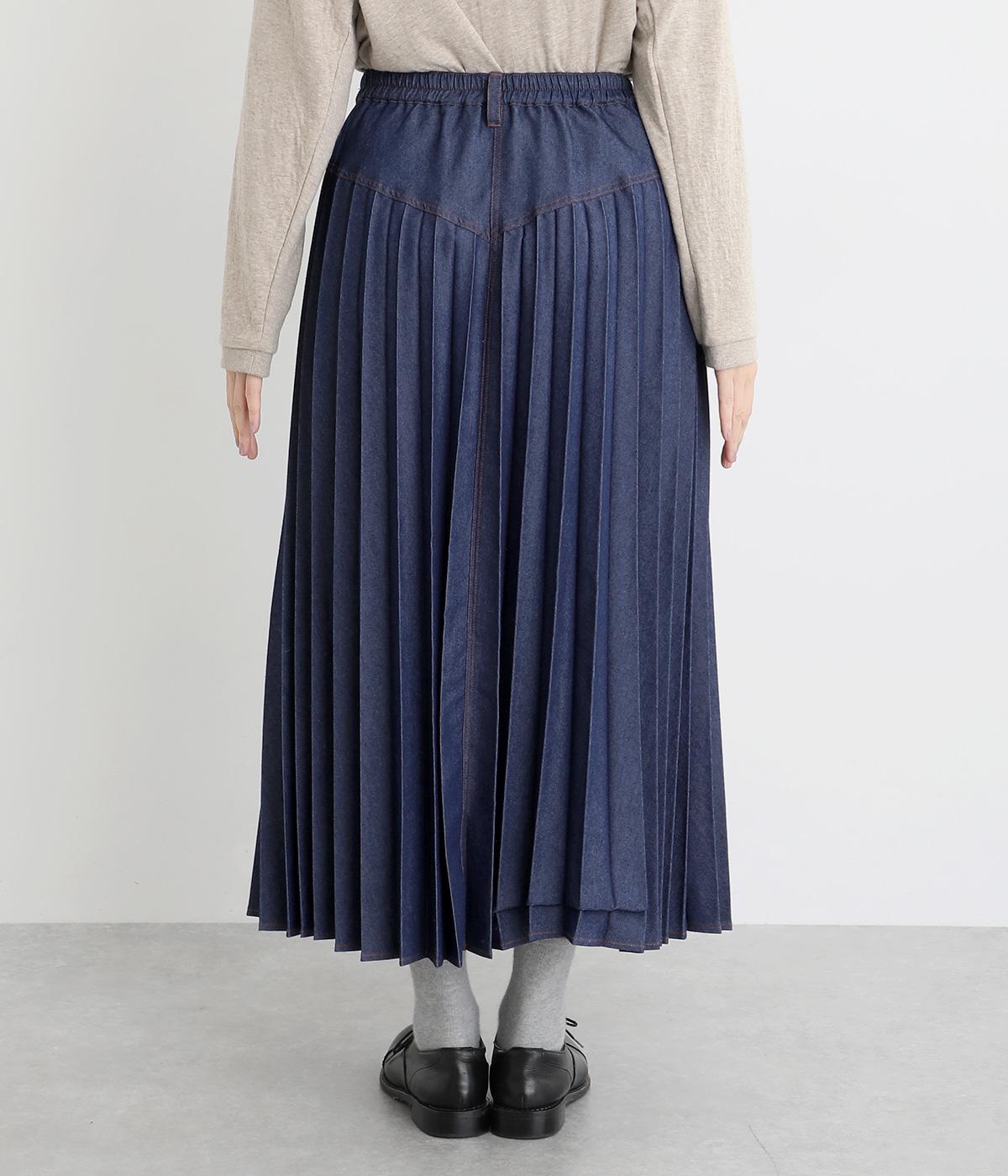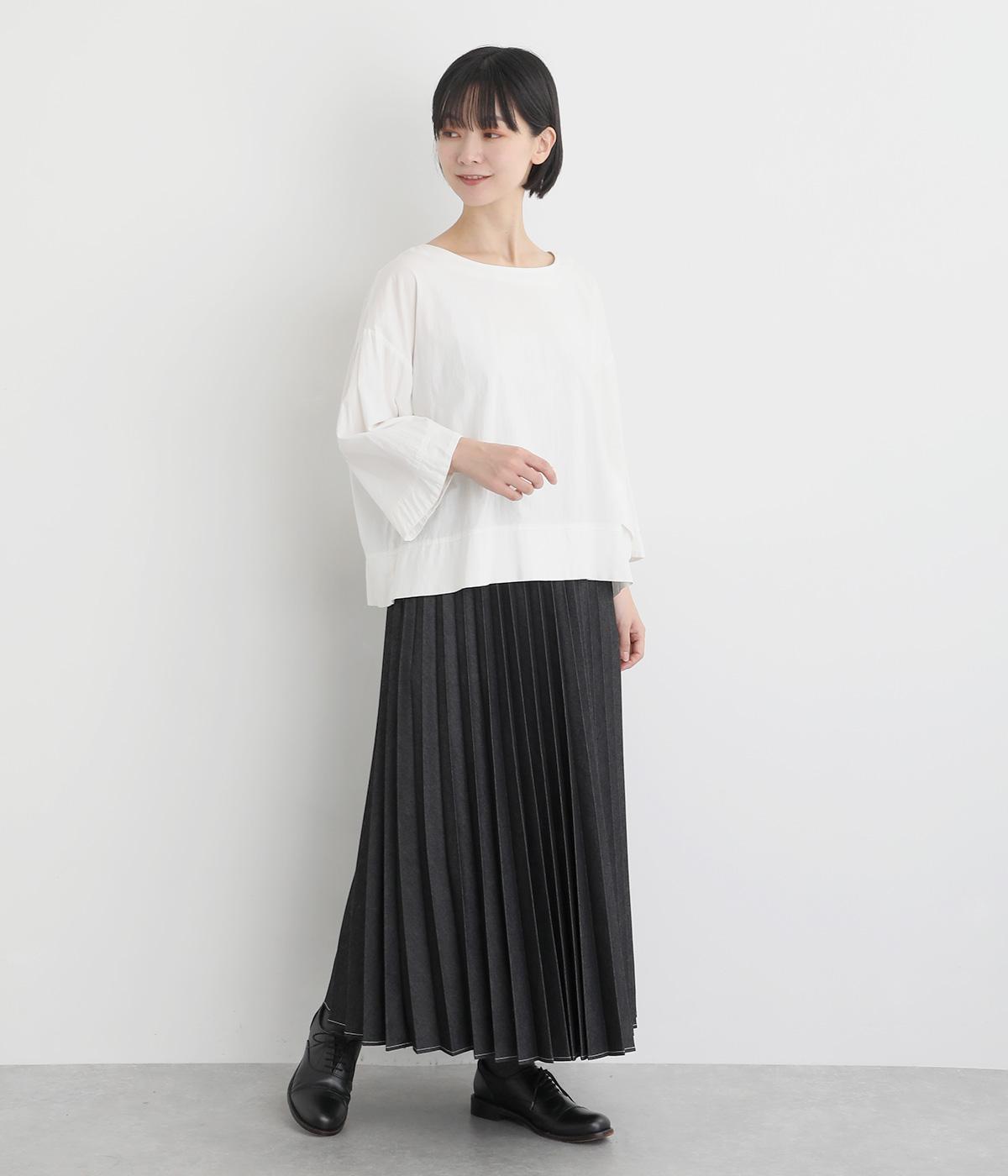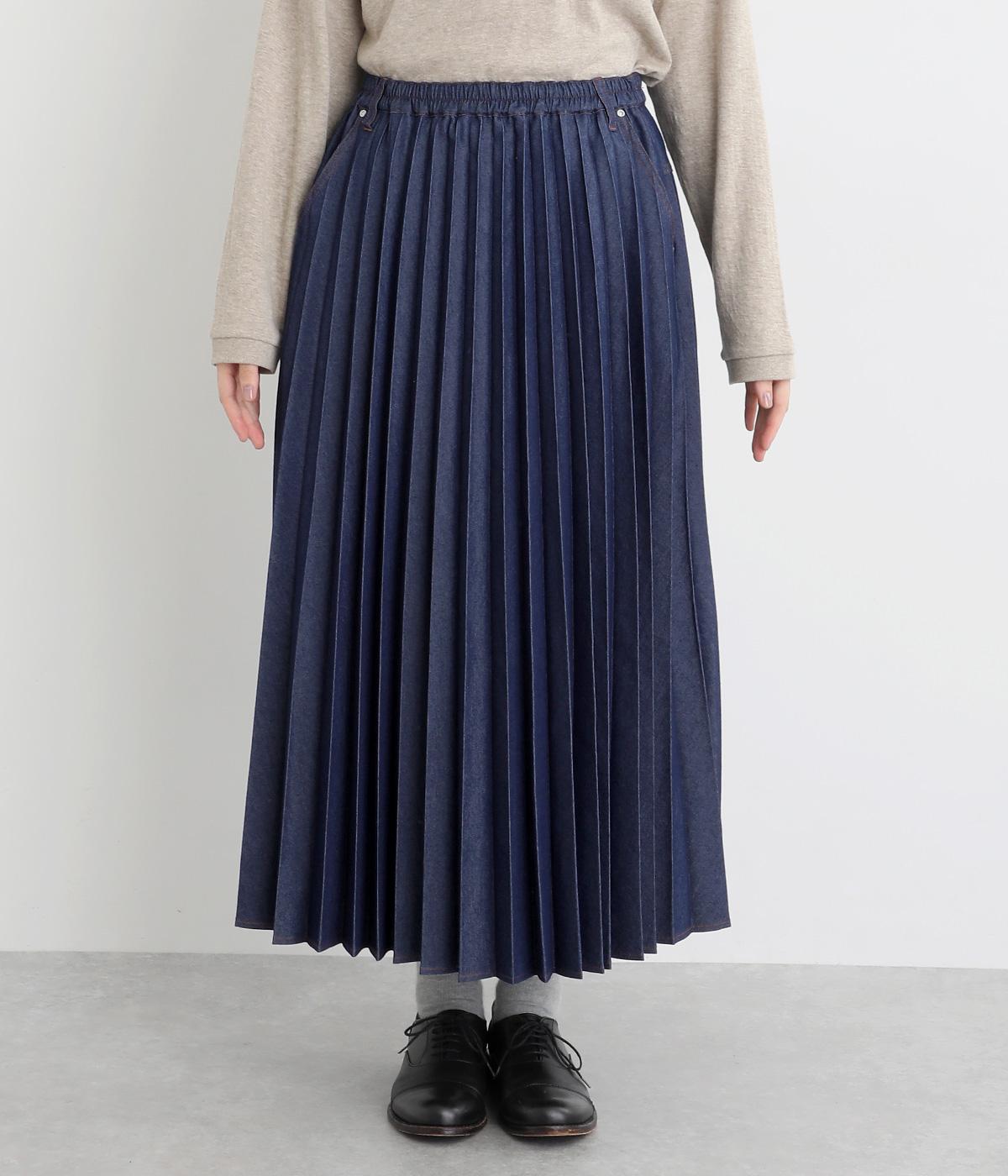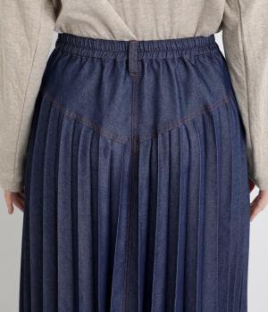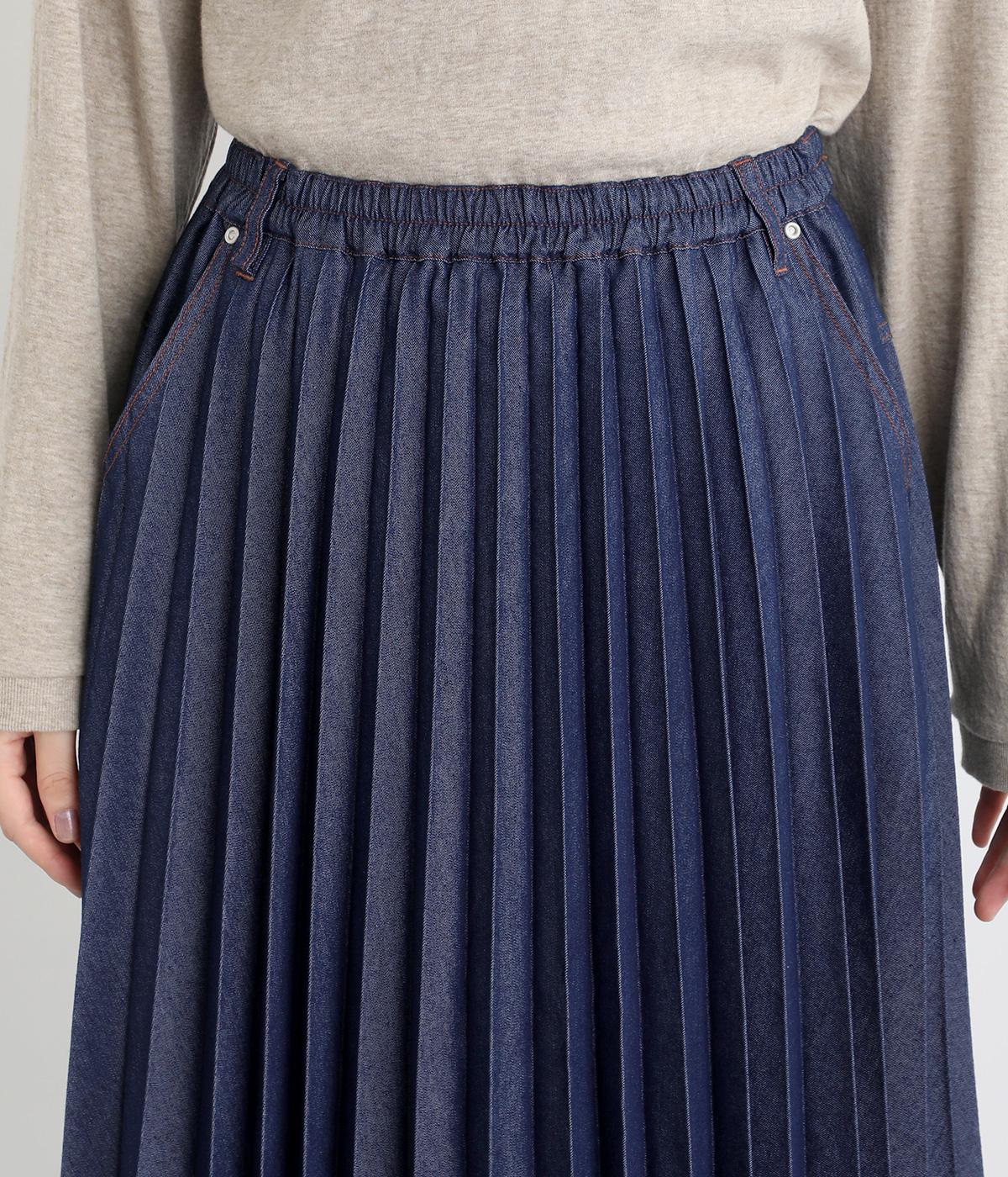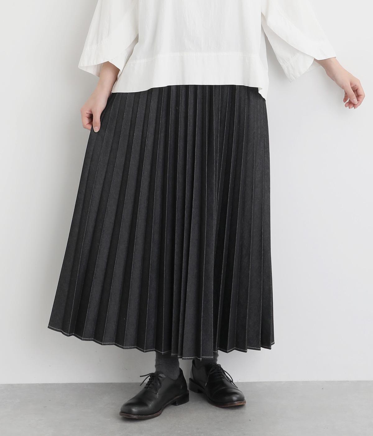 立体的でインパクトのあるプリーツがきれいなフレアを描く、Aラインシルエットのスカート。配色ステッチやリベットなどディテールにこだわったメリハリのあるデザインが魅力。ウエストはぐるりとゴムが通っていて安定感があり、はき心地にもこだわりました。