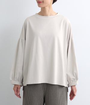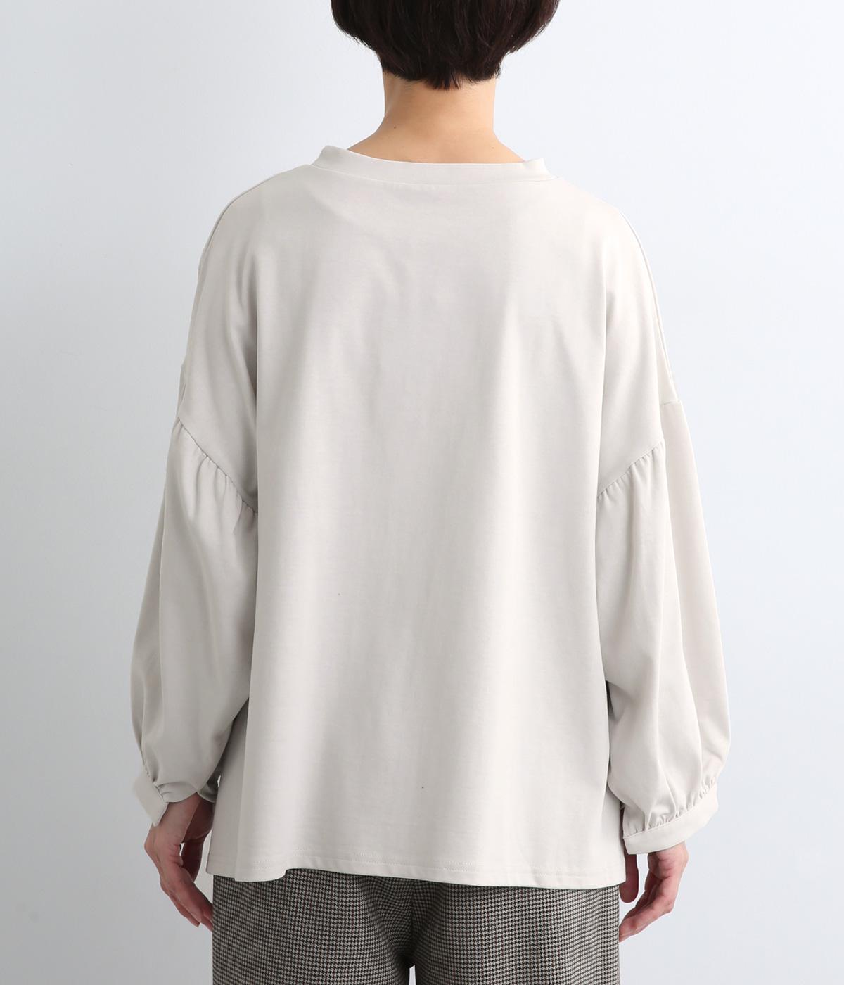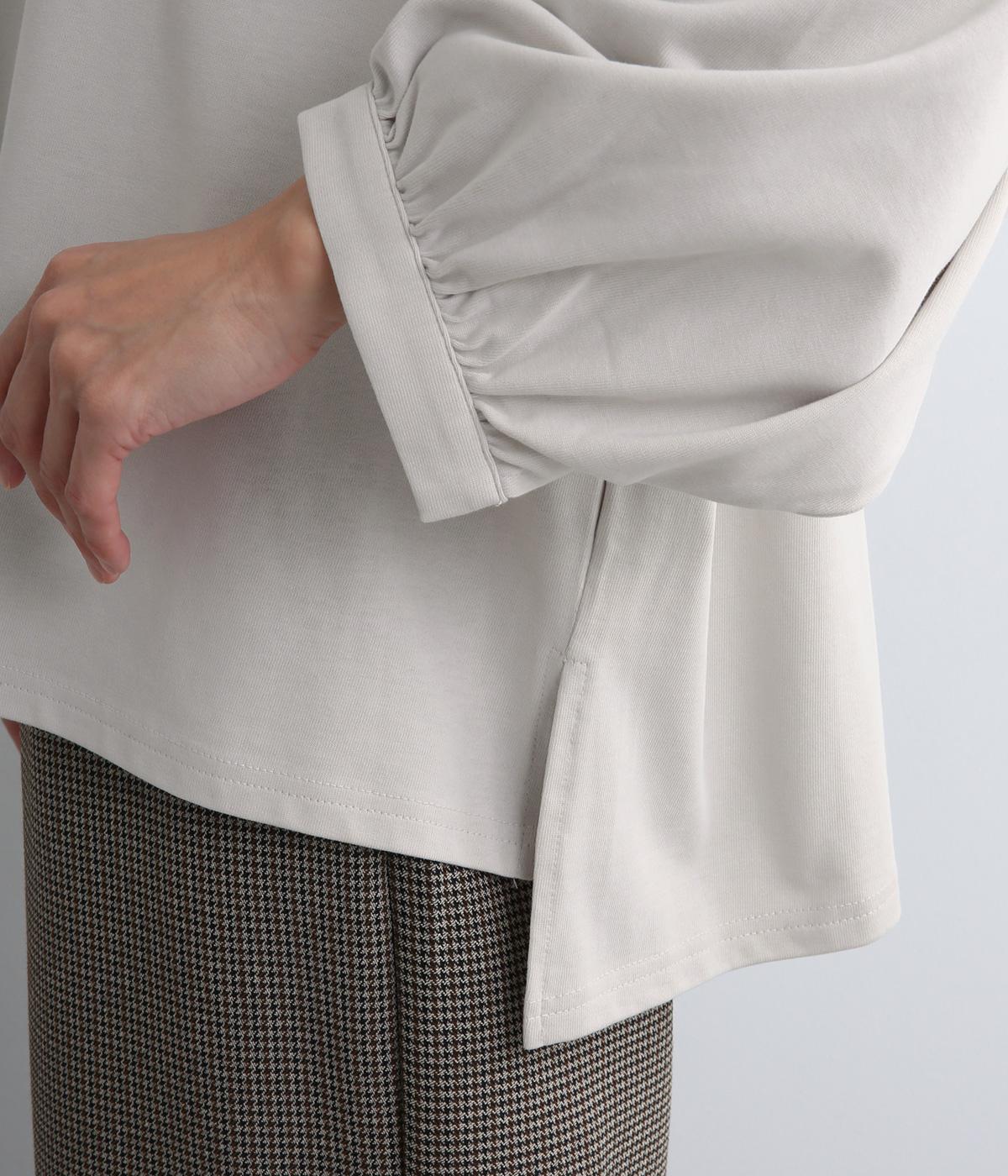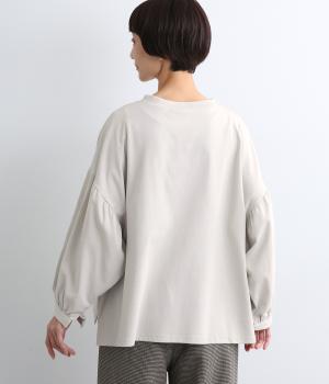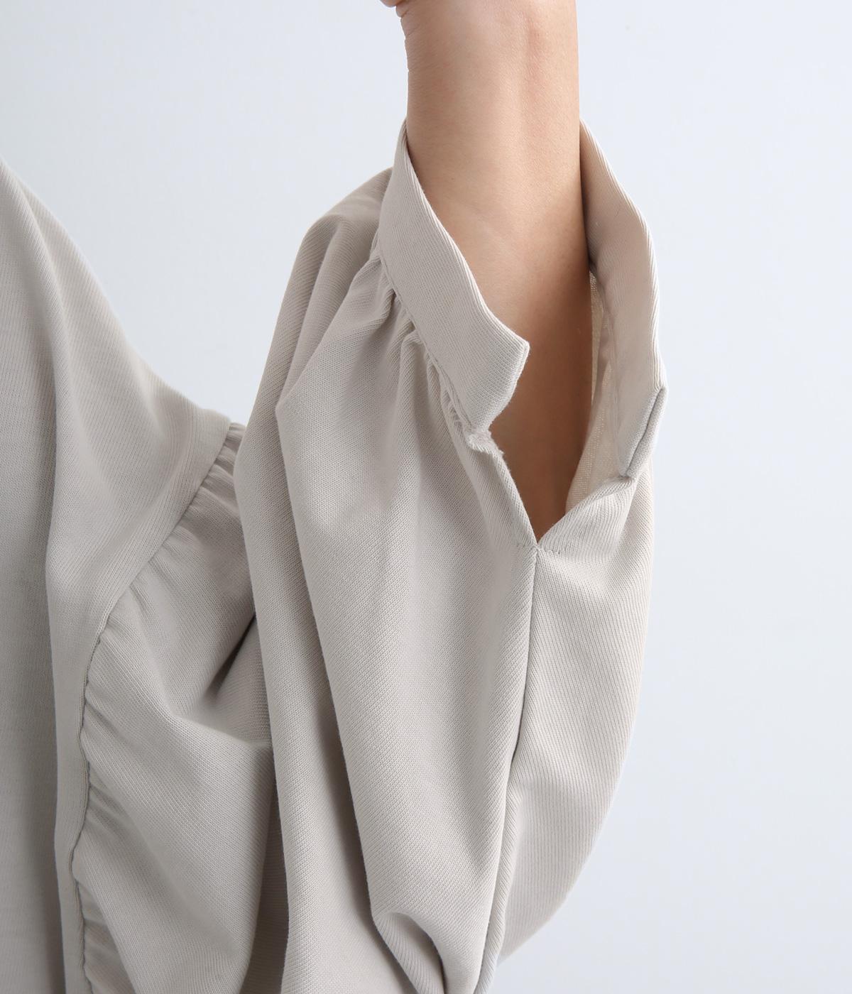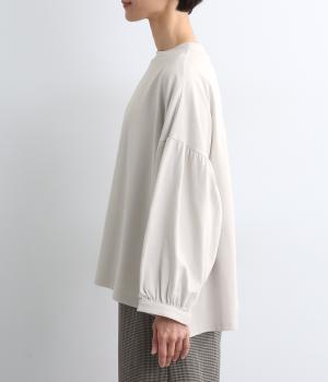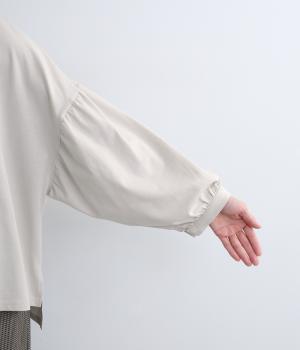 袖ぐりと袖口にギャザーを入れてボリュームを出したプルオーバーです。身頃にもゆとりを持たせて、フェミニンながらもリラクシーな雰囲気に。着丈は前後差をつけ、前は短めに設定してすっきりとしたバランスに仕上げました。