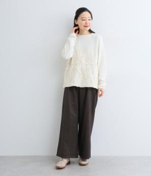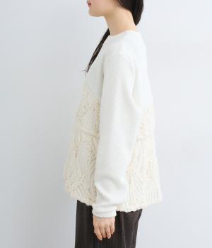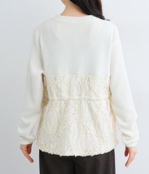 リブカットソー生地に、可憐なチュール素材をビスチェのように重ねたプルオーバー。デイリーに取り入れやすいカジュアルさと上品な女性らしさをを両立する一枚です。パンツにもスカートにも合わせやすく、幅広い着こなしをたのしめます。