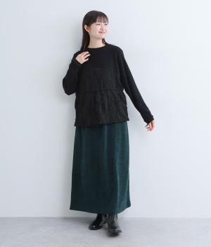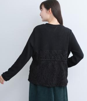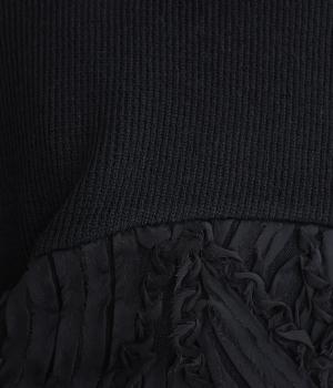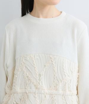 とてもやわらかくて伸びのよいやや薄手のリブカットソー生地をベースに使用。シフォン素材で立体的なデザインをあしらった、透け感のある軽やかなチュール生地を組み合わせています。