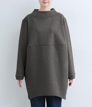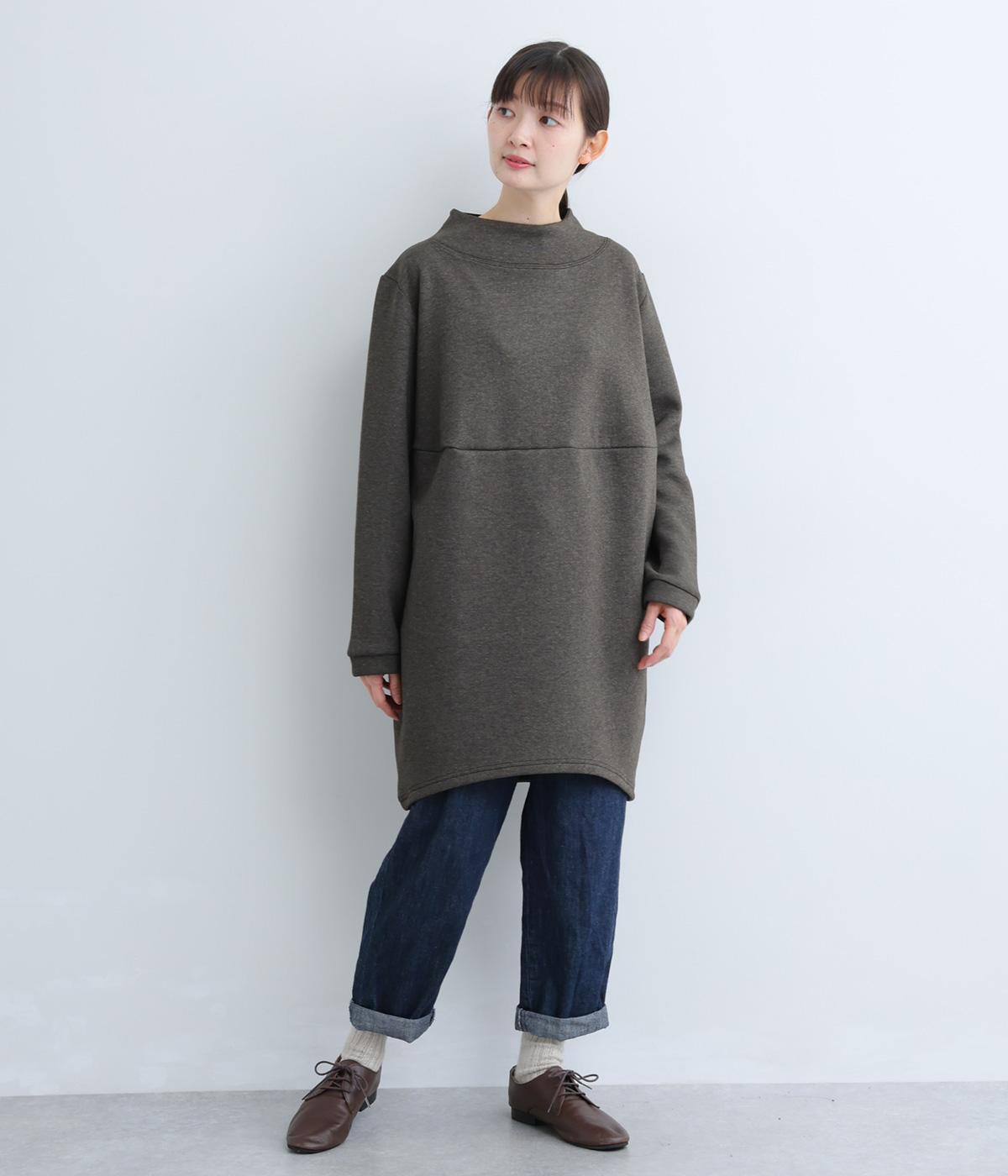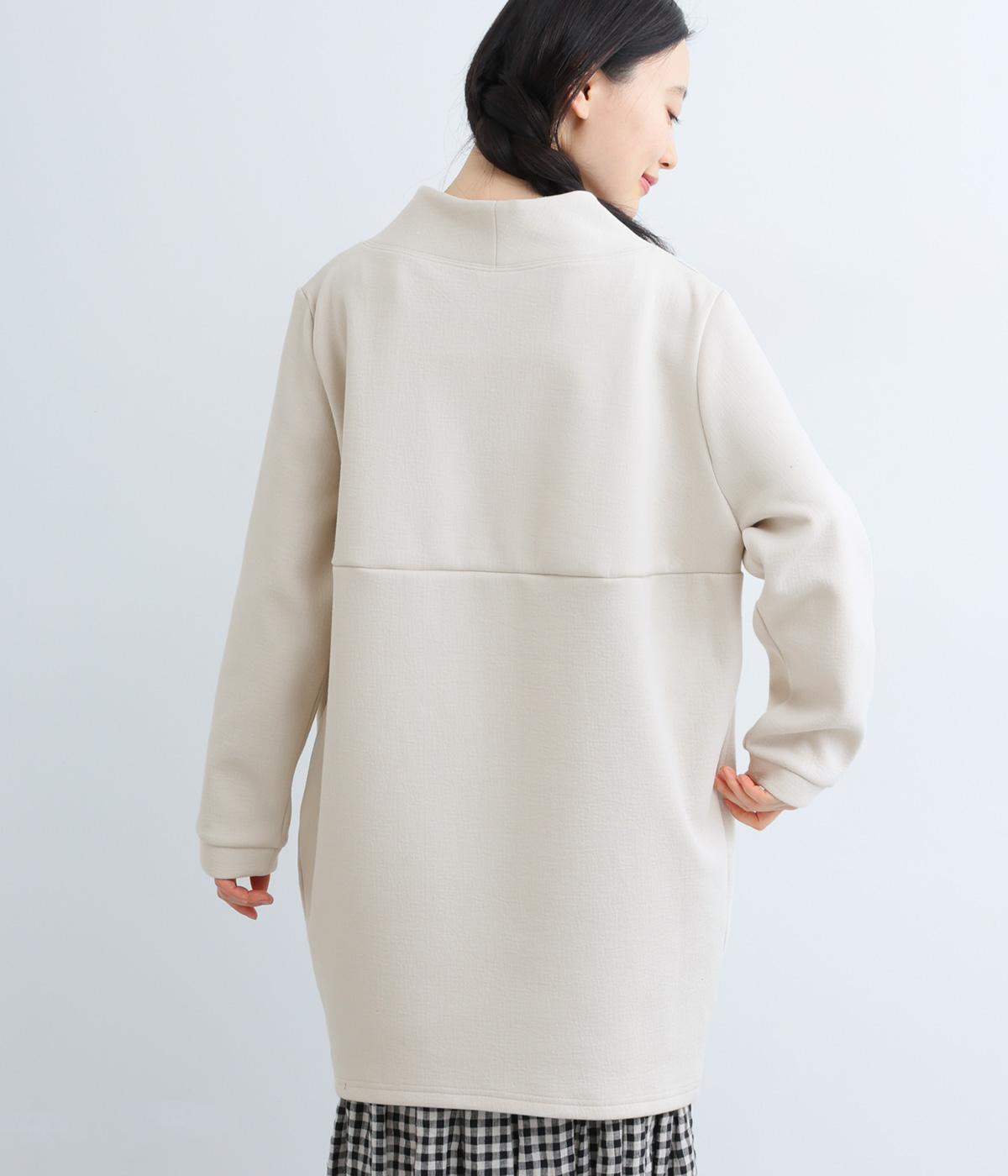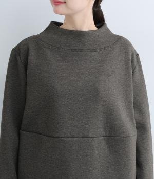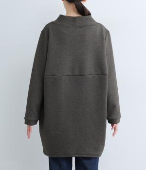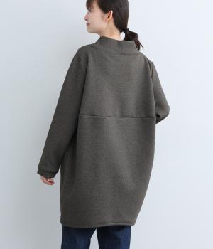 ふんわりとしたコクーンシルエットに、ハイウエスト位置の切り替えラインでアクセントを添えました。低めでゆとりのあるハイネックが顔まわりをすっきりと見せ、抜け感のある印象に仕上げています。