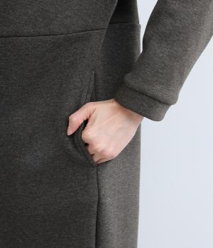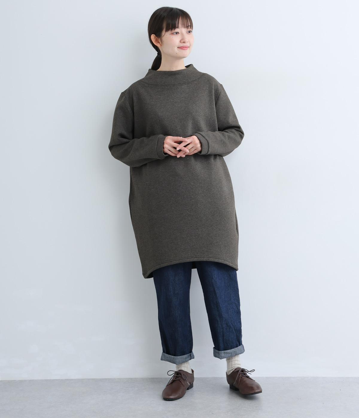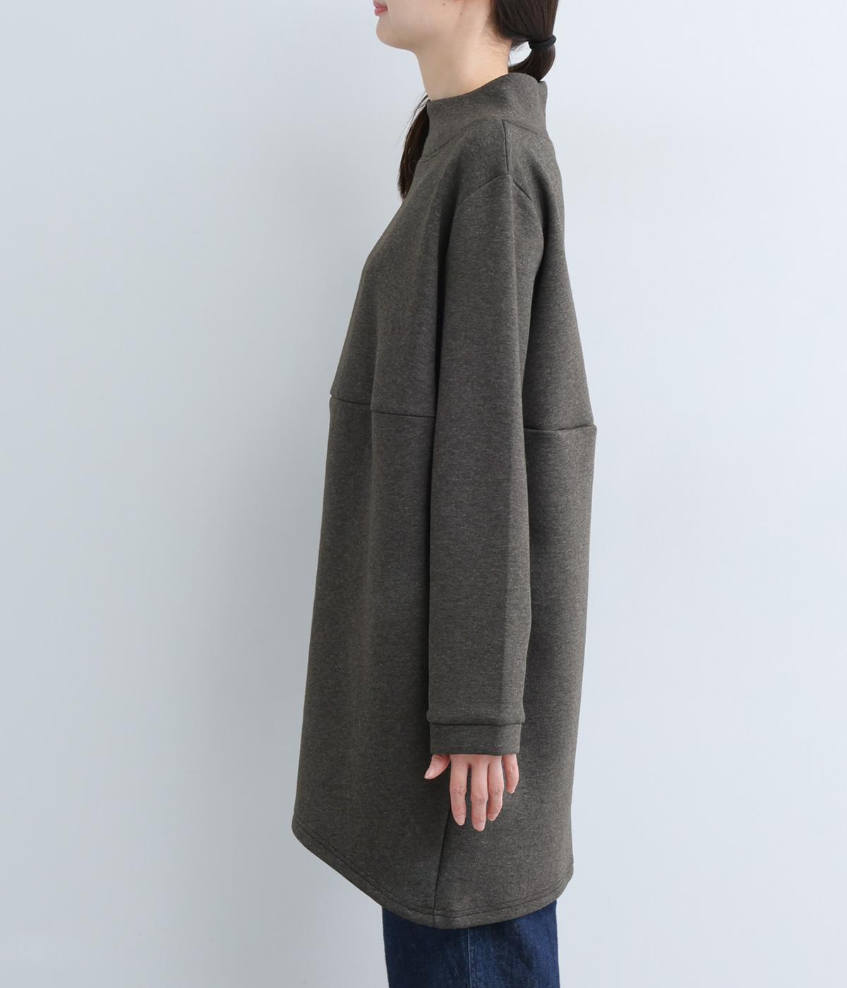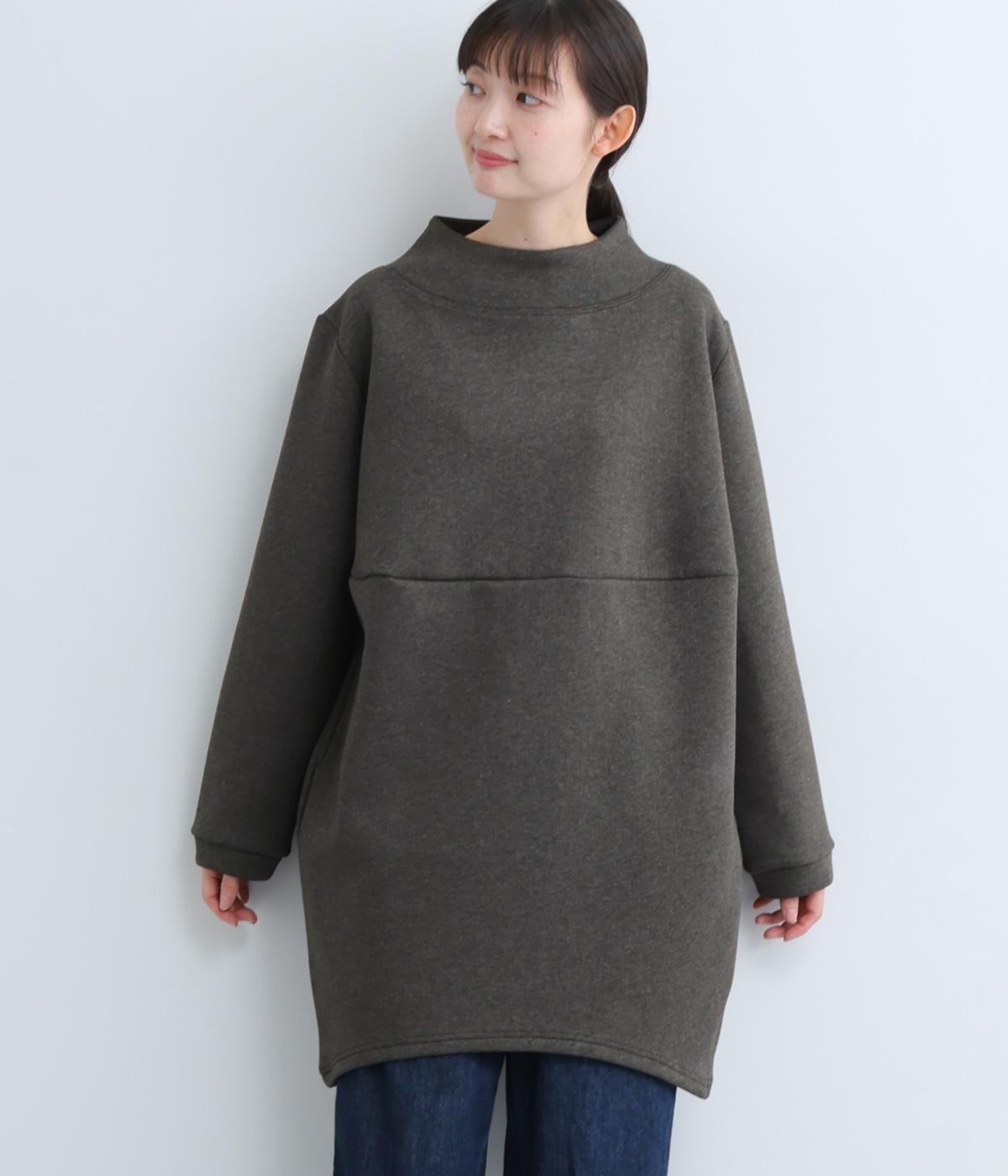 ふんわりとしたコクーンシルエットに、ハイウエスト位置の切り替えラインでアクセントを添えました。低めでゆとりのあるハイネックが顔まわりをすっきりと見せ、抜け感のある印象に仕上げています。