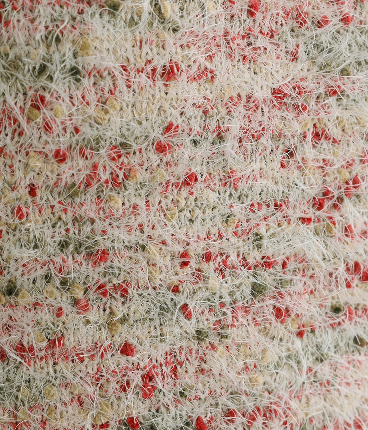 やわらかく伸縮性があるポリエステル生地です。ぽこぽことした表面感に毛足の長いフェザーモールを合わせました。あたたかみのある見た目ながらとても軽やかな着心地です。