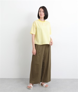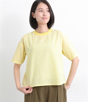 凹凸感が特徴的で肌へのまとわりが少なく、通気性にも優れている綿混サッカーを使用しています。やや薄手でやわらかく快適に着用できる生地感です。