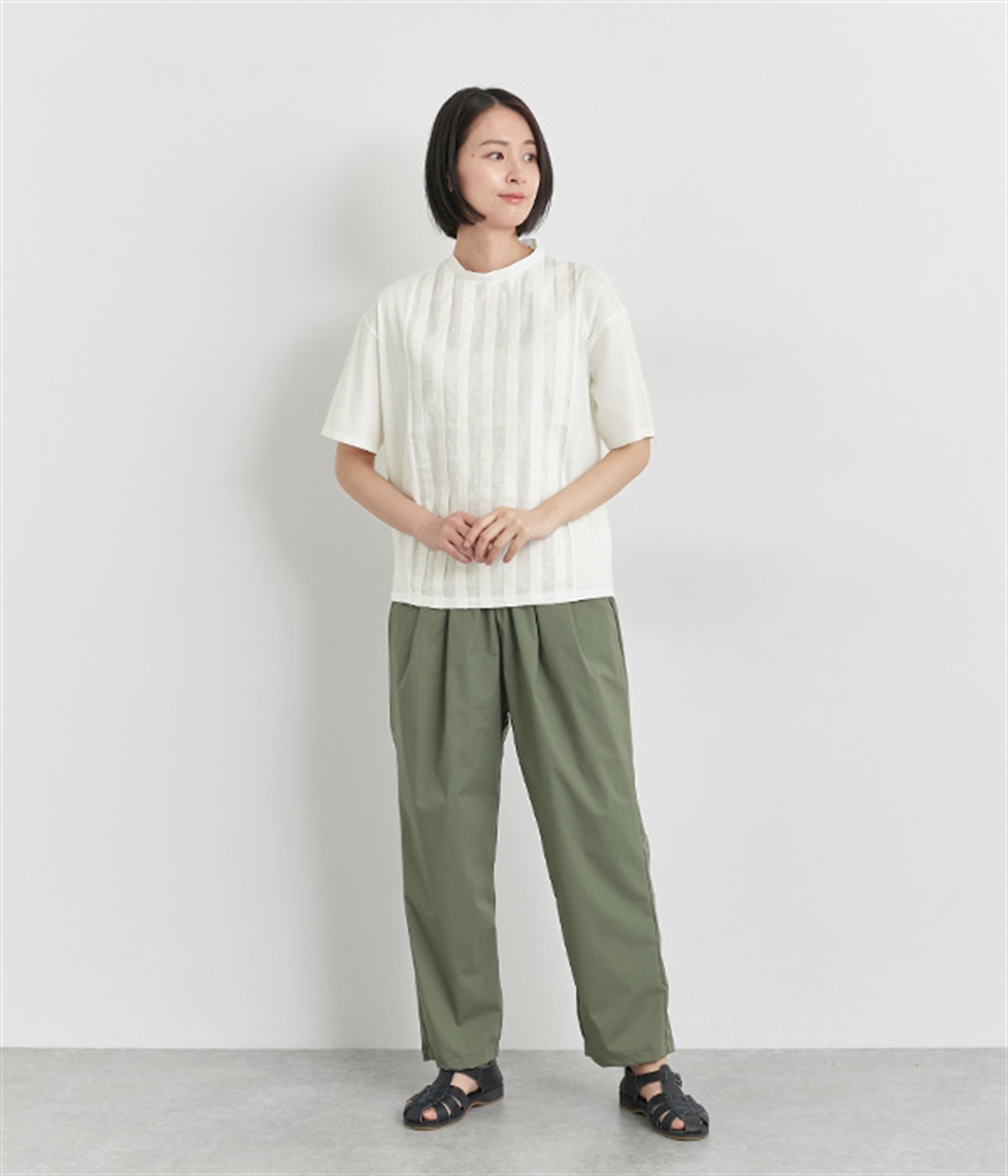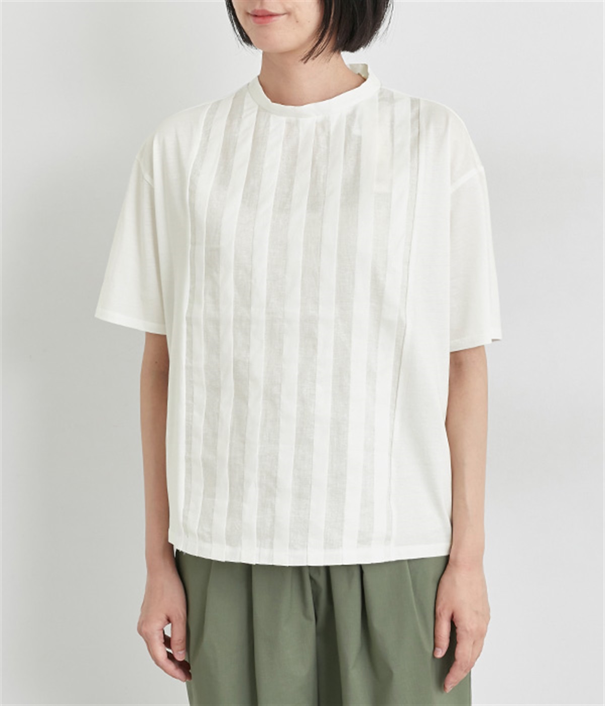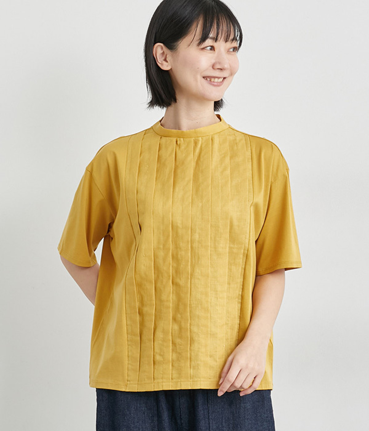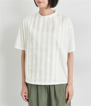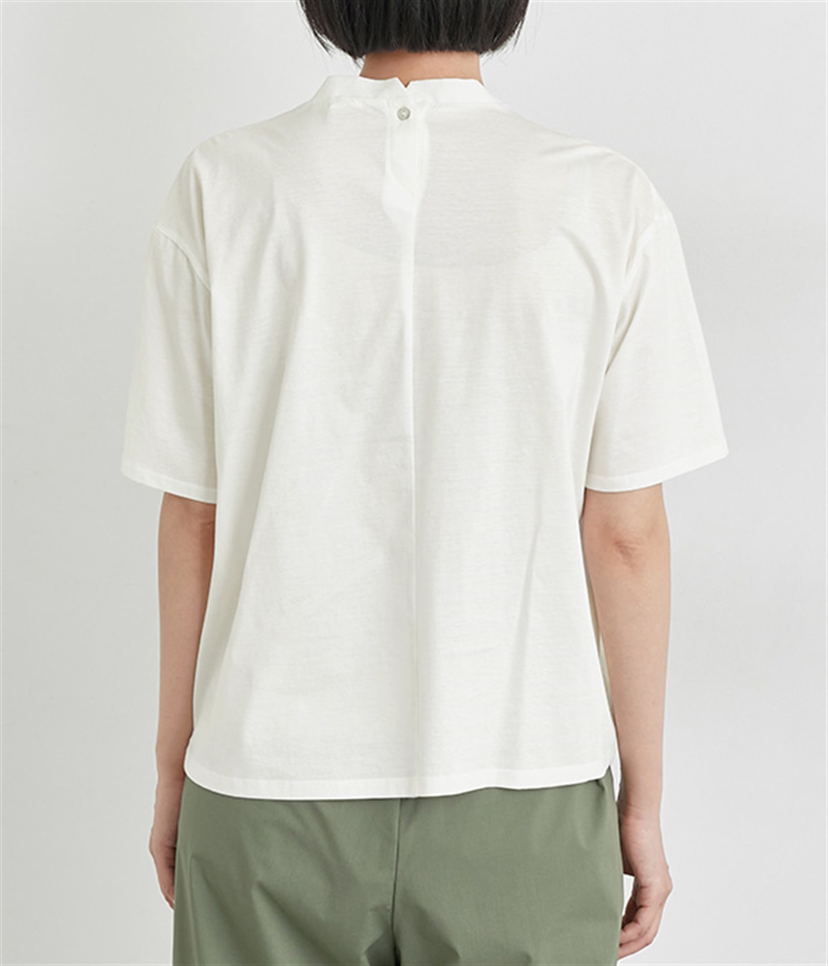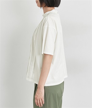 フロントのタックにスタンドネックで品よくまとめました。着心地よくふだん使いしやすいTシャツをベースに、お洒落感の高いディテールを取り入れた優秀な一枚です。後ろボタンが着脱をアシスト。