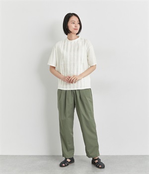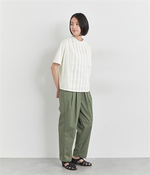 ベースは伸縮性のあるやわらかな綿天竺を使用しています。クリアな表面感でカジュアルながらもきれい見えする生地です。フロントはナチュラルな綿麻生地に切り替えています。