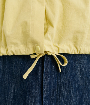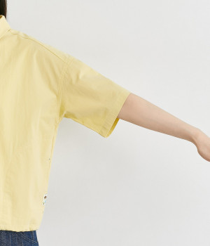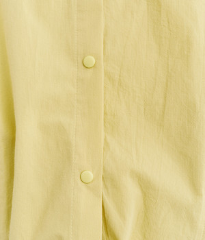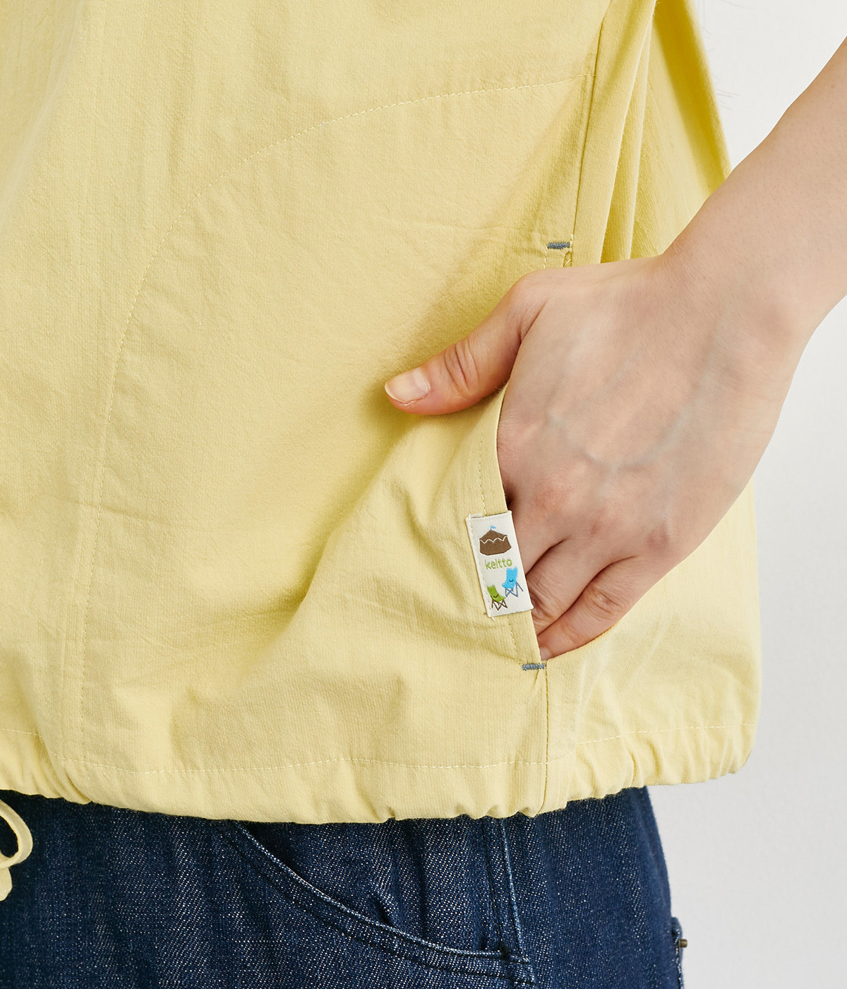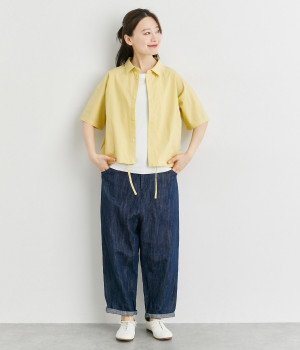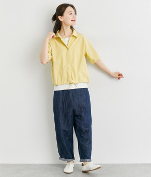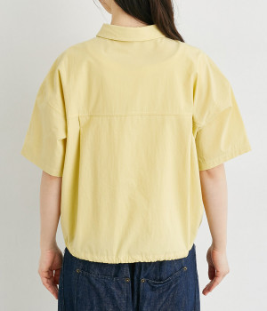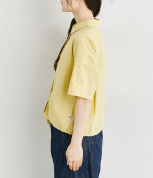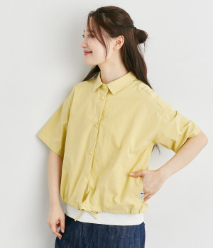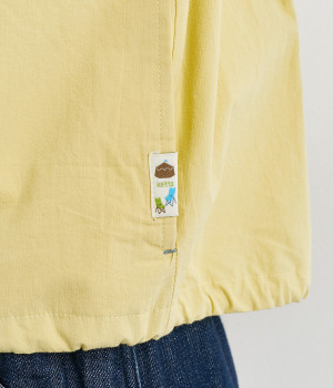 スナップボタン仕様で脱ぎ着もイージーなシャツは、裾に紐を通してアレンジ可能に。シームポケットつきで実用性も高く、ポケット口にはアウトドアモチーフのピスネームを、ボタンにはさまざまな図案をいれてブランドらしさを出しました。