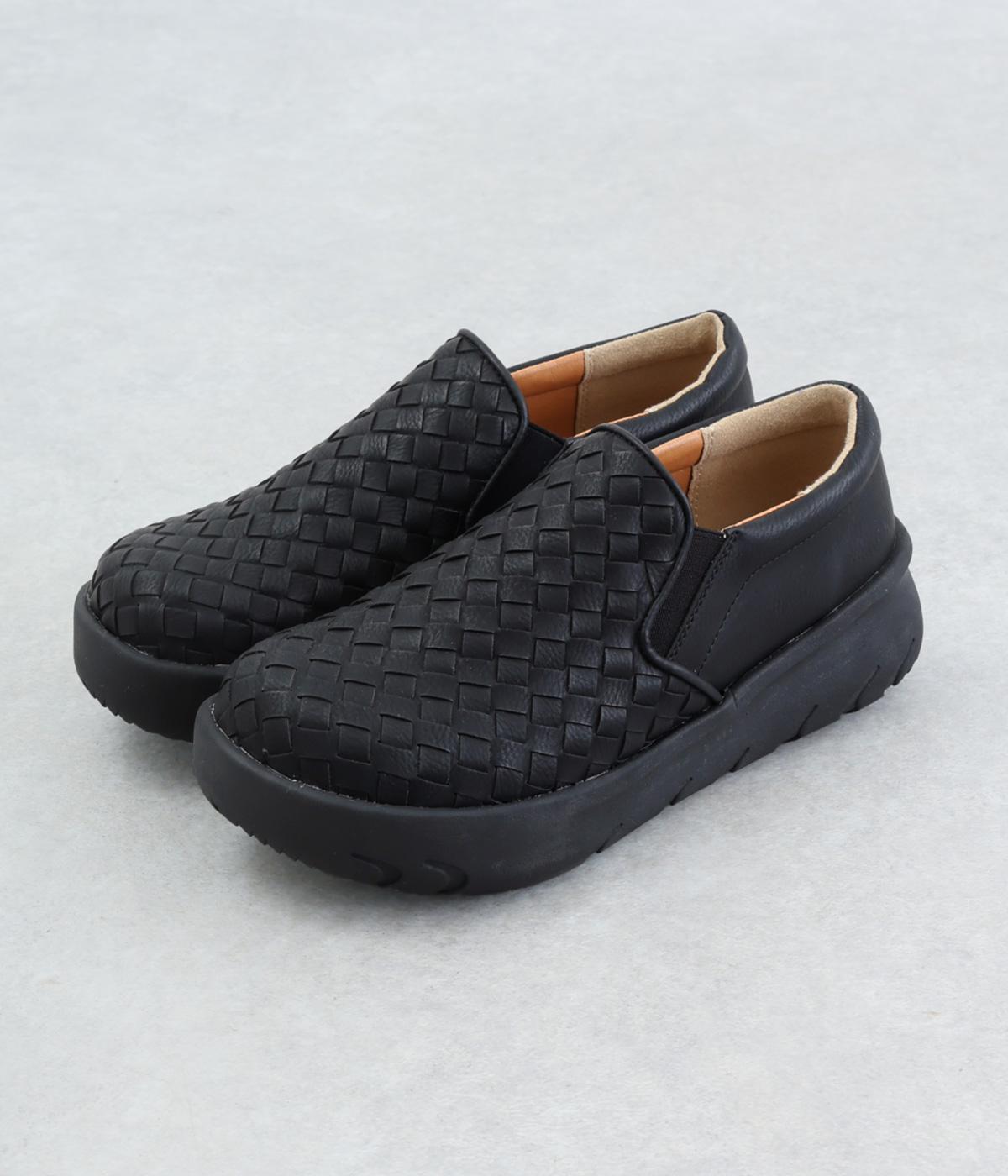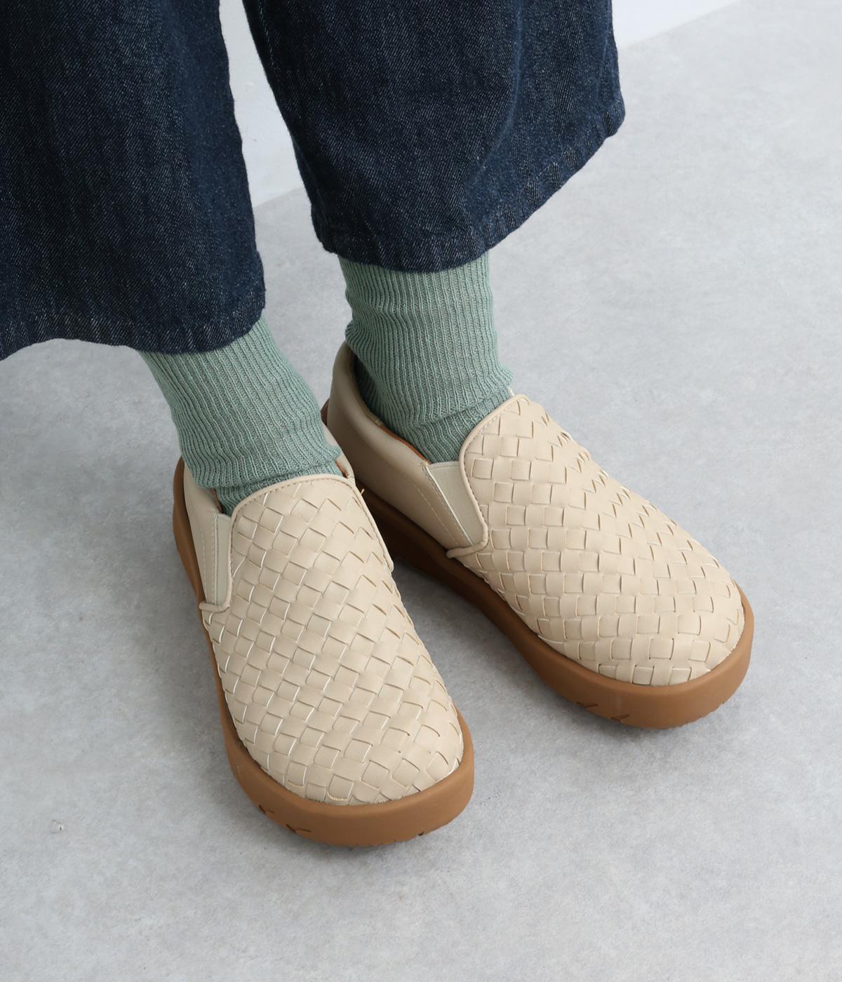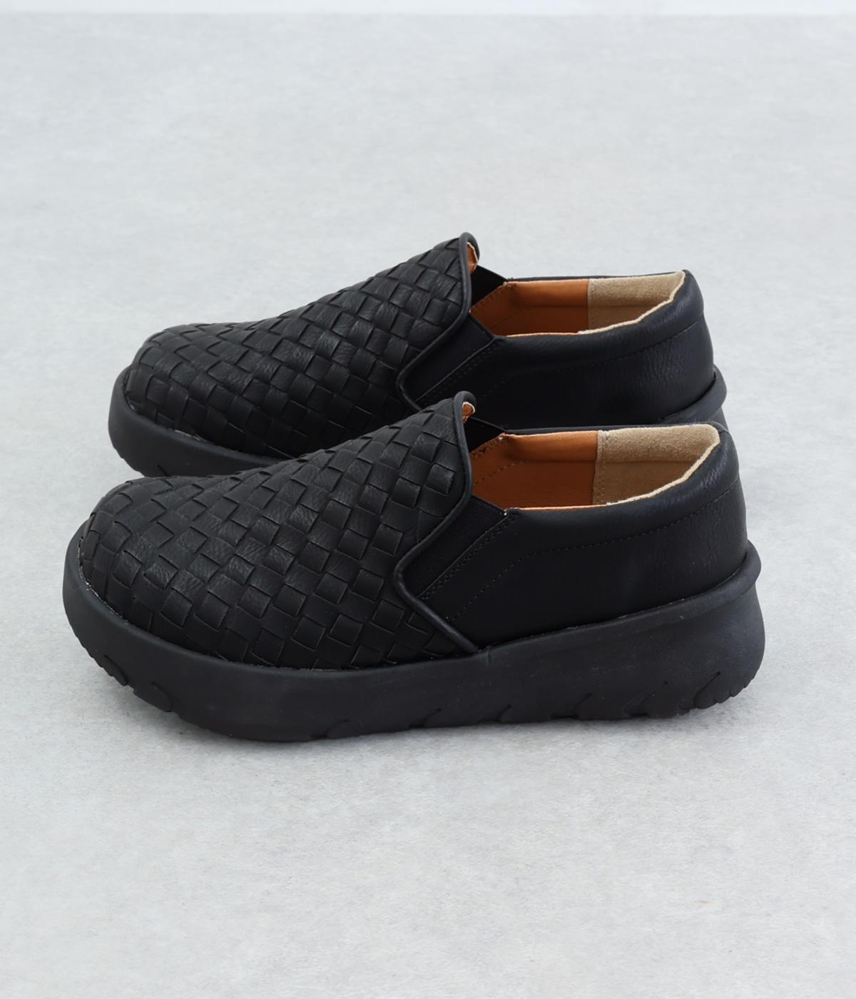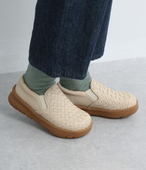 メッシュ編みデザインが品の良さを保ちながらも適度に存在感を発揮するスリッポンシューズ。サイドゴアで脱ぎ履きしやすく、安定感のある厚底がうれしいポイント。長時間歩行も疲れにくく、デイリー使いからお出かけまで幅広く活躍。