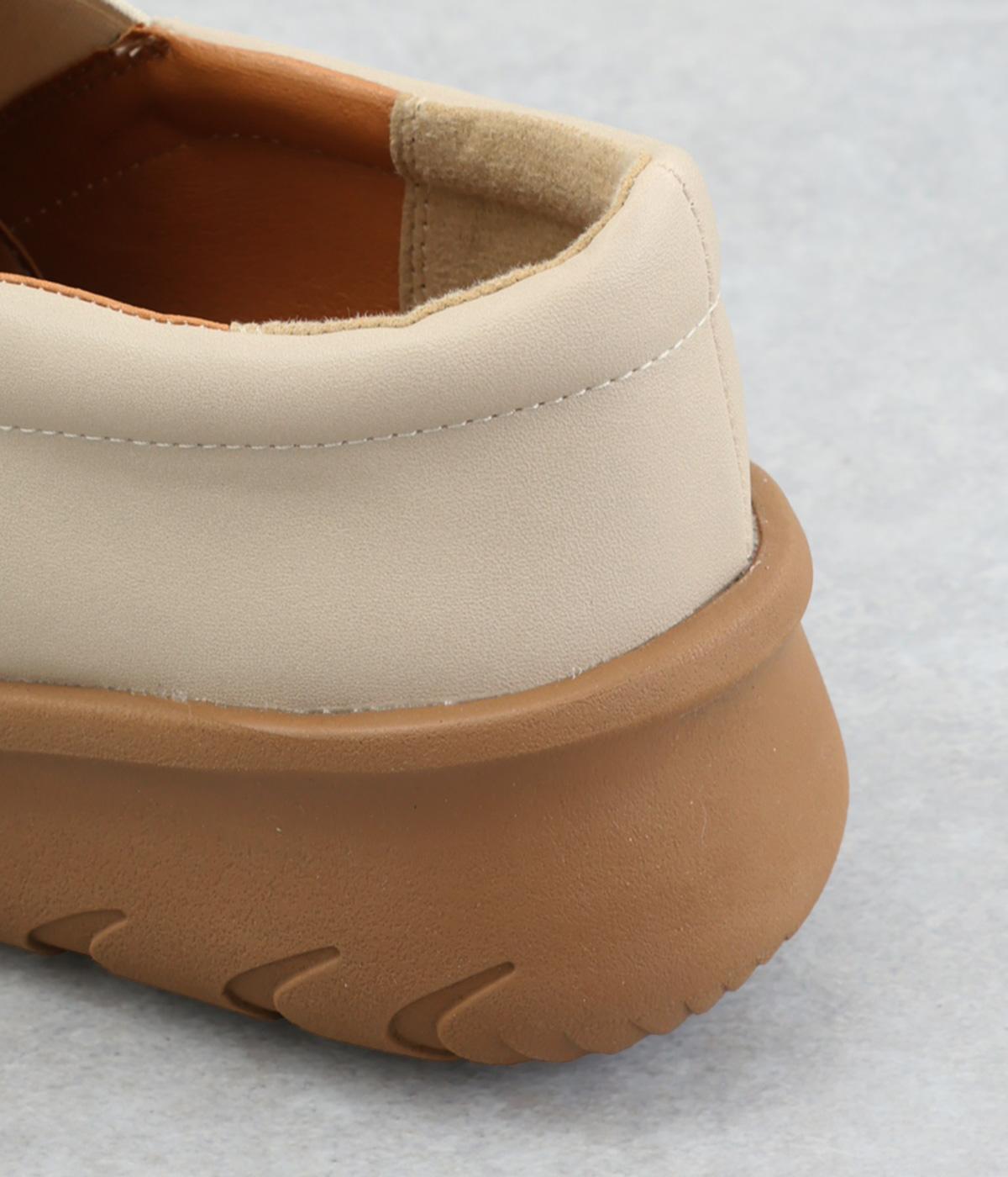 レザーのようなナチュラルで品のいい風合いにイージーケアがうれしい合成皮革をアッパーに採用。やわらかで足にやさしくフィットし、インソールもクッション性があって履き心地◎。