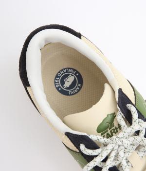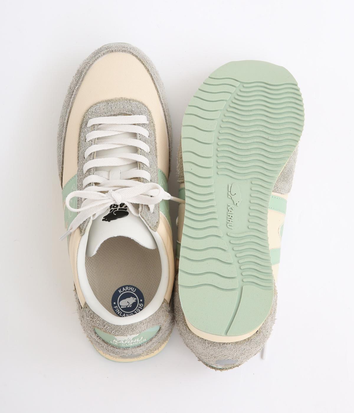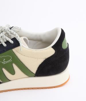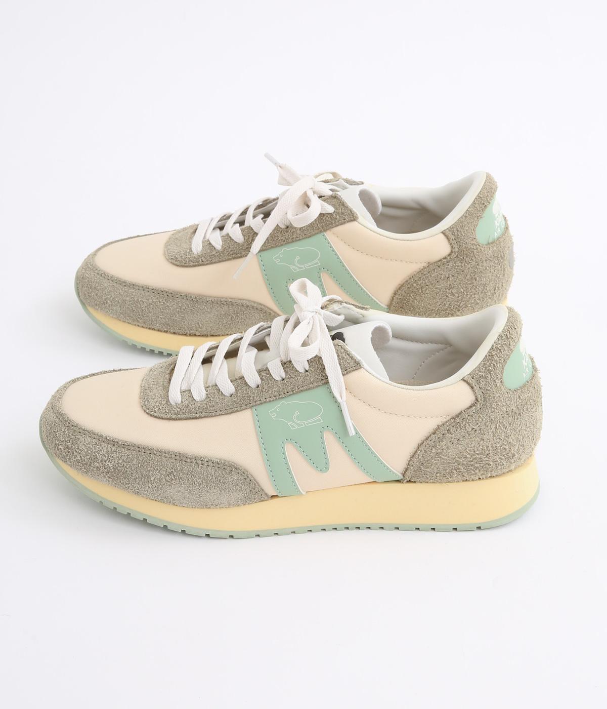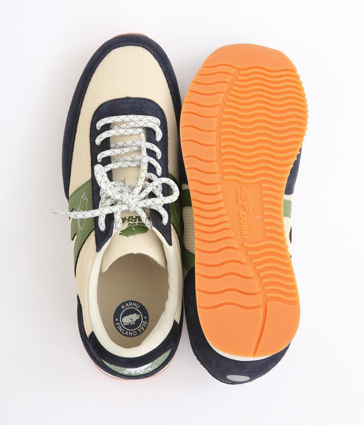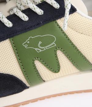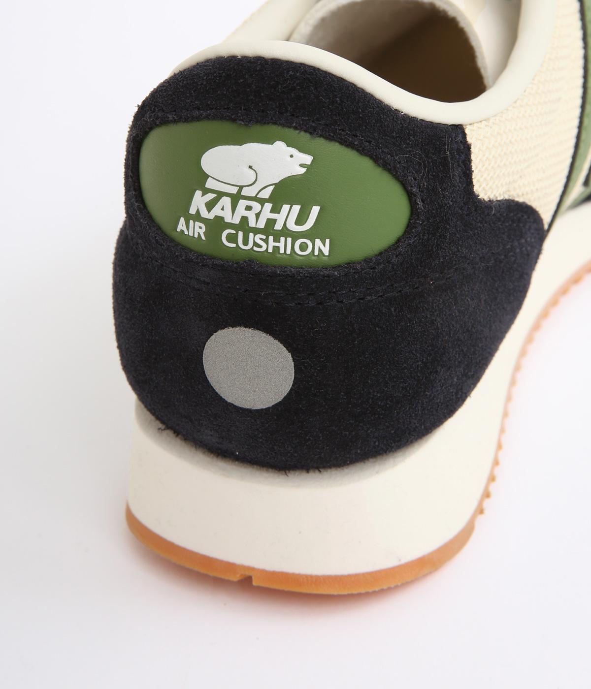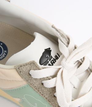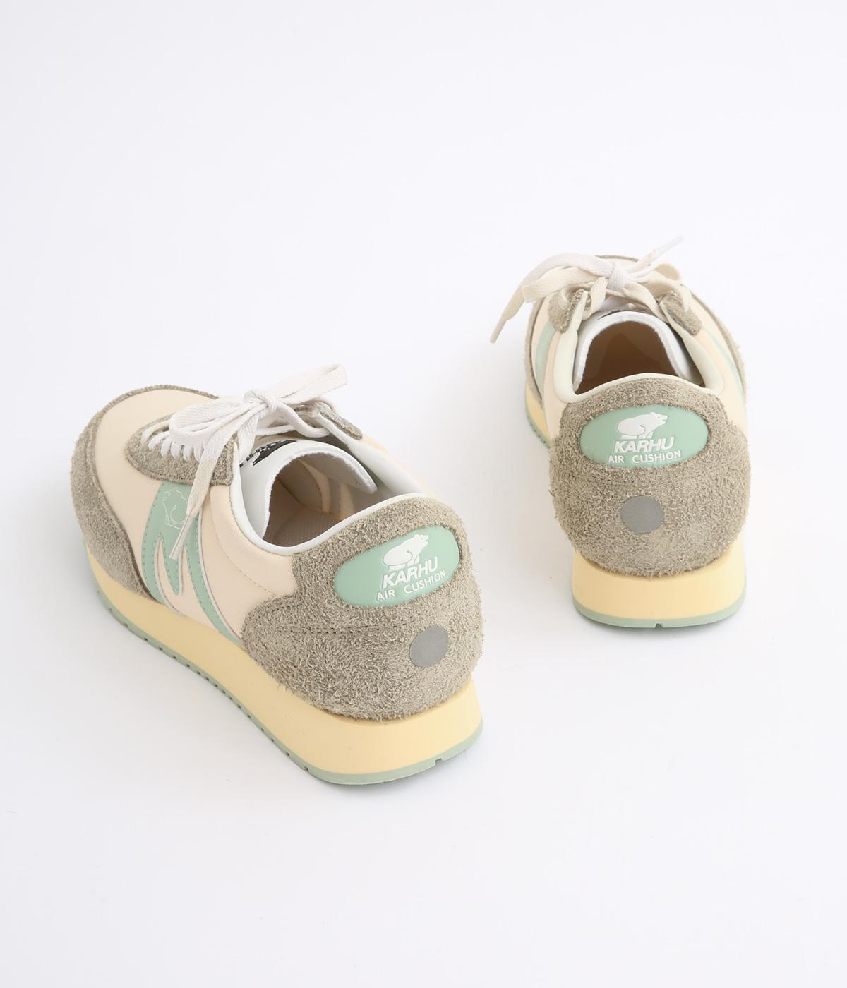 アッパーはスエードと通気性のあるメッシュを組み合わせたコンビ素材。合成皮革のMロゴが落ち着いた大人の印象を添え、アーチサポートやエアークッション入りミッドソールで安心した履き心地を叶えます。
