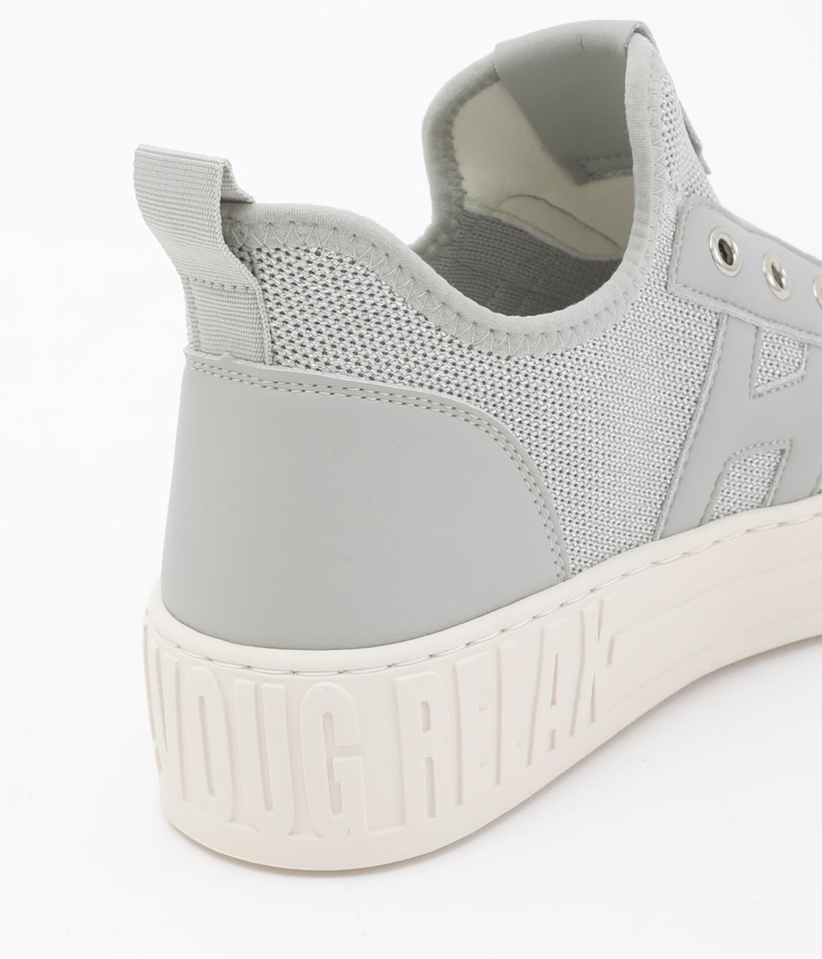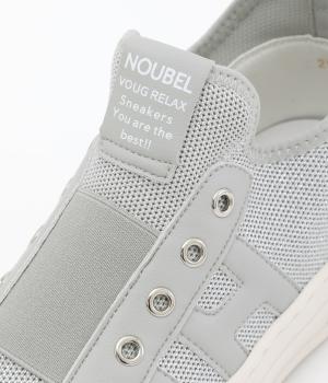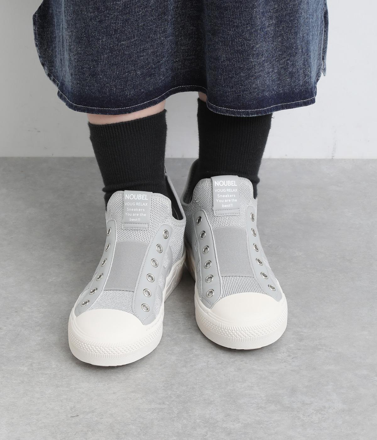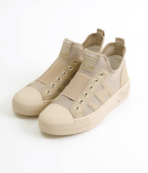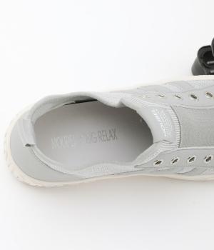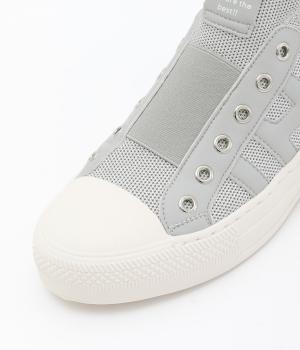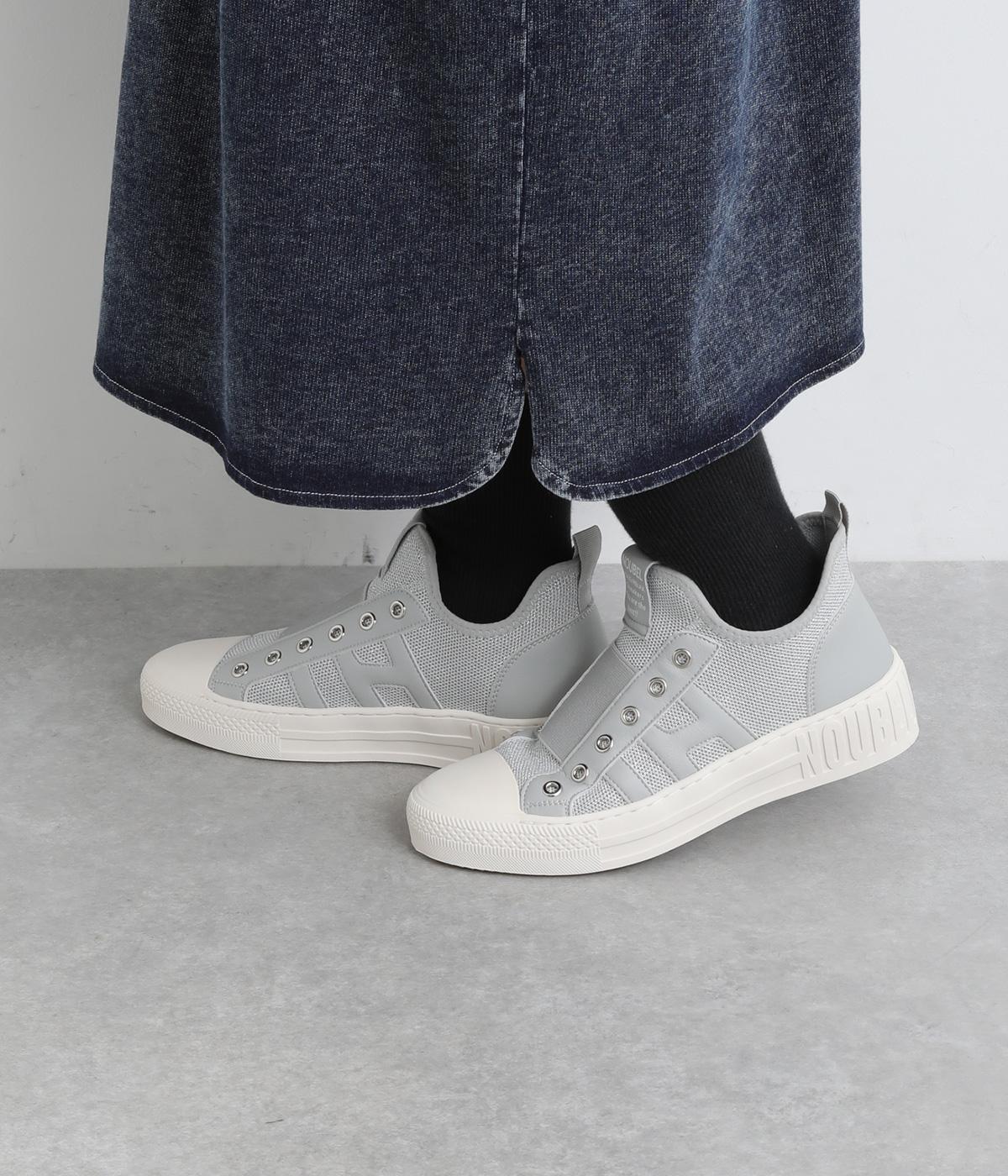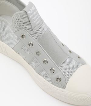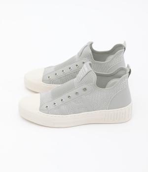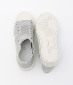 通気性のよいニット素材でストレスフリーながら、牛革パーツがほどよいホールド感を与え、安心の履き心地です。甲部分には紐の代わりにゴムをほどこし、着脱がイージーです。
