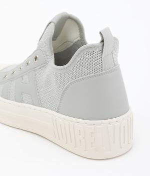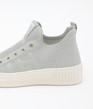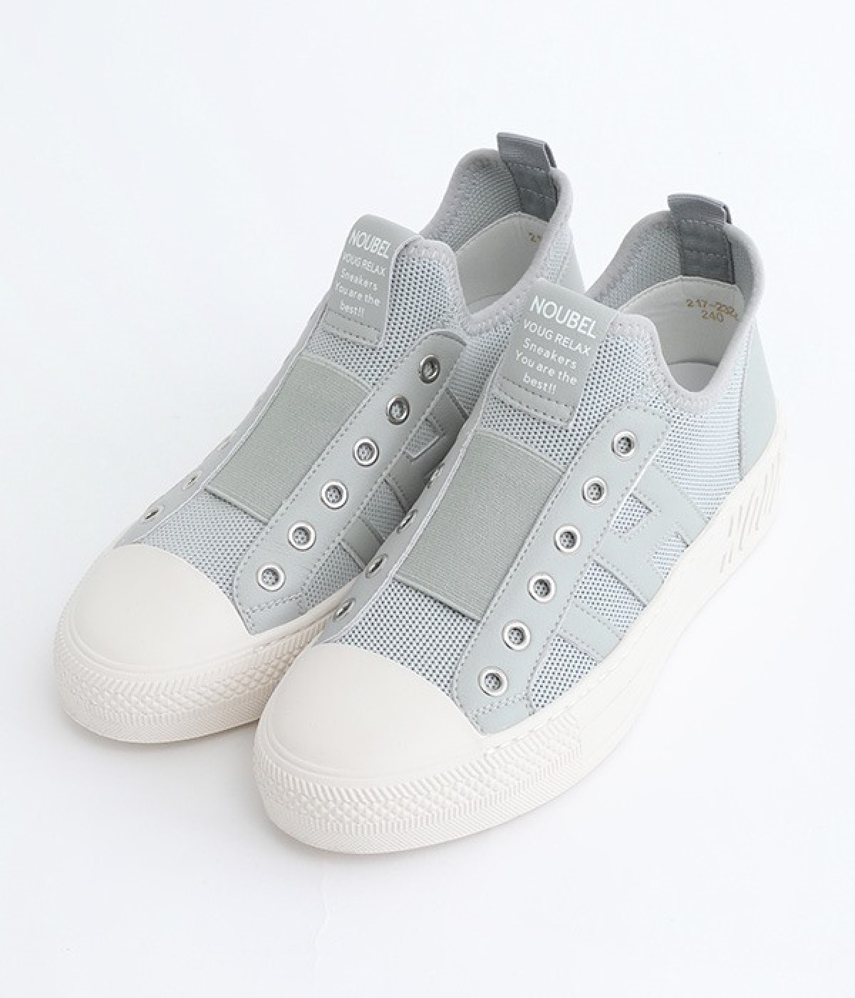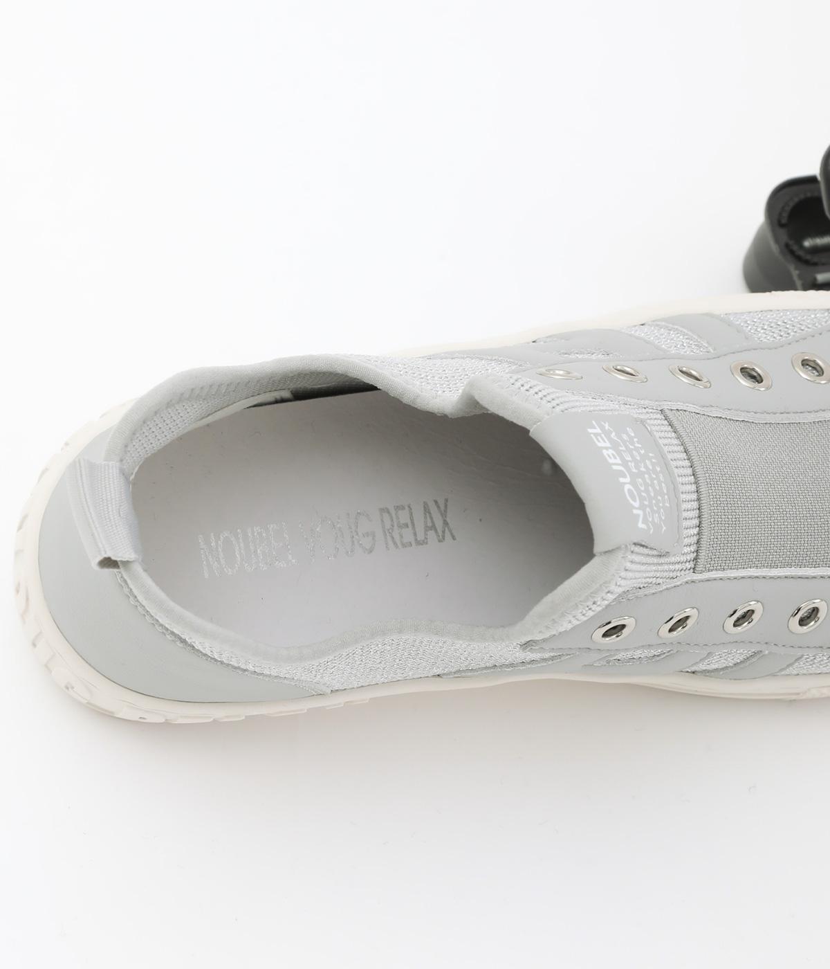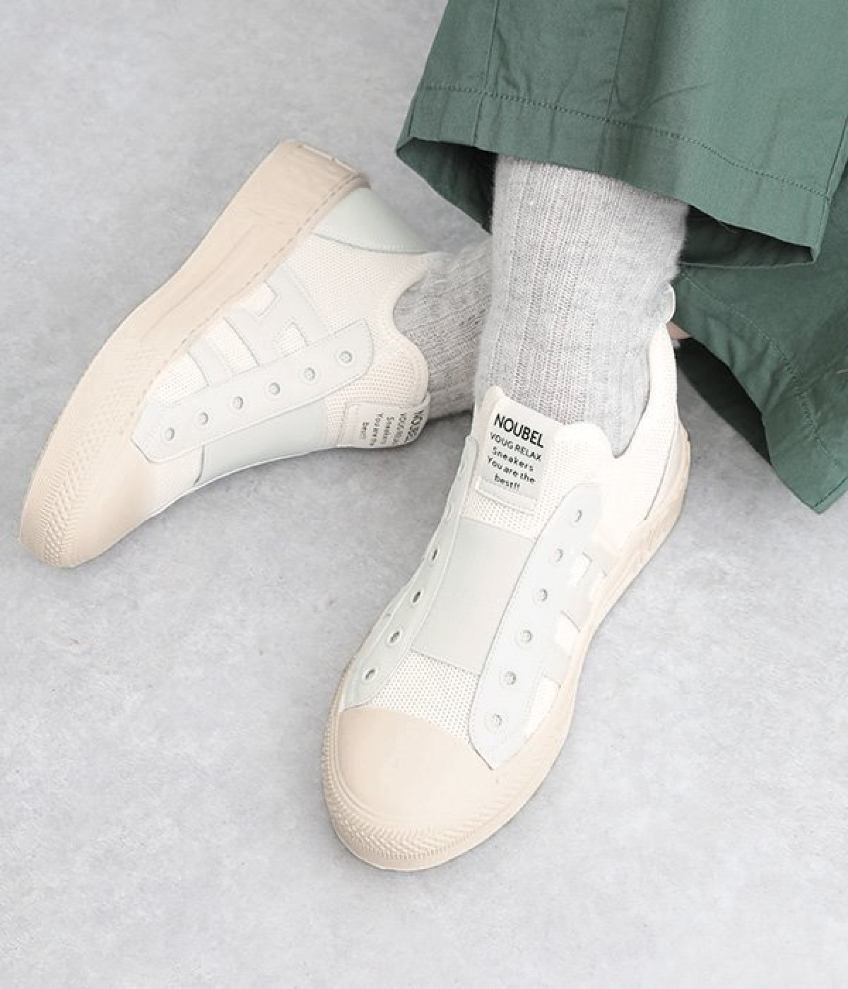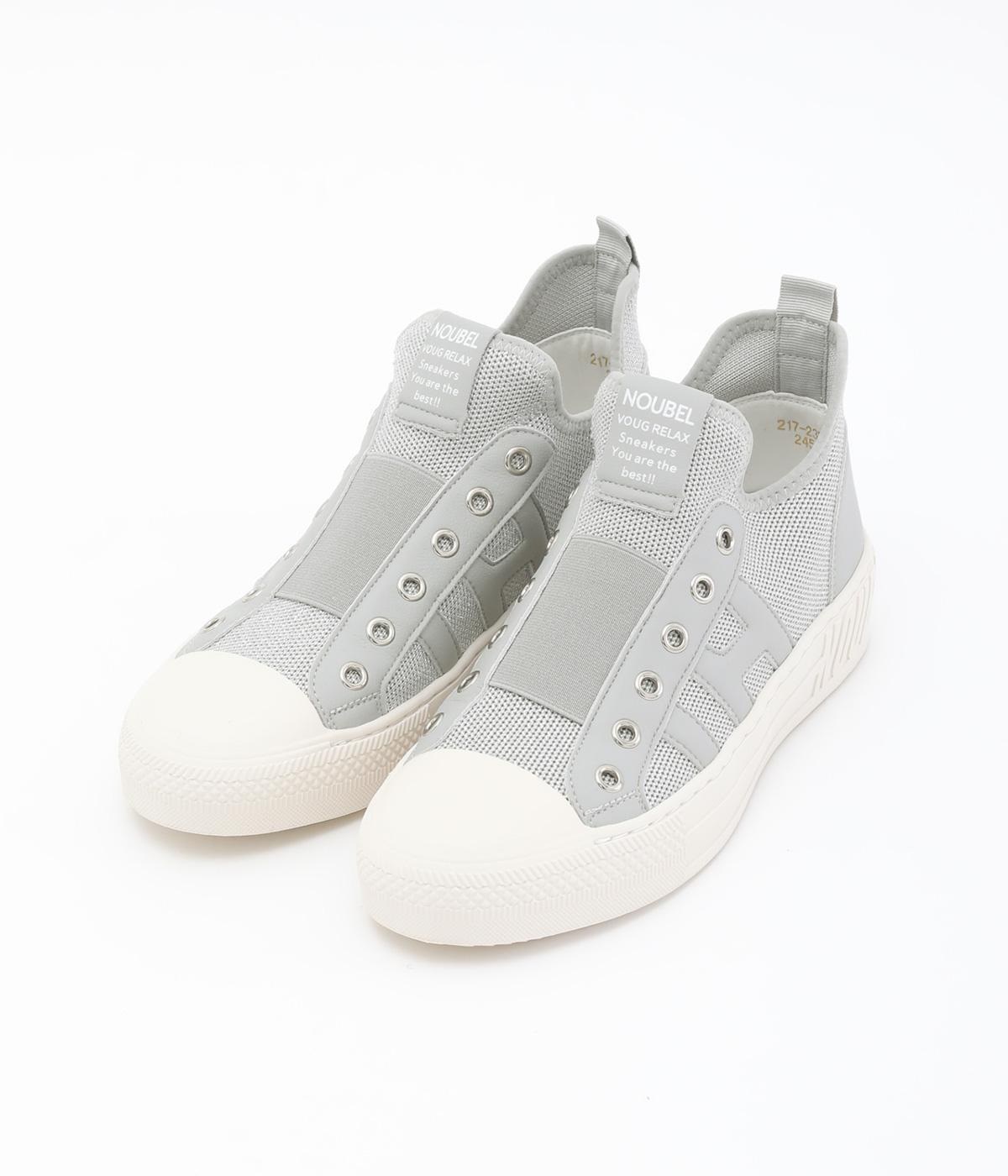 通気性のよいニット素材でストレスフリーながら、牛革パーツがほどよいホールド感を与え、安心の履き心地です。甲部分には紐の代わりにゴムをほどこし、着脱がイージーです。