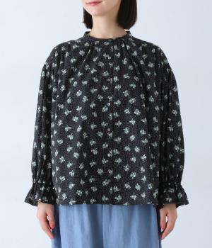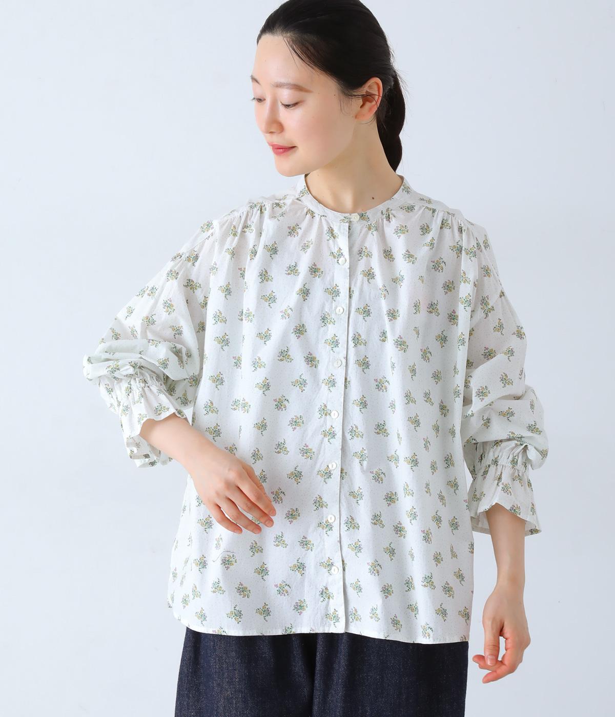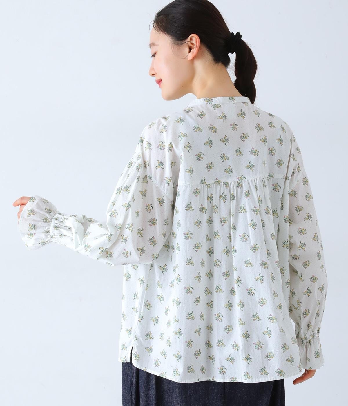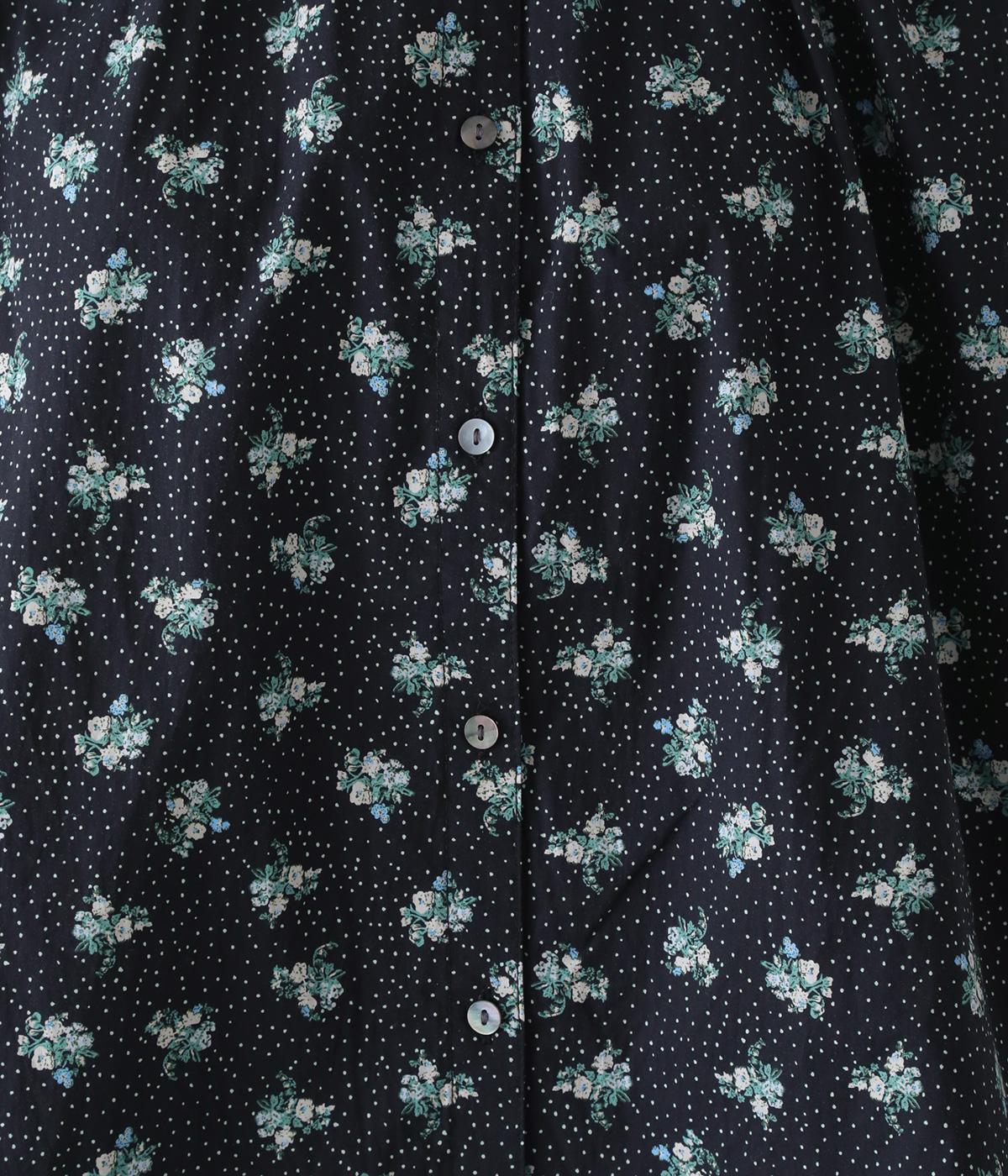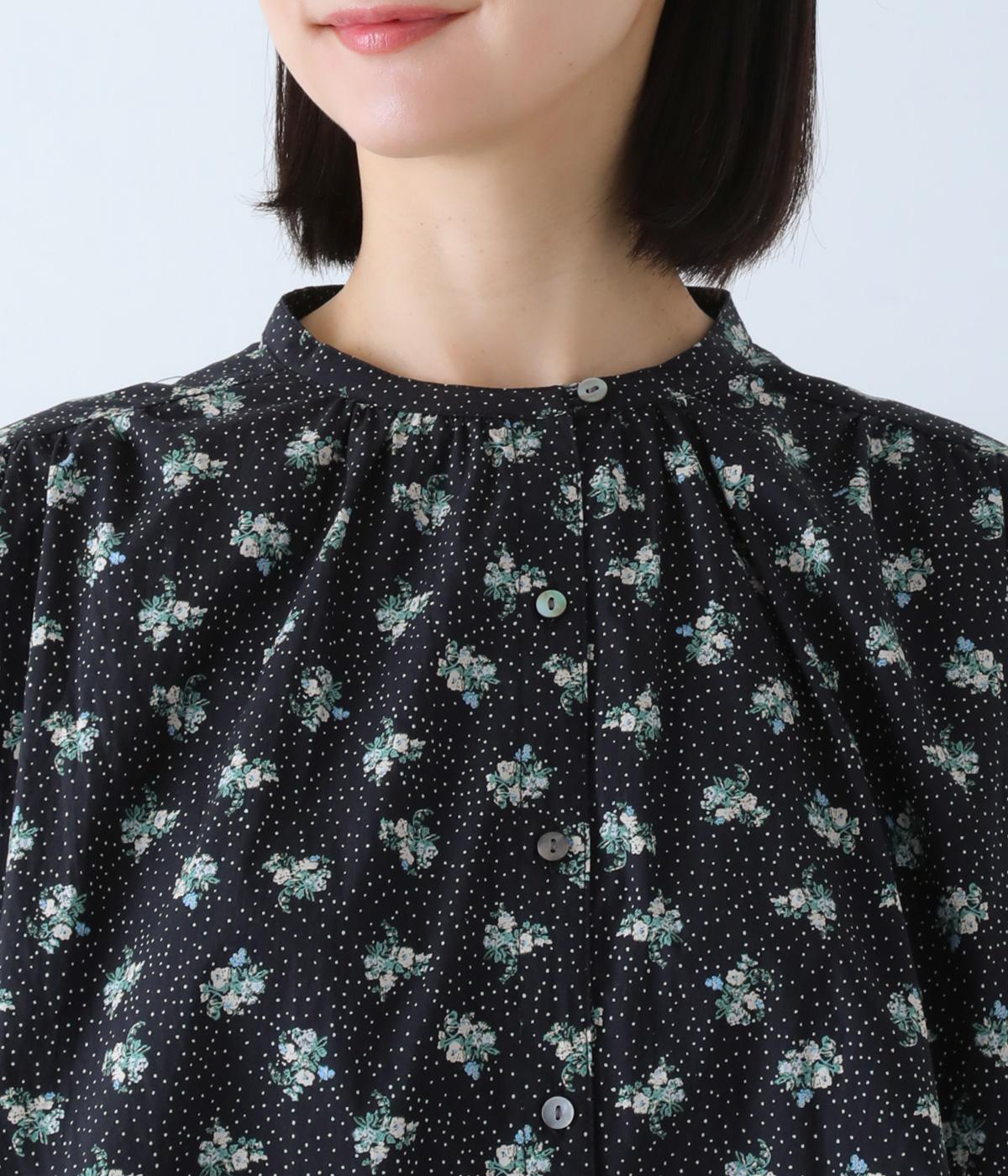 フラワー×ピンドット柄のナチュラルなプリントが特徴のブラウス。背面ヨークにはギャザーを施し、ゆったりと着用できるシルエットに。袖口のキャンディスリーブと第一ボタンのループ仕様が、さりげない可愛らしさをプラスしてくれます。